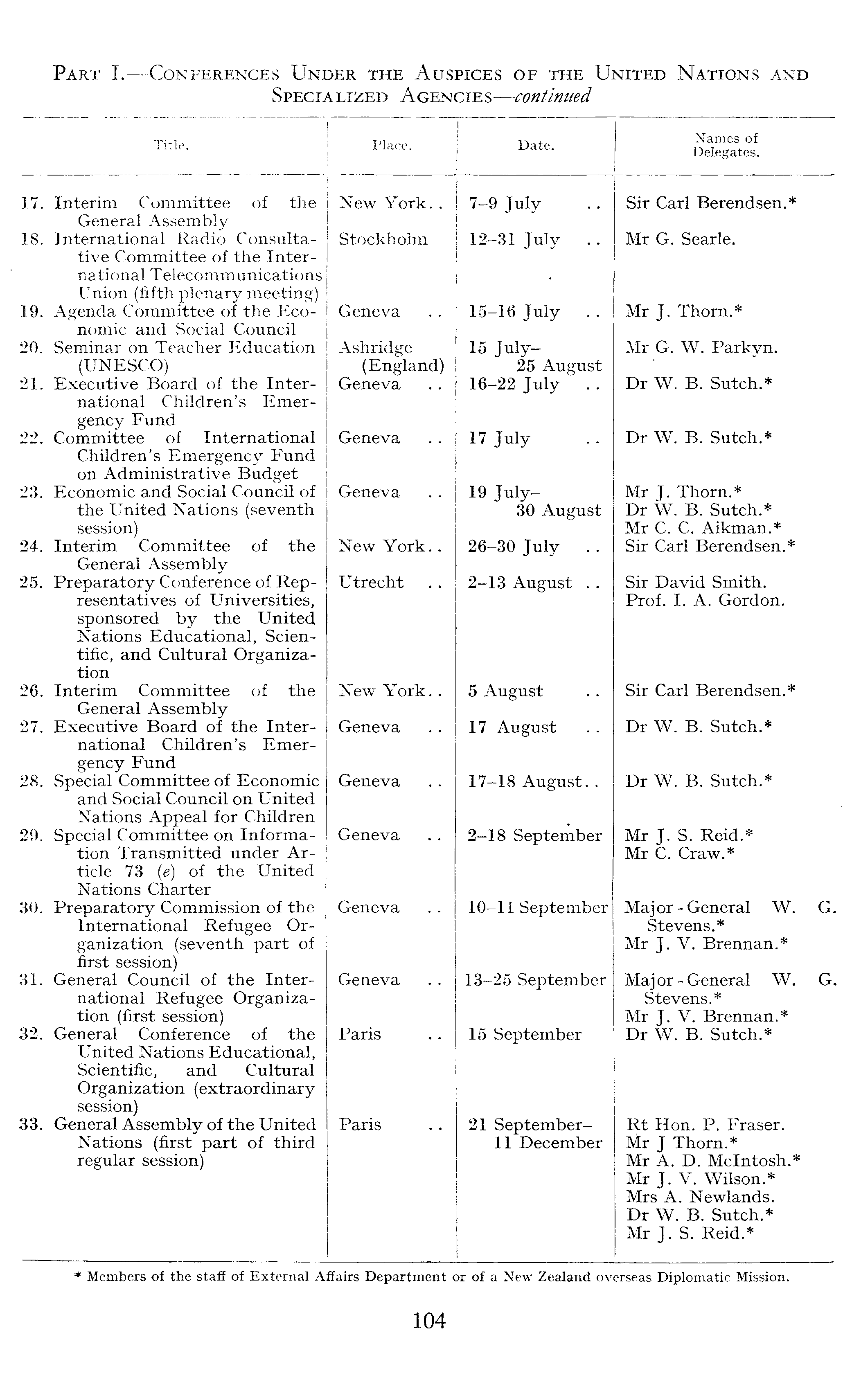 Title. Place. Date. Names of Delegates. 17. Interim Committee of the New York. . 7-9 July Sir Carl Berendsen.* General Assembly 18. International Radio ConsultaStockholm 12-31 July .. Mr G. Searle. tive Committee of the International Telecommunications Union (fifth plenary meeting) 19. Agenda Committee of the EcoGeneva 15-16 July Mr J. Thorn.* nomic and Social Council 20. Seminar on Teacher Education Ashridge 15 JulyMr G. W. Parkyn. (UNESCO) (England) 25 August 21. Executive Board of the InterGeneva 16-22 July . . Dr W. B. Sutch.* national Children's Emergency Fund 22. Committee of International Geneva 17 July Dr W. B. Sutch.* Children's Emergency Fund on Administrative Budget 23. Economic and Social Council of Geneva 19 JulyMr J. Thorn.* the United Nations (seventh 30 August Dr W. B. Sutch.* session) Mr C. C. Aikman.* 24. Interim Committee of the New York. . 26-30 July . . Sir Carl Berendsen.* General Assembly 25. Preparatory Conference of RepUtrecht 2-13 August . . Sir David Smith. resentatives of Universities, Prof. I. A. Gordon. sponsored by the United Nations Educational, Scientific, and Cultural Organization 26. Interim Committee of the New York.. 5 August Sir Carl Berendsen.* General Assembly 27. Executive Board of the InterGeneva 17 August Dr W. B. Sutch.* national Children's Emergency Fund 28. Special Committee of Economic Geneva 17-18 August. . Dr W. B. Sutch.* and Social Council on United Nations Appeal for Children 29. Special Committee on InformaGeneva 2-18 September Mr J. S. Reid.* tion Transmitted under ArMr C. Craw.* ticle 73 (e) of the United Nations Charter 30. Preparatory Commission of the Geneva 10-11 September Major-General W. G, International Refugee OrStevens.* ganization (seventh part of Mr J. V. Brennan.* first session) 31. General Council of the InterGeneva 13-25 September Major-General W. G national Refugee OrganizaStevens.* tion (first session) Mr J. V. Brennan.* 32. General Conference of the Paris 15 September Dr W. B. Sutch.* United Nations Educational, Scientific, and Cultural Organization (extraordinary session) 33. General Assembly of the United Paris 21 SeptemberRt Hon. P. Fraser. Nations (first part of third 11 December Mr J Thorn.* regular session) Mr A. D. Mcintosh.* Mr J. V. Wilson.* Mrs A. Newlands. Dr W. B. Sutch.* Mr J. S. Reid.* * Members of the staff of External Affairs Department or of a New Zealand overseas Diplomatic Mission.