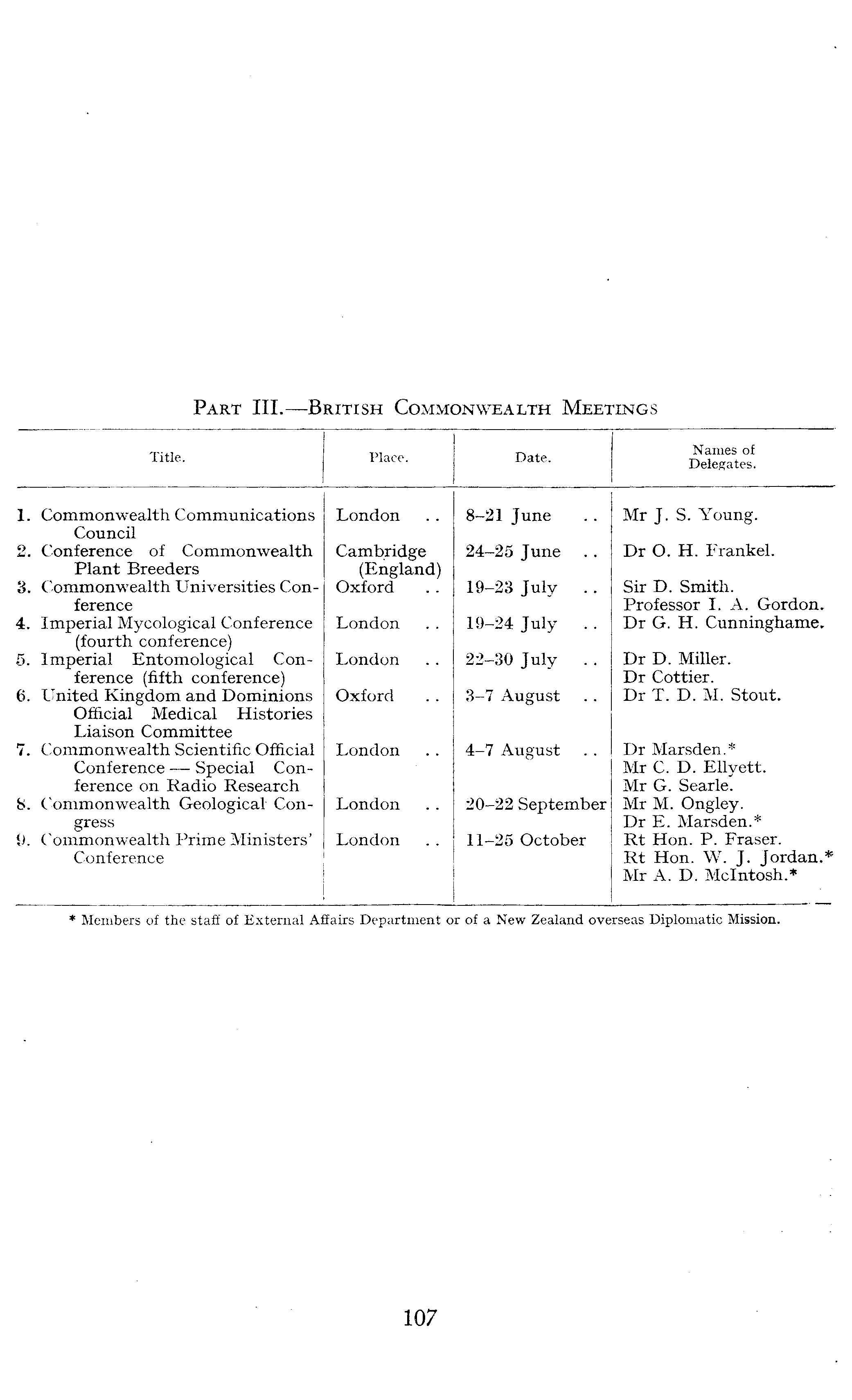 Title. Place. Date. Names of Delegates. 1. Commonwealth Communications London 8-21 June Mr J. S. Young. Council 2. Conference of Commonwealth Cambridge 24-25 June Dr O. H. Frankel. Plant Breeders (England) 3. Commonwealth Universities ConOxford 19-23 July .. Sir D. Smith. ference Professor I. A. Gordon. 4. Imperial Mycological Conference London 19-24 July .. Dr G. H. Cunninghame. (fourth conference) 5. Imperial Entomological ConLondon 22-30 July . . Dr D. Miller. ference (fifth conference) Dr Cottier. 6. United Kingdom and Dominions Oxford 3-7 August . . Dr T. D. M. Stout. Official Medical Histories Liaison Committee 7. Commonwealth Scientific Official London 4-7 August Dr Marsden.* Conference — Special ConMr C. D. Ellyett. ference on Radio Research Mr G. Searle. 8. Commonwealth Geological' ConLondon 20-22 September Mr M. Ongley. gress Dr E. Marsden.* 9. Commonwealth Prime Ministers' London 11-25 October Rt Hon. P. Fraser. Conference Rt Hon. W. J. Jordan.* Mr A. D. Mcintosh.* * Members of the staff of External Affairs Department or of a New Zealand overseas Diplomatic Mission.