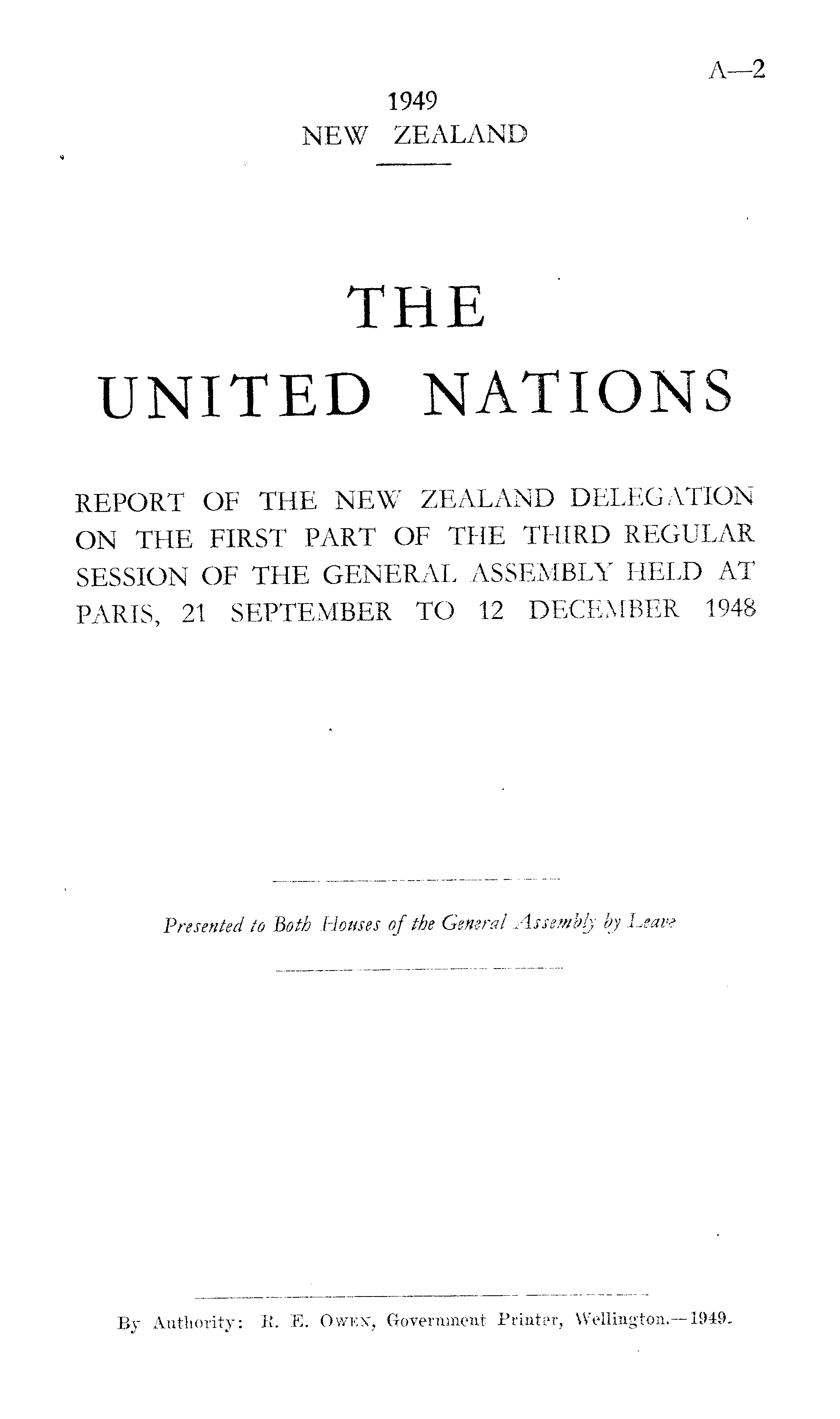 THE UNITED NATIONS REPORT OF THE NEW ZEALAND DELEGATION ON THE FIRST PART OF THE THIRD REGULAR SESSION OF THE GENERAL ASSEMBLY HELD AT PARIS, 21 SEPTEMBER TO 12 DECEMBER 1948