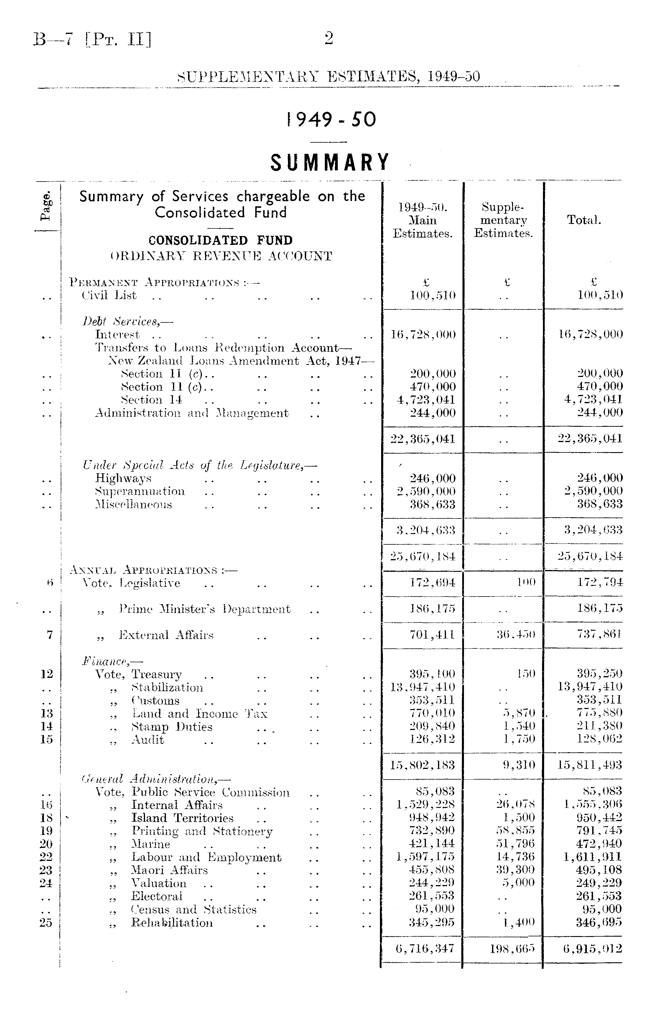 6 3 P4 Summary of Services chargeable on the Consolidated Fund CONSOLIDATED FUND ORDINARY REVENUE ACCOUNT 1949-50. Main Estimates. Supplementary Estimates. Total. Permanent Appropriations :— Civil List £ 100,510 £ £ 100,510 * " Debt Services,- — Interest Transfers to Loans Redemption Account— New Zealand Loans Amendment Act, 1947 — Section 11 (c).. Section 11(c).. Section 14 Administration and Management 16,728,000 200,000 470,000 4,723,041 244,000 16,728,000 200,000 470,000 4,723,041 244,000 22,365,041 22,365,041 Under Special Acts of the Legislature,— Highways Superannuation .. .. .. Miscellaneous 246,000 2,590,000 368,633 246,000 2,590,000 368,633 3,204,633 3,204,633 Annual Appropriations :— Vote, Legislative 25,670,184 25,670,184 6 172,694 100 172,794 „ Prime Minister's Department 186,175 186,175 7 „ External Affairs 701,411 36,450 737,861 12 13 14 15 Finance, — Vote, Treasury .. .. .. ,, Stabilization „ Customs „ Land and Income Tax „ Stamp Duties ... „ Audit 395,100 13,947,410 353,511 770,010 209,840 126,312 150 5,870 1,540 1,750 395,250 13,947,410 353,511 775,880 211,380 128,062 General Administration, —• Vote, Public Service Commission „ Internal Affairs ,, Island Territories „ Printing and Stationery „ Marine „ Labour and Employment „ Maori Affairs ,, Valuation „ Electoral „ Census and Statistics „ Rehabilitation 15,802,183 9,310 15,811,493 ie 18 19 20 22 23 24 25 85,083 1,529,228 948,942 732,890 421,144 1,597,175 455,808 244,229 261,553 ' 95,000 345,295 26,078 1,500 58,855 51,796 14,736 39,300 5,000 i,400 85,083 1,555,306 950,442 791,745 472,940 1,611,911 495,108 249,229 261,553 95,000 346,695 i 6,716,347 198,665 6,915,012
