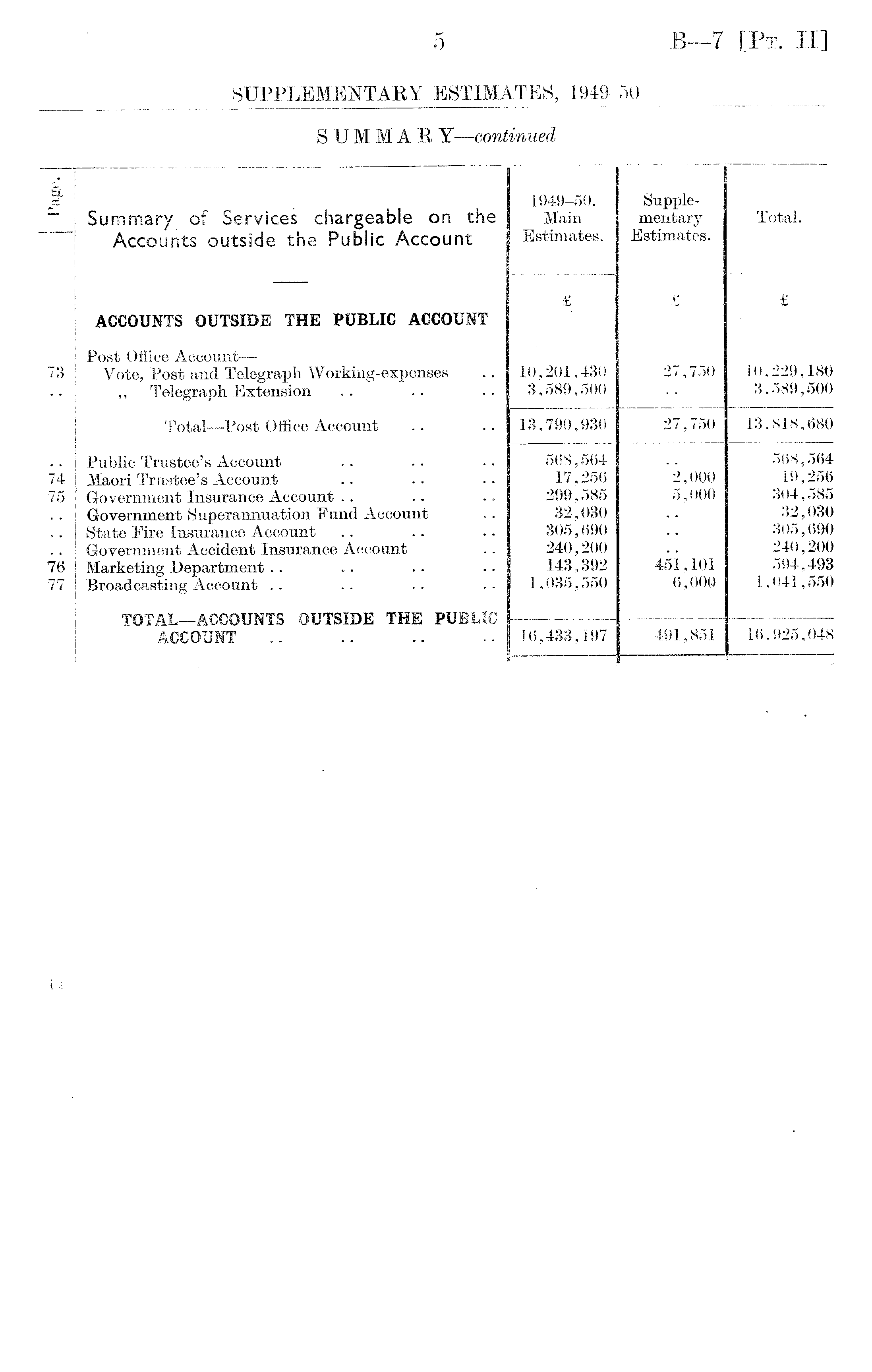 Page. Summary of Services chargeable on the Accounts outside the Public Account 1949-50. Main Estimates.. Supplementary Estimates. Total. ACCOUNTS OUTSIDE THE PUBLIC ACCOUNT £ £ £ 73 Post Office Account — Vote, Post and Telegraph Working-expenses „ Telegraph Extension 10,201,430 3,589,500 27,750 10,229,180 3,589,500 Total—Post Office Account 13,790,930 27,750 13,818,680 74 75 76 77 Public Trustee's Account Maori Trustee's Account Government Insurance Account Government Superannuation Fund Account State Fire Insurance Account Government Accident Insurance Account Marketing Department Broadcasting Account 568,564 17,256 299,585 32,030 305,690 240,200 143,392 1,035,550 2,000 5,000 45i,101 6,000 568,564 19,256 304,585 32,030 305,690 240,200 594,493 1,041,550 TOTAL—ACCOUNTS OUTSIDE THE PUBLIC ACCOUNT | 16,433,197 491,851 16,925,048 » *