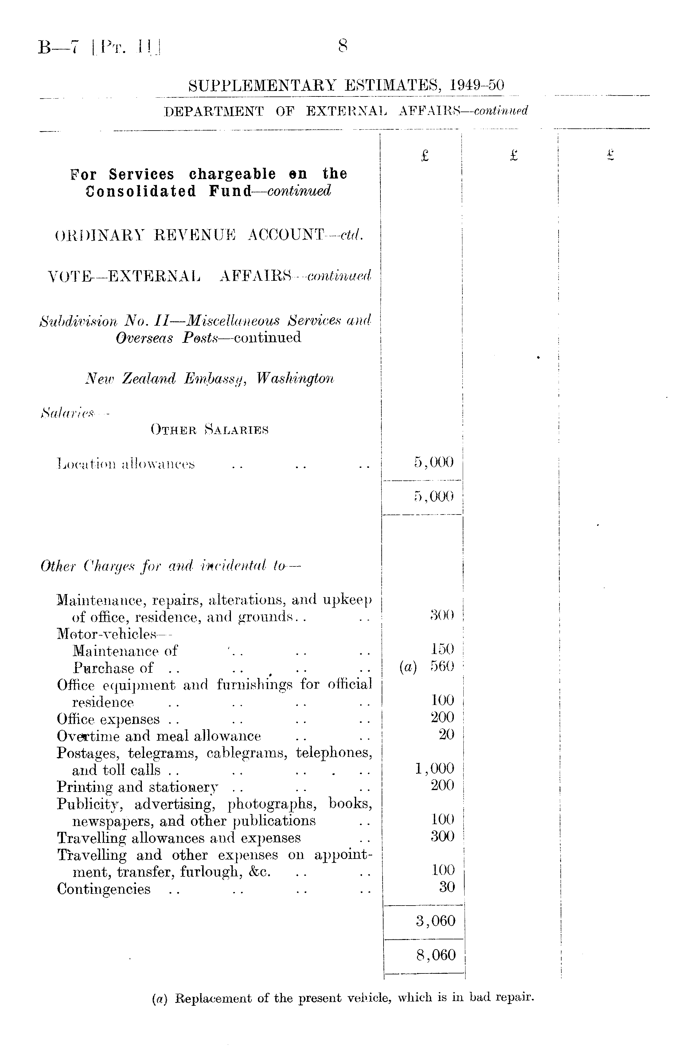 For Services chargeable en the Consolidated Fund—continued £ £ £ ORDINARY REVENUE ACCOUNT —ctd. VOTE —EXTERNAL AFFAIRS—continued Subdivision No. II —Miscellaneous Services and Overseas Pests —continued New Zealand Embassy, Washington Salaries — Other Salaries Location allowances .. 5,000 5,000 Other Charges for and incidental to — Maintenance, repairs, alterations, and upkeep of office, residence, and grounds Motor-vehicles — Maintenance of Purchase of .. Office equipment and furnishings for official residence Office expenses Overtime and meal allowance Postages, telegrams, cablegrams, telephones, and toll calls .. . . Printing and stationery Publicity, advertising, photographs, books, newspapers, and other publications Travelling allowances and expenses Travelling and other expenses on appointment, transfer, furlough, &c. Contingencies 300 150 (a) 560 100 200 20 1,000 200 100 300 100 30 1 3,060 8,060 1 i (a) Replacement of the present vehicle, which is in bad repair.