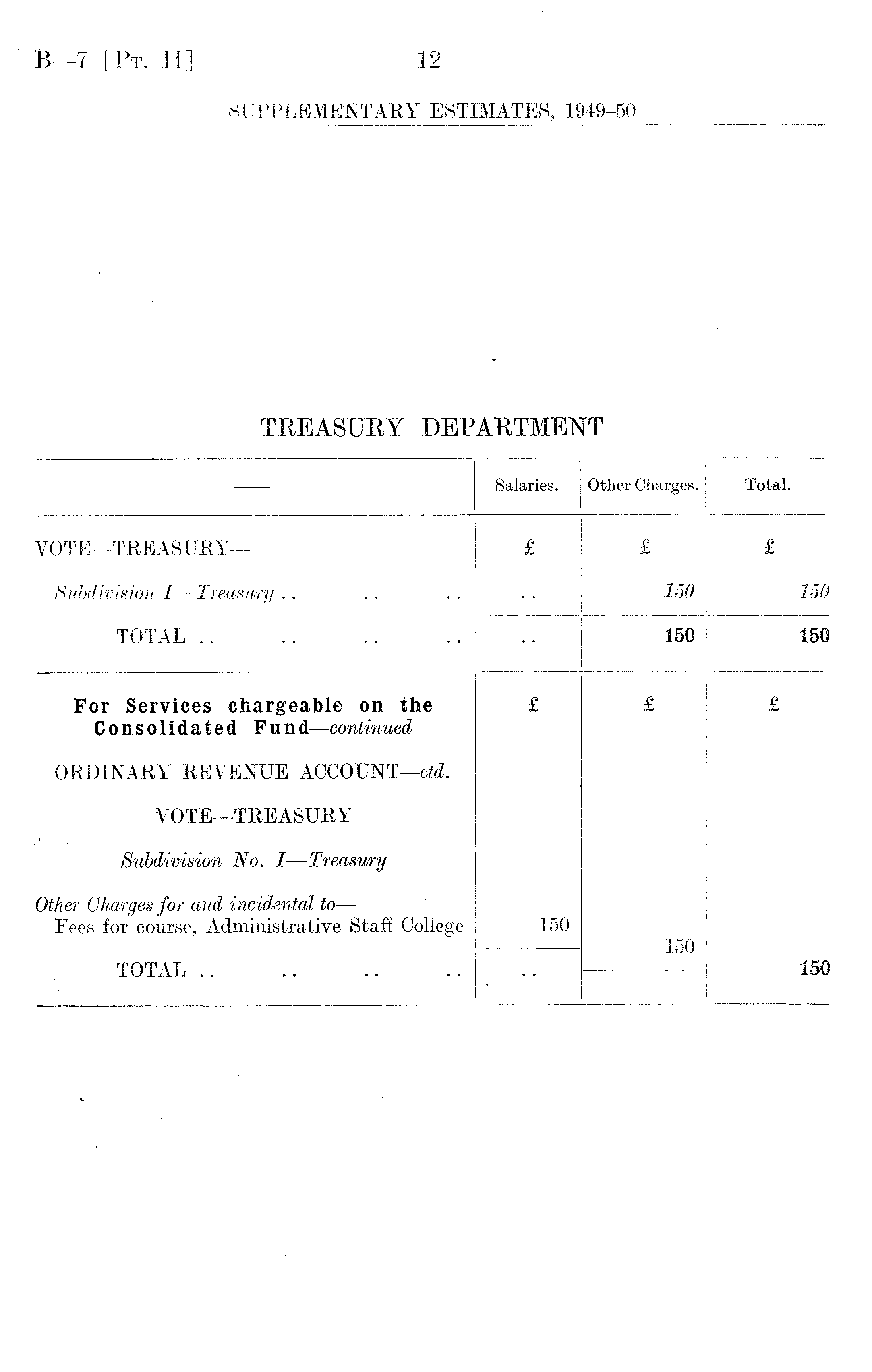 —rSalaries. Other Charges. Total. VOTE—TREASURY— £ £ £ Subdivision I—Treasury .. .. 150 150 TOTAL .. 150 i | 150 For Services chargeable on the Consolidated Fund —continued £ £ £ ORDINARY REVENUE ACCOUNT—ctd. VOTE—TREASURY Subdivision No. 1—Treasury Other Charges for and incidental to — Fees for course, Administrative Staff College 150 150 , TOTAL .. 150 !