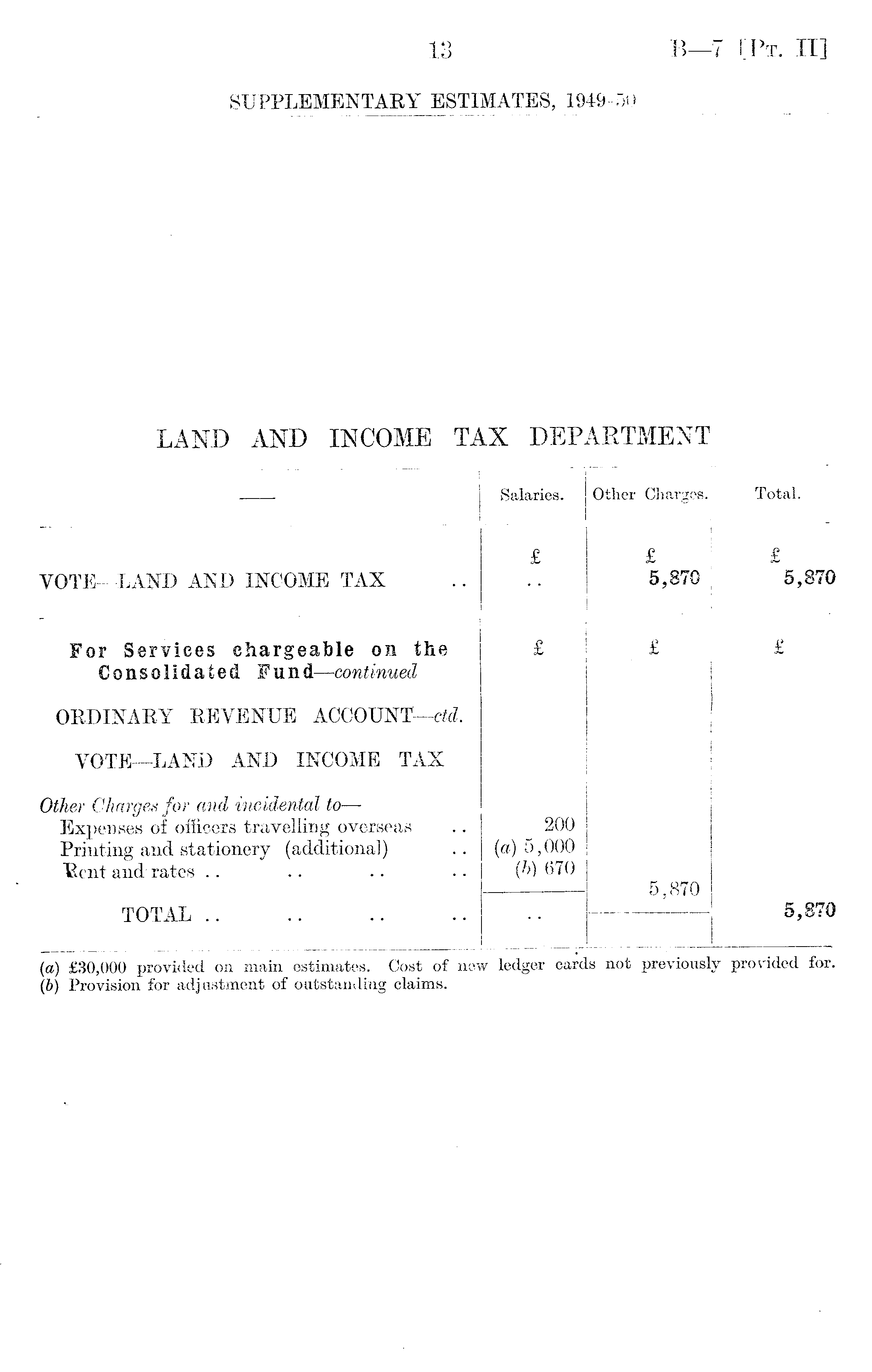 — Salaries. Other Charges.! Total. VOTE—LAND AND INCOME TAX £ £ 5,870 ; 1 £ 5,870 For Services chargeable on the Consolidated Fund —continued £ £ £ ORDINARY REVENUE ACCOUNT —ctd. " 1 VOTE—LAND AND INCOME TAX Other Charges for and incidental to — Expenses of officers travelling overseas Printing and stationery (additional) "Bent and rates 200 (a) 5,000 (b) 670 5,870 TOTAL .. 5,870
