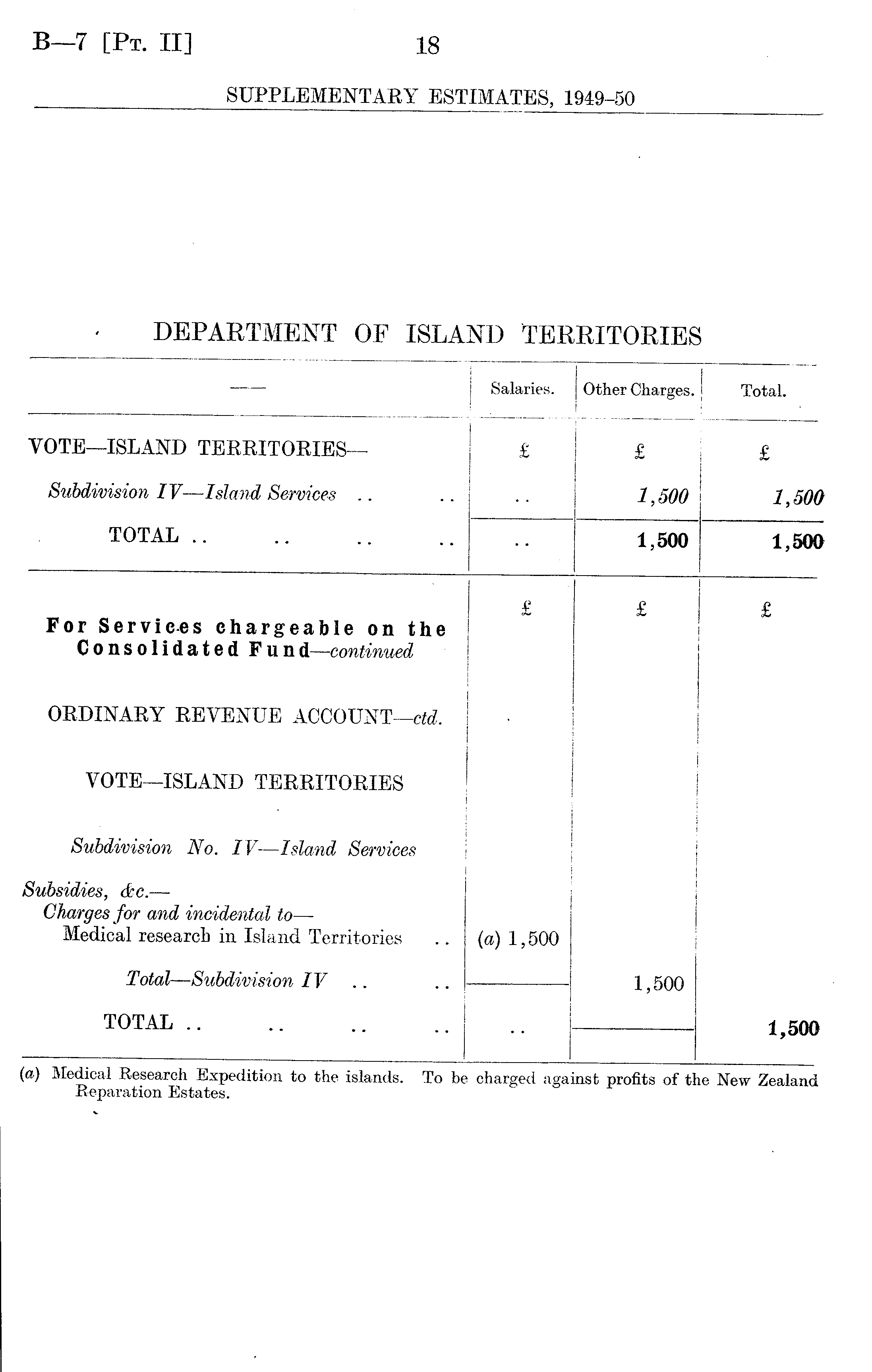 Salaries. Other Charges. J Total. VOTE—ISLAND TERRITORIES— £ £ £ Subdivision IV —Island Services 1,500 1,500 TOTAL .. 1,500 1,500 For Services chargeable on the Consolidated Fund—continued £ £ £ ORDINARY REVENUE ACCOUNT—ctd. VOTE—ISLAND TERRITORIES • ' Subdivision No. IV—Island Services Subsidies, &c. — Charges for and incidental to— Medical research in Island Territories (a) 1,500 Total—Subdivision IV TOTAL .. 1,500 1,500