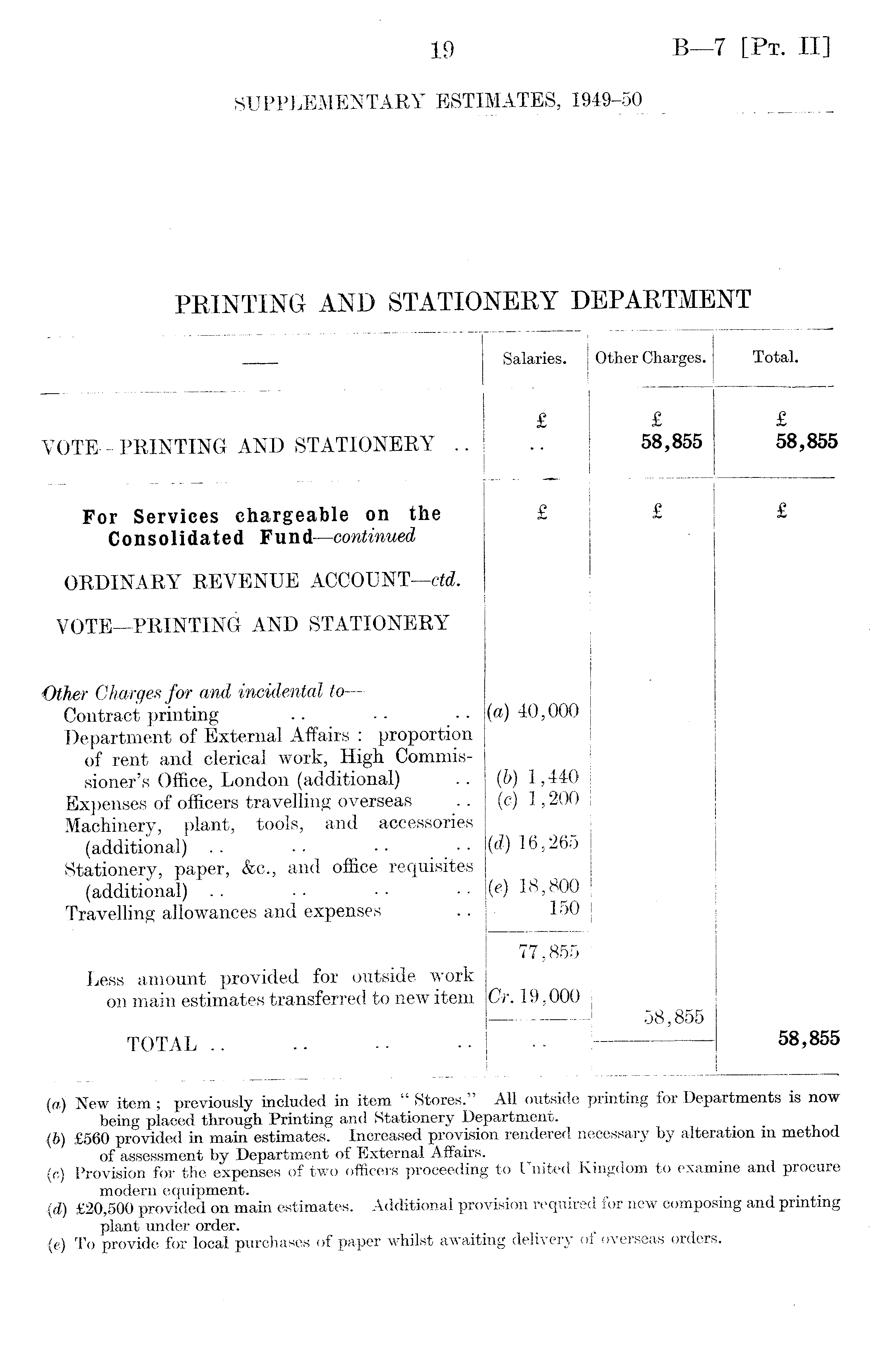 Salaries. Other Charges. Total. VOTE—PRINTING AND STATIONERY .. £ £ 58,855 £ 58,855 For Services chargeable on the Consolidated Fund —continued £ £ £ ORDINARY REVENUE ACCOUNT —ctd. VOTE—PRINTING AND STATIONERY Other Charges for and incidental to — Contract printing Department of External Affairs : proportion of rent and clerical work, High Commissioner's Office, London (additional) Expenses of officers travelling overseas Machinery, plant, tools, and accessories (additional) .. ■ • • - Stationery, paper, &c., and office requisites (additional) Travelling allowances and expenses (a) 40,000 (b) 1,440 (c) 1,200 (d) 16,265 (e) 18,800 150 Less amount provided for outside work on main estimates transferred to new item 77,855 Cr. 19,000 58,855 TOTAL .. 58,855