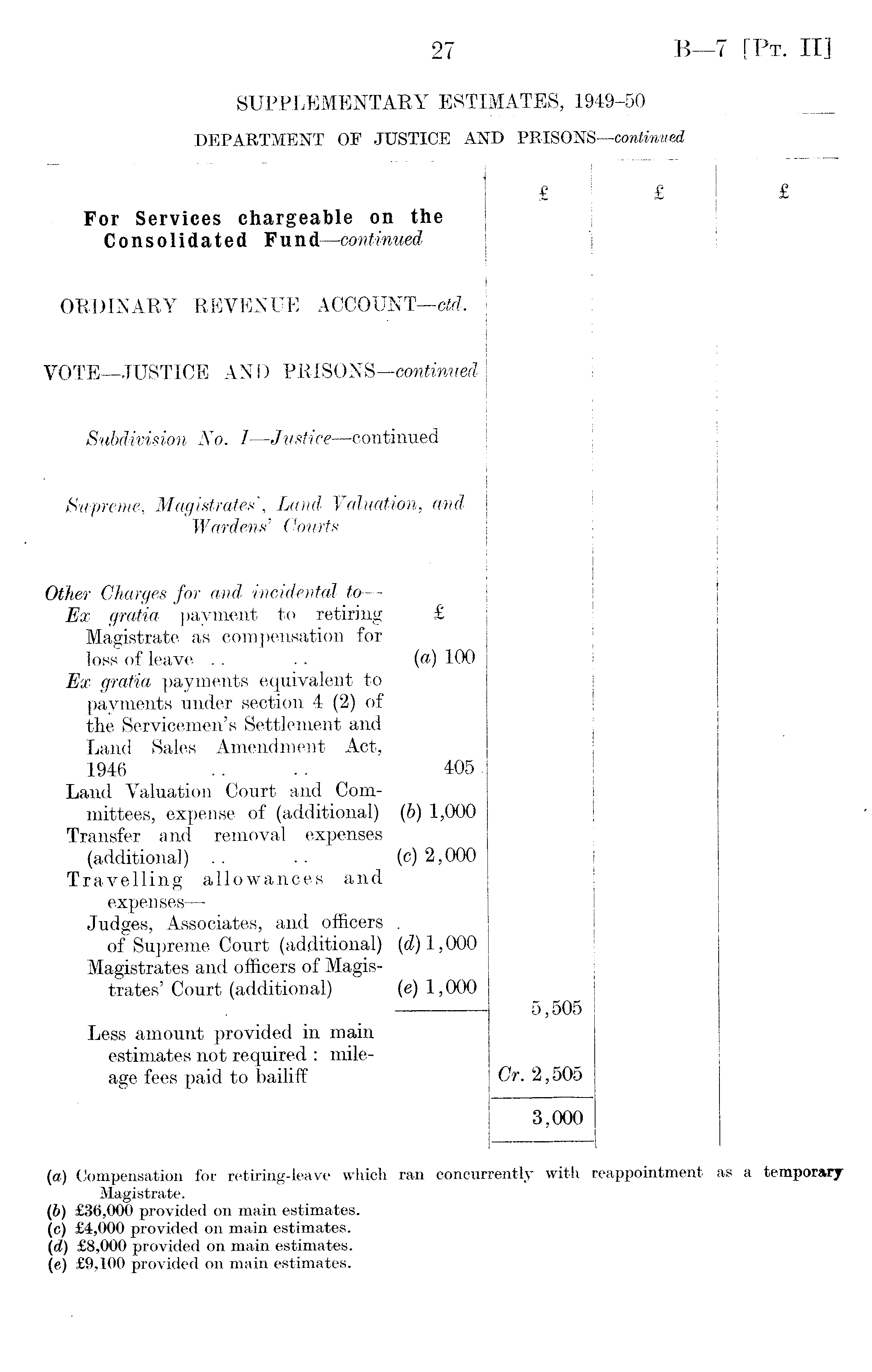 (а) Compensation for retiring-leave which ran concurrently with reappointment as a temporary Magistrate. (б) £36,000 provided on main estimates. (c) £4,000 provided on main estimates. (d) £B,OOO provided on main estimates. (e) £9,100 provided on main estimates.