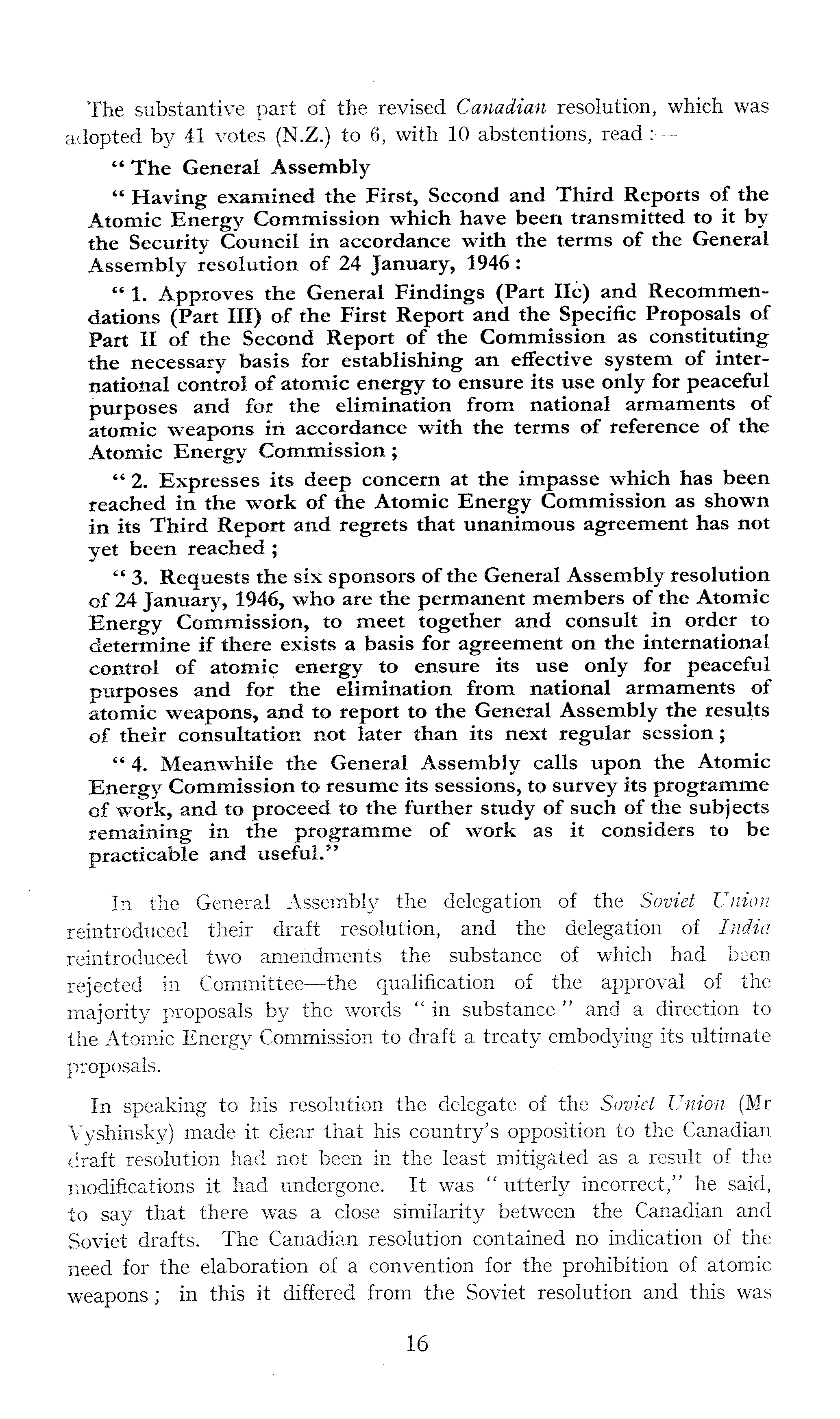 The substantive part of the revised Canadian resolution, which was adopted by 4-1 votes (N.Z.) to 6, with 10 abstentions, read : " The General Assembly " Having examined the First, Second and Third Reports of the Atomic Energy Commission which have been transmitted to it by the Security Council in accordance with the terms of the General Assembly resolution of 24 January, 1946: " 1. Approves the General Findings (Part He) and Recommendations (Part III) of the First Report and the Specific Proposals of Part II of the Second Report of the Commission as constituting the necessary basis for establishing an effective system of international control of atomic energy to ensure its use only for peaceful purposes and for the elimination from national armaments of atomic weapons in accordance with the terms of reference of the Atomic Energy Commission; " 2. Expresses its deep concern at the impasse which has been reached in the work of the Atomic Energy Commission as shown in its Third Report and regrets that unanimous agreement has not yet been reached; " 3. Requests the six sponsors of the General Assembly resolution of 24 January, 1946, who are the permanent members of the Atomic Energy Commission, to meet together and consult in order to determine if there exists a basis for agreement on the international control of atomic energy to ensure its use only for peaceful purposes and for the elimination from national armaments of atomic weapons, and to report to the General Assembly the results of their consultation not later than its next regular session; "4. Meanwhile the General Assembly calls upon the Atomic Energy Commission to resume its sessions, to survey its programme of work, and to proceed to the further study of such of the subjects remaining in the programme of work as it considers to be practicable and useful." In the General Assembly the delegation of the Soviet Union reintroduced their draft resolution, and the delegation of India reintroduced two amendments the substance of which had been rejected in Committee —the qualification of the approval of the majority proposals by the words " in substance " and a direction to the Atomic Energy Commission to draft a treaty embodying its ultimate proposals. In speaking to his resolution the delegate of the Soviet Union (Mr Vyshinsky) made it clear that his country's opposition to the Canadian draft resolution had not been in the least mitigated as a result of the modifications it had undergone. It was " utterly incorrect/' he said, to say that there was a close similarity between the Canadian and Soviet drafts. The Canadian resolution contained no indication of the need for the elaboration of a convention for the prohibition of atomic weapons ; in this it differed from the Soviet resolution and this was