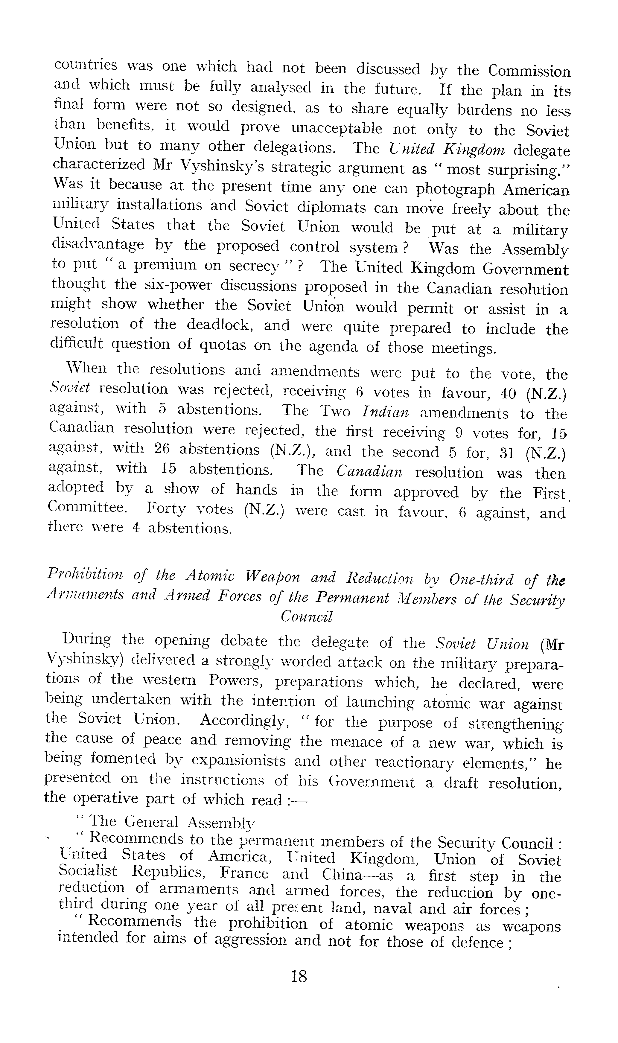 countries was one which had not been discussed by the Commission and which must be fully analysed in the future. If the plan in its final form were not so designed, as to share equally burdens no less than benefits, it would prove unacceptable not only to the Soviet Union but to many other delegations. The United Kingdom delegate characterized Mr Vyshinsky's strategic argument as " most surprising." Was it because at the present time any one can photograph American military installations and Soviet diplomats can move freely about the United States that the Soviet Union would be put at a military disadvantage by the proposed control system? Was the Assembly to put " a premium on secrecy " ? The United Kingdom Government thought the six-power discussions proposed in the Canadian resolution might show whether the Soviet Union would permit or assist in a resolution of the deadlock, and were quite prepared to include the difficult question of quotas on the agenda of those meetings. When the resolutions and amendments were put to the vote, the Soviet resolution was rejected, receiving 6 votes in favour, 40 (N.Z.) against, with 5 abstentions. The Two Indian amendments to the Canadian resolution were rejected, the first receiving 9 votes for, 15 against, with 26 abstentions (N.Z.), and the second 5 for, 31 (N.Z.) against, with 15 abstentions. The Canadian resolution was then adopted by a show of hands in the form approved by the First Committee. Forty votes (N.Z.) were cast in favour, 6 against, and there were 4 abstentions. Prohibition of the Atomic Weapon and Reduction by One-third of the Armaments and Armed Forces of the Permanent Members of the Security Council During the opening debate the delegate of the Soviet Union (Mr Vyshinsky) delivered a strongly worded attack on the military preparations of the western Powers, preparations which, he declared, were being undertaken with the intention of launching atomic war against the Soviet Union. Accordingly, " for the purpose of strengthening the cause of peace and removing the menace of a new war, which is being fomented by expansionists and other reactionary elements," he presented on the instructions of his Government a draft resolution, the operative part of which read : '■' The General Assembly " Recommends to the permanent members of the Security Council • United States of America, United Kingdom, Union of Soviet Socialist Republics, France and China—as a first step in the reduction of armaments and armed forces, the reduction by onethird during one year of all present land, naval and air forces; " Recommends the prohibition of atomic weapons as weapons intended for aims of aggression and not for those of defence ;