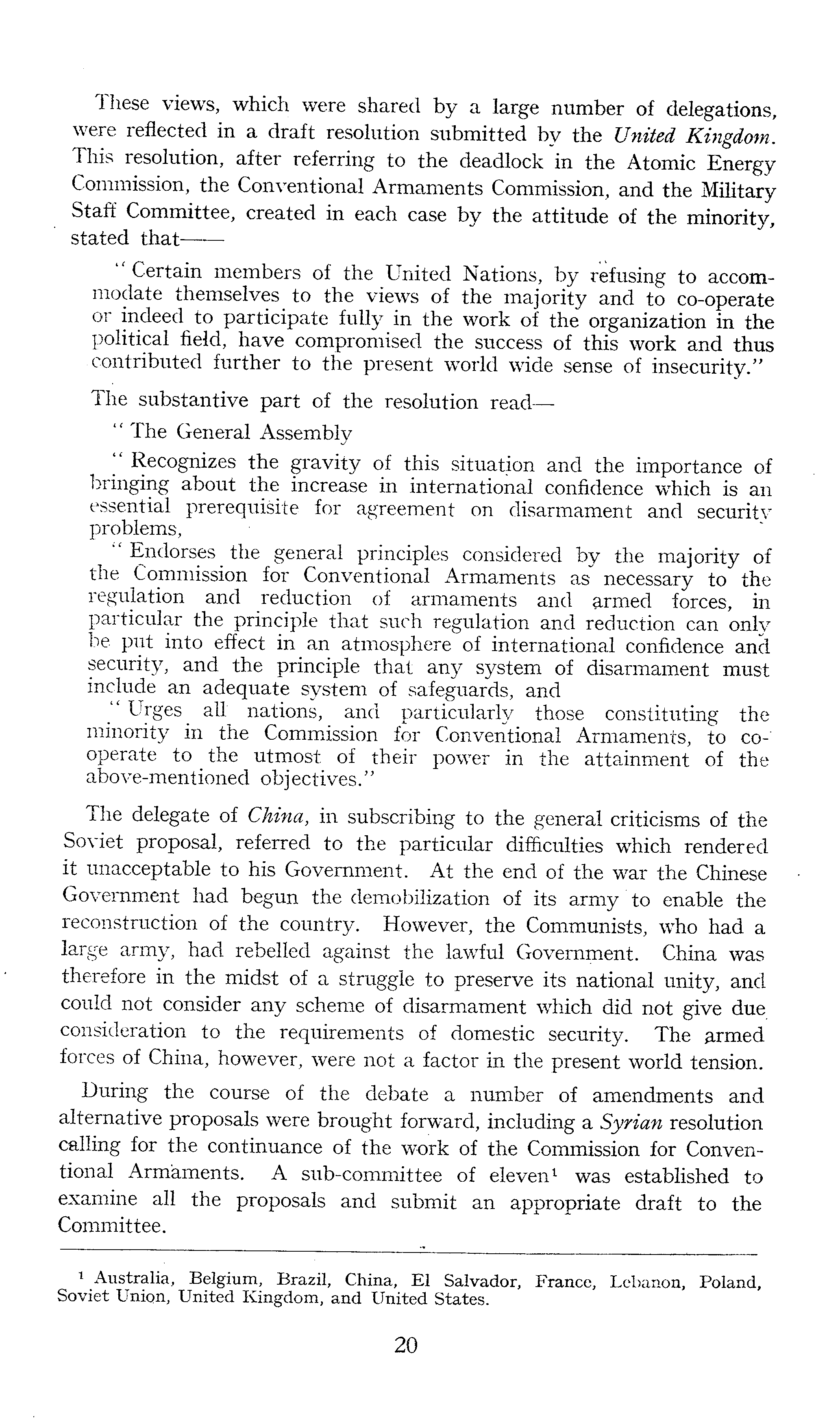 These views, which were shared by a large number of delegations, were reflected in a draft resolution submitted by the United Kingdom. This resolution, after referring to the deadlock in the Atomic Energy Commission, the Conventional Armaments Commission, and the Military Staff Committee, created in each case by the attitude of the minority, stated that —— "Certain members of the United Nations, by refusing to accommodate themselves to the views of the majority and to co-operate or indeed to participate fully in the work of the organization in the political field, have compromised, the success of this work and thus contributed further to the present world wide sense of insecurity." The substantive part of the resolution read — The General Assembly " Recognizes the gravity of this situation and the importance of bringing about the increase in international confidence which is an essential prerequisite for agreement on disarmament and security problems, " Endorses the general principles considered by the majority of the Commission for Conventional Armaments as~ necessary to the regulation and reduction of armaments and armed forces, in particular the principle that such regulation and reduction can only be put into effect in an atmosphere of international confidence and security, and the principle that any system of disarmament must include an adequate system of safeguards, and " Urges _ all nations, and particularly those constituting the minority in the Commission for Conventional Armaments, to co-' operate to the utmost of their power in the attainment of the above-mentioned objectives." The delegate of China, in subscribing to the general criticisms of the Soviet proposal, referred to the particular difficulties which rendered it unacceptable to his Government. At the end of the war the Chinese Government had begun the demobilization of its army to enable the reconstruction of the country. However, the Communists, who had a large army, had rebelled against the lawful Government. China was therefore in the midst of a struggle to preserve its national unity, and could not consider any scheme of disarmament which did not give due consideration to the requirements of domestic security. The armed forces of China, however, were not a factor in the present world tension. During the course of the debate a number of amendments and alternative proposals were brought forward, including a Syrian resolution calling for the continuance of the work of the Commission for Conventional Armaments. A sub-committee of eleven 1 was established to examine all the proposals and submit an appropriate draft to the Committee.