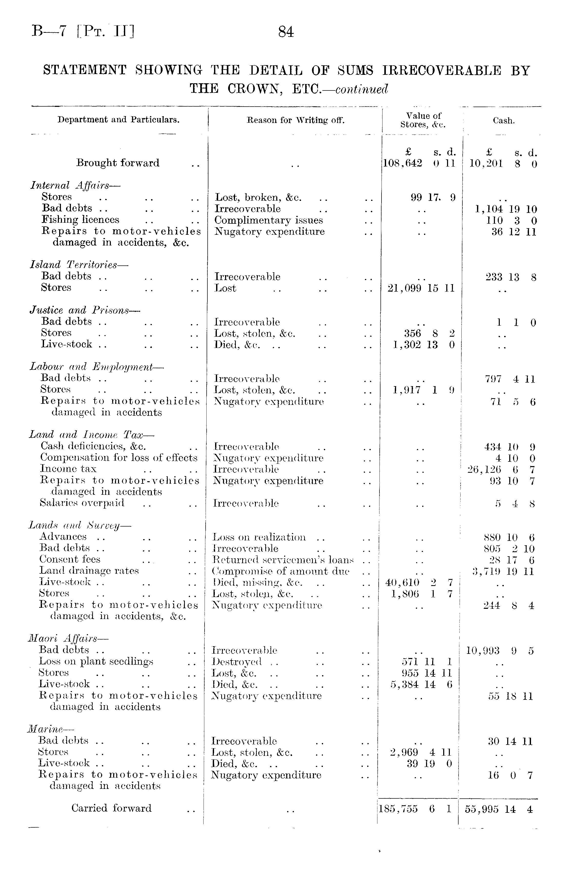 Department and Particulars. Reason for Writing off. Value of Stores, &c. Cash. Brought forward £ s. 108,642 0 d. 11 £ s. 10,201 8 d. 0 Internal Affairs — Stores Bad debts Fishing licences Repairs to motor-vehicles damaged in accidents, &c. Lost, broken, &c. Irrecoverable Complimentary issues Nugatory expenditure 99 17. 9 1,104*19 110 3 36 12 10 0 11 Island Territories — Bad debts Stores Irrecoverable Lost 21,099'15 11 233 13 8 Justice and Prisons— Bad debts Stores Live-stock Irrecoverable Lost, stolen, &c. Died, &c. 356 8 1,302 13 2 0 1 1 0 Labour and Employment— Bad debts Stores Repairs to motor-vehicles damaged in accidents Irrecoverable Lost, stolen, &c. .. Nugatory expenditure 1,917 1 9 797 4 71 5 11 6 Land and Income Tax — Cash deficiencies, &c. Compensation for loss of effects Income tax .. Repairs to motor-vehicles .damaged in accidents Salaries overpaid Irrecoverable Nugatory expenditure Irrecoverable .. Nugatory expenditure Irrecoverable 434 10 4 10 26,126 6 93 10 5 4 9 0 7 7 8 Lands and Survey— Advances Bad debts .. ■,.■■■ Consent fees Land drainage rates Live-stock Stores Repairs to motor-vehicles damaged in accidents, &c. Loss on realization Irrecoverable Returned servicemen's loans .. Compromise of amount due Died, missing, &c. Lost, stolen, &c. Nugatory'' expenditure 40,610 2 1,806 1 7 7 880 10 6 805 2 10 28 17 6 3,719 19 11 244 8 4 Maori Affairs — Bad debts .. Loss on plant seedlings Stores Live-stock Repairs to motor-vehicles damaged in accidents Irrecoverable Destroyed Lost, &c. Died, &c. Nugatory expenditure 571 11 955 14 5,384 14 1 11 6 10,993 9 55 18 5 11 Marine— Bad debts Stores Live-stock Repairs to motor-vehicles damaged in accidents Irrecoverable Lost, stolen, &c. Died, &c. Nugatory expenditure 2,969 4 : 30 19 11 0 30 14 16 0 11 7 Carried forward 185,755 6 1 55,995 14 4