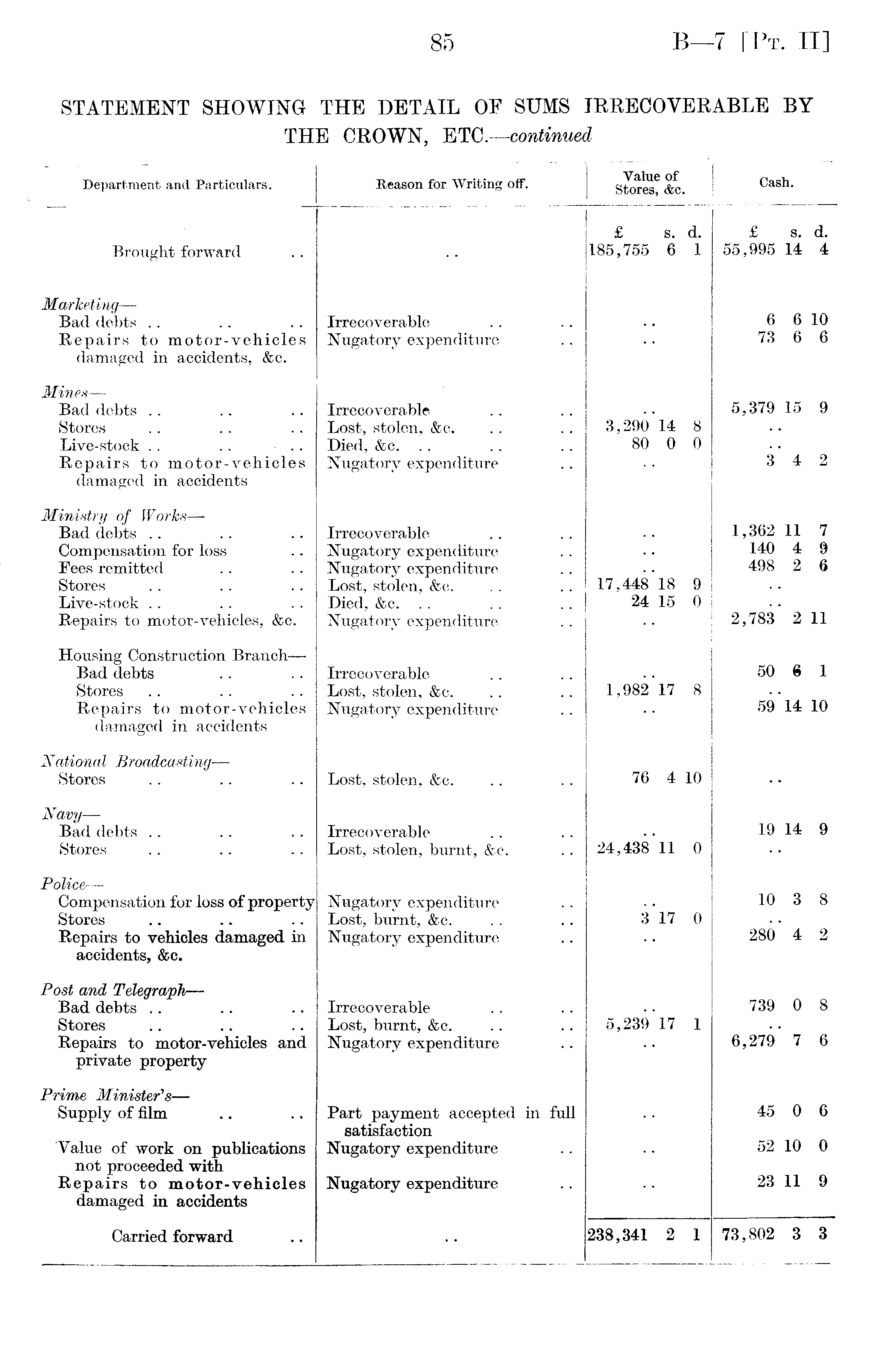 Department and Particulars. Reason for Writing off. Value of Stores, &c. Cash. Brought forward £ s. 185,755 6 d. 1 £ s. 55,995 14 d. 4 Marketing— Bad debts Repairs to motor-vehicles damaged in accidents, &c. Irrecoverable Nugatory expenditure 6 73 6 6 10 6 Mines— Bad debts Stores Live-stock .. .. • .. Repairs to motor-vehicles damaged in accidents Irrecoverable Lost, stolen, &c. Died, &c. Nugatory expenditure 3,290 14 80 0 8 o 5,379 3 15 4 9 2 Ministry of Works — Bad debts Compensation for loss Fees remitted Stores Live-stock Repairs to motor-vehicles, &c. Irrecoverable Nugatory expenditure Nugatory expenditure Lost, stolen, &c. Died, &c. Nugatory expenditure 17,448*18 24 15 9 0 1,362 140 498 2,783' 11 4 2 2 7 9 6 11 Housing Construction Branch— Bad debts Stores Repairs to motor-vehicles damaged in accidents Irrecoverable Lost, stolen, &c. Nugatory expenditure 1,98217 8 50 59' 6 14 1 10 National Broadcasting— Stores Lost, stolen, &c. 76 4 10 Navy— Bad debts Stores Irrecoverable Lost, stolen, burnt, &c. 24,438'11 0 19 14 9 Police— Compensation for loss of property Stores Repairs to vehicles damaged in accidents, &c. Nugatory expenditure Lost, burnt, &c. Nugatory expenditure 3 17 0 10 280 3 ' 4 8 2 Post and Telegraph— Bad debts Stores Repairs to motor-vehicles and private property Irrecoverable Lost, burnt, &c. Nugatory expenditure 5,239 17 1 739 6,279 0 7 8 6 Prime Minister's— Supply of film Value of work on publications not proceeded with Repairs to motor-vehicles damaged in accidents Part payment accepted in full satisfaction Nugatory expenditure Nugatory expenditure 45 52 23 0 10 11 6 0 9 Carried forward 238,341 2 1 73,802 3 3
