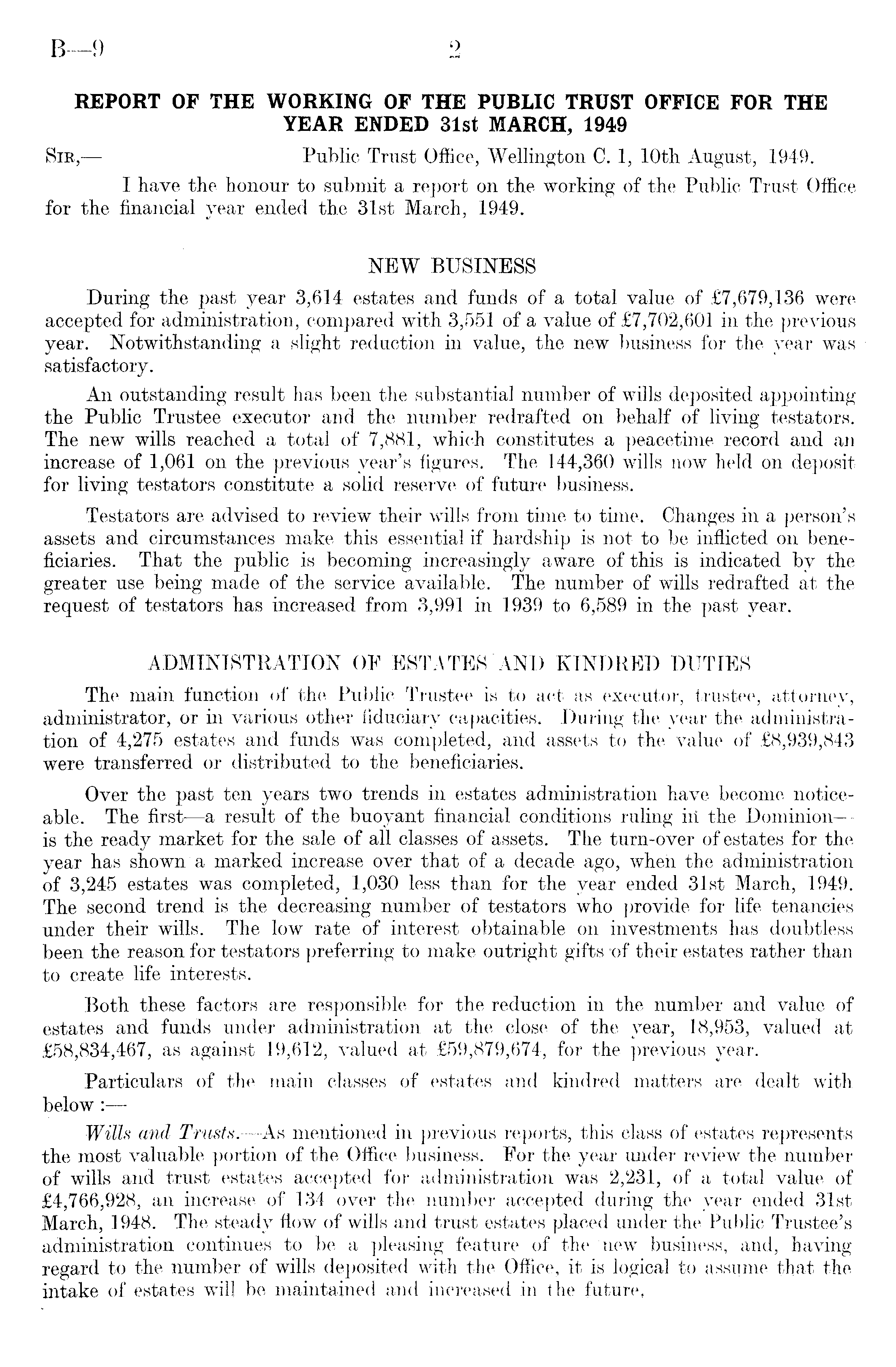REPORT OF THE WORKING OF THE PUBLIC TRUST OFFICE FOR THE YEAR ENDED 31st MARCH, 1949 Sir, — Public Trust Office, Wellington C. 1, 10th August, 1949. I have the honour to submit a report on the working of the Public Trust Office for the financial year ended the 31st March, 1949. NEW BUSINESS During the past year 3,614 estates and funds of a total value of £7,679,136 were accepted for administration, compared with 3,551 of a value of £7,702,601 in the previous year. Notwithstanding a slight reduction in value, the new business for the year was satisfactory. An outstanding result has been the substantial number of wills deposited appointing the Public Trustee executor and the number redrafted on behalf of living testators. The new wills reached a total of 7,881, which constitutes a peacetime record and an increase of 1,061 on the previous year's figures. The 144,360 wills now held on deposit for living testators constitute a solid reserve of future business. Testators are advised to review their wills from time to time. Changes in a person's assets and circumstances make this essential if hardship is not to be inflicted on beneficiaries. That the public is becoming increasingly aware of this is indicated by the greater use being made of the service available. The number of wills redrafted at the request of testators has increased from 3,991 in 1939 to 6,589 in the past year. ADMINISTRATION OF ESTATES AND KINDRED DUTIES The main function of the Public Trustee is to act as executor, trustee, attorney, administrator, or in various other fiduciary capacities. During the year the administration of 4,275 estates and funds was completed, and assets to the value of £8,939,843 were transferred or distributed to the beneficiaries. Over the past ten years two trends in estates administration have become noticeable. The first—a result of the buoyant financial conditions ruling iii the Dominion—is the ready market for the sale of all classes of assets. The turn-over of estates for the year has shown a marked increase over that of a decade ago, when the administration of 3,245 estates was completed, 1,030 less than for the year ended 31st March, 1949. The second trend is the decreasing number of testators who provide for life tenancies under their wills. The low rate of interest obtainable on investments has doubtless been the reason for testators preferring to make outright gifts -of their estates rather than to create life interests. Both these factors are responsible for the reduction in the number and value of estates and funds under administration at the close of the year, 18,953, valued at £58,834,467, as against 19,612, valued at £59,879,674, for the previous year. Particulars of the main classes of estates and kindred matters are dealt with below: — Wills and Trusts. —As mentioned in previous reports, this class of estates represents the most valuable portion of the. Office business. For the year under review the number of wills and trust estates accepted for administration was 2,231, of a total value of £4,766,928, an increase of 134 over the number accepted during the year ended 31st March, 1948. The steady flow of wills and trust estates placed under the Public Trustee's administration continues to be a pleasing feature of the new business, and, having regard to the number of wills deposited with the Office, it is logical to assume that the intake of estates will be maintained and increased in the future,
