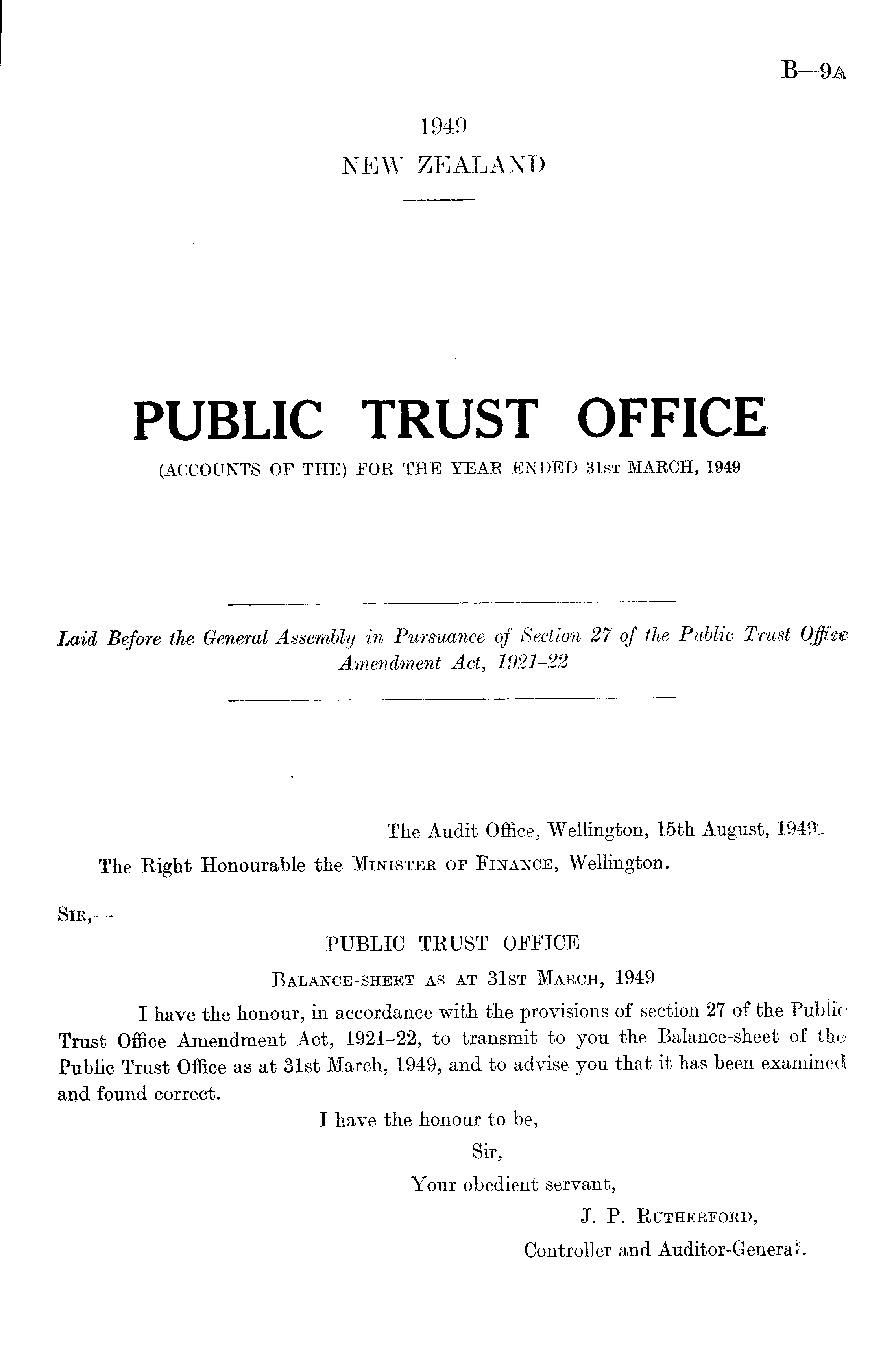 The Audit Office, Wellington, 15th August, 1949. The Right Honourable the Minister of Finance, Wellington. Sir, — PUBLIC TRUST OFFICE Balance-sheet as at 31st March, 1949 I have the honour, in accordance with the provisions of section 27 of the Public Trust Office Amendment Act, 1921-22, to transmit to you the Balance-sheet of the Public Trust Office as at 31st March, 1949, and to advise you that it has been examined and found correct. I have the honour to be, Sir, Your obedient servant, J. P. Rutherford, Controller and Auditor-General
