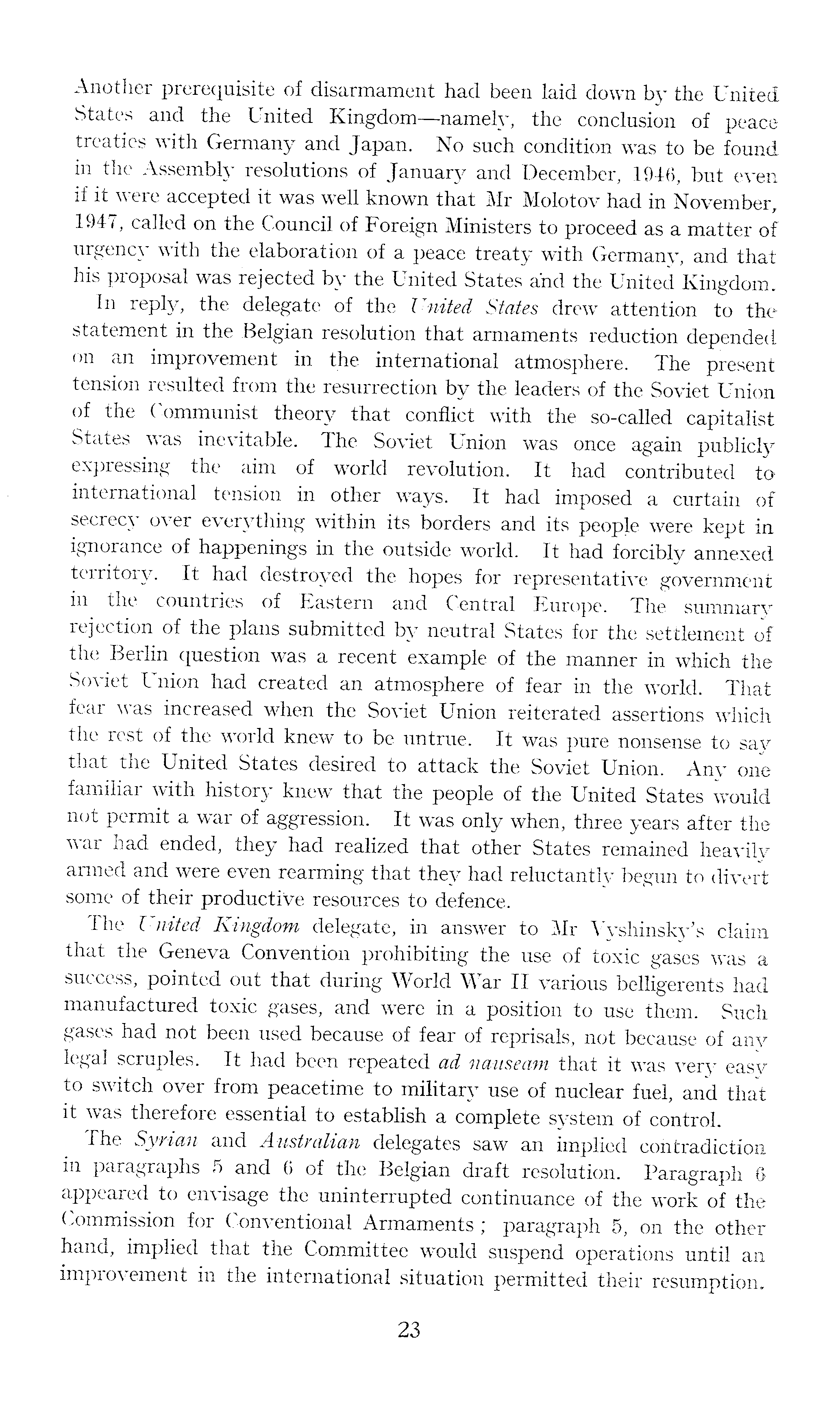 Another prerequisite of disarmament had been laid down by the United States and the United Kingdom—namely, the conclusion of peace treaties with Germany and Japan. No such condition was to be found in the Assembly resolutions of January and December, 1946, but even if it were accepted it was well known that Mr Molotov had in November, 1947, called on the Council of Foreign Ministers to proceed as a matter of urgency with the elaboration of a peace treaty with Germany, and that his proposal was rejected by the United States and the United Kingdom. In reply, the delegate of the United States drew attention to the statement in the Belgian resolution that armaments reduction depended on an improvement in the international atmosphere. The present tension resulted from the resurrection by the leaders of the Soviet Union of the Communist theory that conflict with the so-called capitalist States was inevitable. The Soviet Union was once again publicly expressing the aim of world revolution. It had contributed to international tension in other ways. It had imposed a curtain of secrecy over everything within its borders and its people were kept in ignorance of happenings in the outside world. It had forcibly annexed territory. It had destroyed the hopes for representative government in the countries of Eastern and Central Europe. The summary rejection of the plans submitted by neutral States for the settlement of the Berlin question was a recent example of the manner in which the Soviet Union had created an atmosphere of fear in the world. That fear was increased when the Soviet Union reiterated assertions which the rest of the world knew to be untrue. It was pure nonsense to say that the United States desired to attack the Soviet Union. Any one familiar with history knew that the people of the United States would not permit a war of aggression. It was only when, three years after the war had ended, they had realized that other States remained heavily armed and were even rearming that they had reluctantly begun to divert some of their productive resources to defence. The United Kingdom delegate, in answer to Mr Vyshinsky's claim that the Geneva Convention prohibiting the use of toxic gases was a success, pointed out that during World War II various belligerents had manufactured toxic gases, and were in a position to use them. Such gases had not been used because of fear of reprisals, not because of any legal scruples. It had been repeated ad nauseam that it was very easy to switch over from peacetime to military use of nuclear fuel, and that it was therefore essential to establish a complete system of control. The Syrian and Australian delegates saw an implied contradiction in paragraphs 5 and 6 of the Belgian draft resolution. Paragraph 6 appeared to envisage the uninterrupted continuance of the work of the Commission for Conventional Armaments ; paragraph 5, on the other hand, implied that the Committee would suspend operations until an improvement in the international situation permitted their resumption.