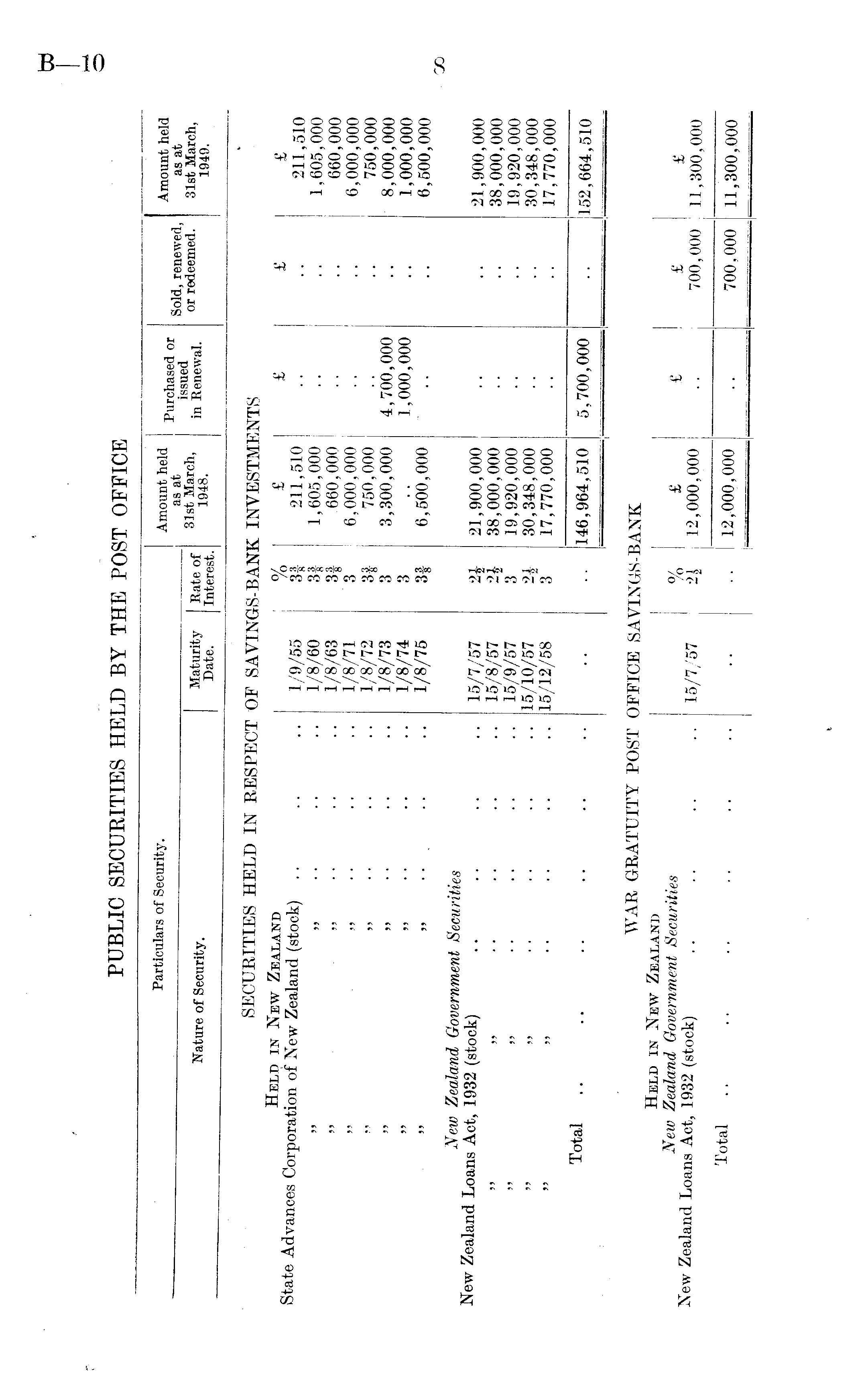 Particulars of Security. Amount held as at Purchased or Ptnlrl rpnpwpfl Amount held as at 31st March, 1949. Nature of Security. Maturity Date. Rate of Interest. 31st March, 1948. issued in Renewal. or redeemed. SECURITIES HELD IN RESPECT OF SAVINGS-BANK INVESTMENTS Held in New Zealand % 3| £ * e r State Advances Corporation of New Zealand (stock) 1/9/55 211,510 ob 211,510 1/8/60 3f 1,605,000 1,605,000 1/8/63 3f 660,000 660,000 1/8/71 3 6,000,000 6,000,000 1/8/72 3| 750,000 750,000 1/8/73 3 3,300,000 4,700,000 8,000,000 1/8/74 3 1,000,000 1,000,000 1/8/75 3f 6,500,000 6,500,000 New Zealand Government Securities New Zealand Loans Act, 1932 (stock) 15/7/57 n 21,900,000 21,900,000 » „ 15/8/57 2£ 38,000,000 38,000,000 " » 15/9/57 3 19,920,000 19,920,000 " „ 15/10/57 n 30,348,000 30,348,000 " " 15/12/58 3 )PPICE SAVINGS- 1 17,770,000 17,770,000 Total .. 146,964,510 5,700,000 152,664,510 WAR GRATUITY POST ( ANK Held in New Zealand New Zealand Government Securities % £ £ £ 700,000 £ 11,300,000 New Zealand Loans Act, 1932 (stock) 15/7/57 12,000,000 Total .. 12,000,000 700,000 11,300,000