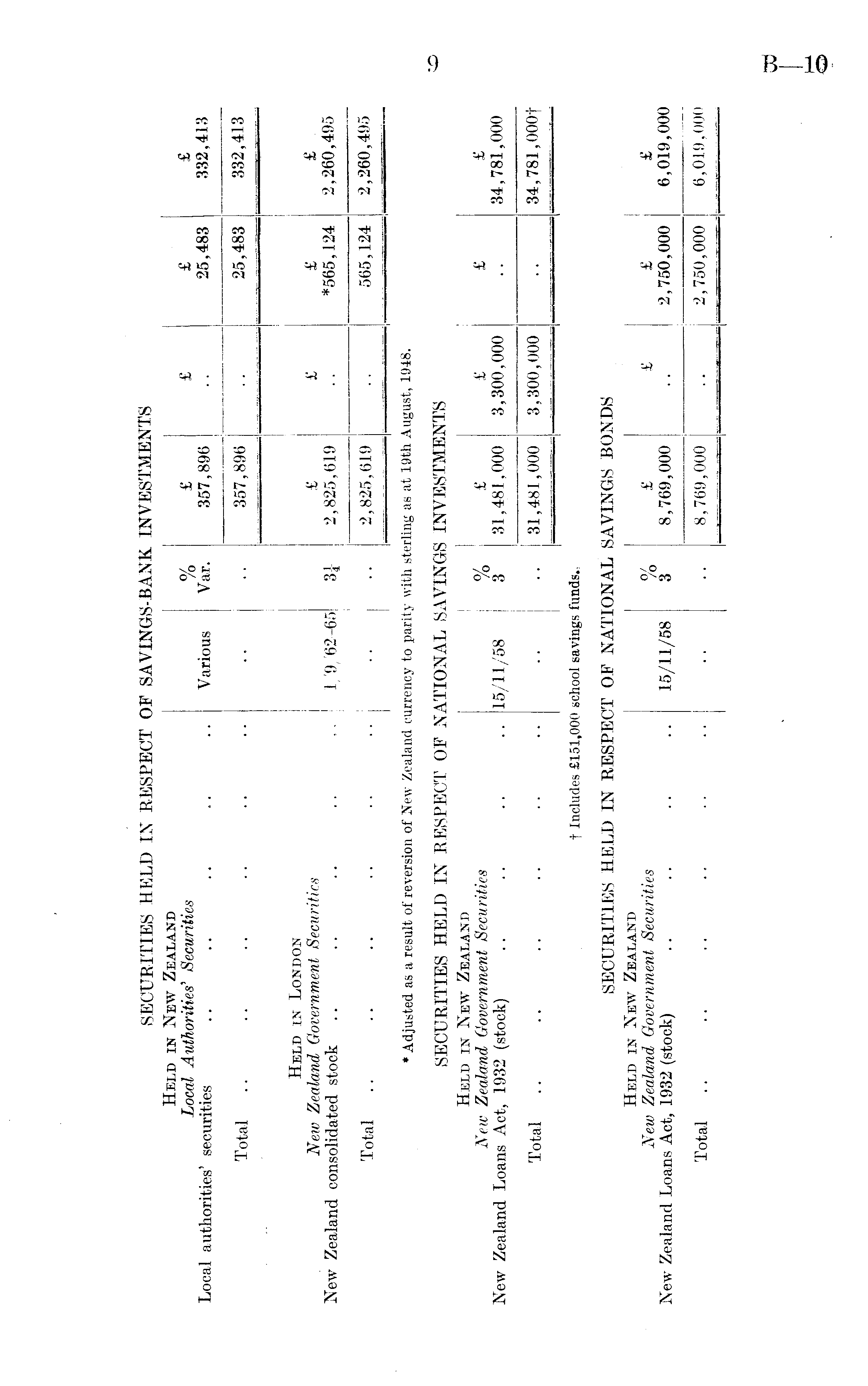 SECURITIES HELD IN RESPECT C Held in New Zealand Local Authorities' Securities Local authorities' securities )F SAVINGS-BANK /o Various Var. 1/9/62-65 3|: rrency to parity with ste kTIONAL SAVINGS 0/ 15/11/58 3° school savings funds., T OF NATIONAL 0/ 15/11/58 3° INVESTME1 £ 357,896 *TS £ £ 25,483 £ 332,413 Total .. 357,896 25,483 332,413 Held in London New Zealand Government Securities New Zealand consolidated stock £ 2,825,619 £ £ *565,124 £ . 2,260,495 Total 2,825,619 565,124 2,260,495 * Adjusted as a result of reversion of New Zealand ei SECURITIES HELD IN RESPECT OF N Held in New Zealand New Zealand Government Securities New Zealand Loans Act, 1932 (stock) rling as at 19th August, 1948. , INVESTMENTS £ £ 31,481,000 3,300,000 £ £ 34,781,000 Total 31,481,000 3, 300,000 34,781,000f t Includes £151,000 SECURITIES HELD IN RESPEC Held in New Zealand New Zealand Government Securities New Zealand Loans Act, 1932 (stock) SAVINGS BONDS £ 8,769,000 £ £ 2,750,000 £ 6,019,000 Total .. 8,769,000 • 2,750,000 6,019,000