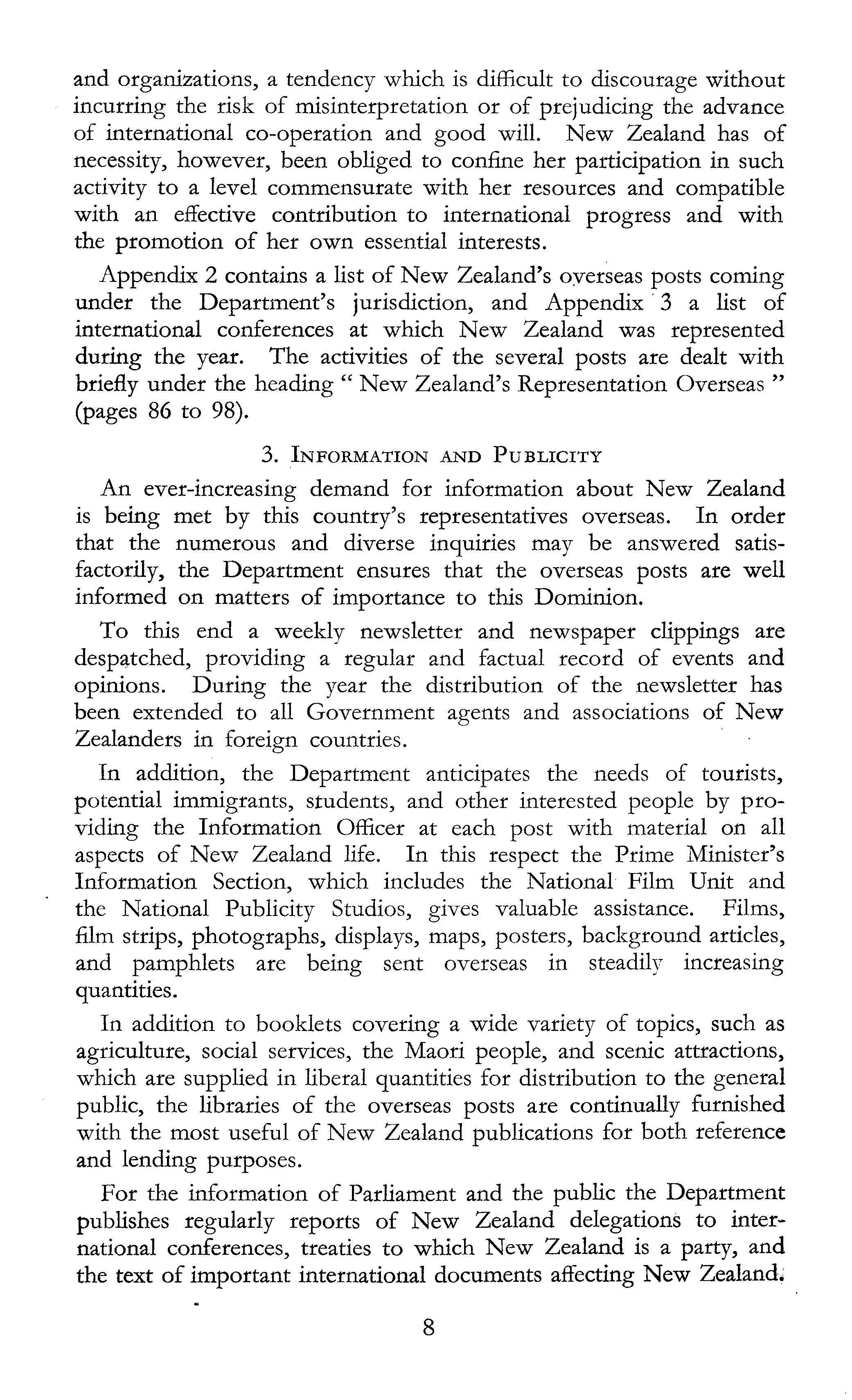 and organizations, a tendency which is difficult to discourage without incurring the risk of misinterpretation or of prejudicing the advance of international co-operation and good will. New Zealand has of necessity, however, been obliged to confine her participation in such activity to a level commensurate with her resources and compatible with an effective contribution to international progress and with the promotion of her own essential interests. Appendix 2 contains a list of New Zealand's overseas posts coming under the Department's jurisdiction, and Appendix '3 a list of international conferences at which New Zealand was represented during the year. The activities of the several posts are dealt with briefly under the heading " New Zealand's Representation Overseas " (pages 86 to 98). 3. Information and Publicity An ever-increasing demand for information about New Zealand is being met by this country's representatives overseas. In order that the numerous and diverse inquiries may be answered satisfactorily, the Department ensures that the overseas posts are well informed on matters of importance to this Dominion. To this end a weekly newsletter and newspaper clippings are despatched, providing a regular and factual record of events and opinions. During the year the distribution of the newsletter has been extended to all Government agents and associations of New Zealanders in foreign countries. In addition, the Department anticipates the needs of tourists, potential immigrants, students, and other interested people by providing the Information Officer at each post with material on all aspects of New Zealand life. In this respect the Prime Minister's Information Section, which includes the National Film Unit and the National Publicity Studios, gives valuable assistance. Films, film strips, photographs, displays, maps, posters, background articles, and pamphlets are being sent overseas in steadily increasing quantities. In addition to booklets covering a wide variety of topics, such as agriculture, social services, the Maori people, and scenic attractions, which are supplied in liberal quantities for distribution to the general public, the libraries of the overseas posts are continually furnished with the most useful of New Zealand publications for both reference and lending purposes. For the information of Parliament and the public the Department publishes regularly reports of New Zealand delegations to international conferences, treaties to which New Zealand is a party, and the text of important international documents affecting New Zealand,
