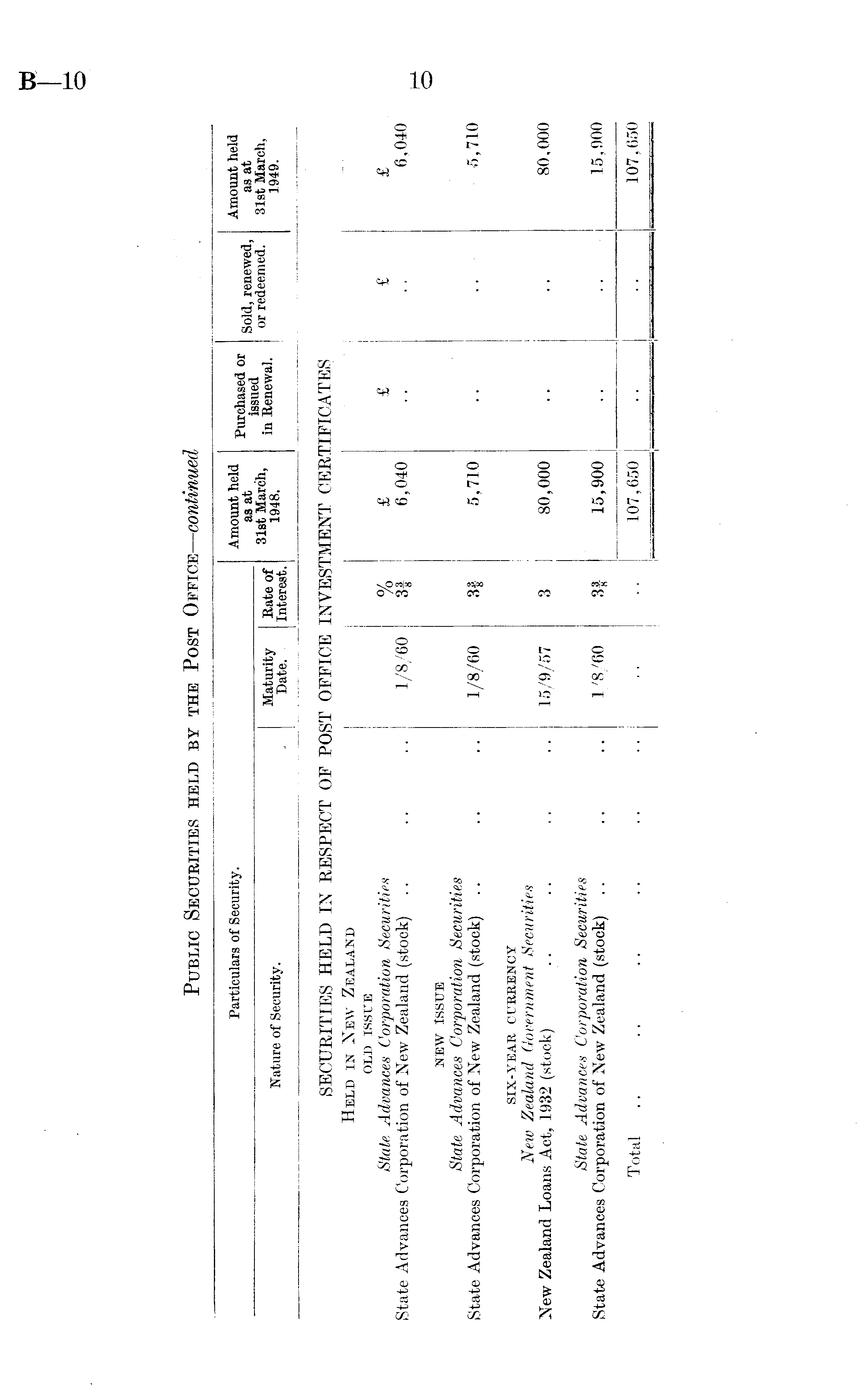Particulars of Security. Amount held as at Purchased or issued in Renewal. Sold, renewed, Amount held as at Nature of Security. Maturity Date. Hate of Interest. 31st March, 1948. or redeemed. 31st March, 1949. SECURITIES HELD IN RESPECT OF POST OFFICE INVESTMENT CERTIFICATES Held in New Zealand OLD ISSUE State Advances Corporation Securities State Advances Corporation of New Zealand (stock) 1/8/60 % 3| ■ £ 6,040 £ £ £ 6,040 NEW ISSUE State Advances Corporation Securities State Advances Corporation of New Zealand (stock) 1/8/60 3f 5,710 5,710 SIX-YEAR CURRENCY New Zealand Government Securities New Zealand Loans Act, 1932 (stock) 15/9/57 3 80,000 80,000 State Advances ■ Corporation Securities State Advances Corporation of New Zealand (stock) 1/8/60 3| 15,900 15,900 Total . 107,650 107,650