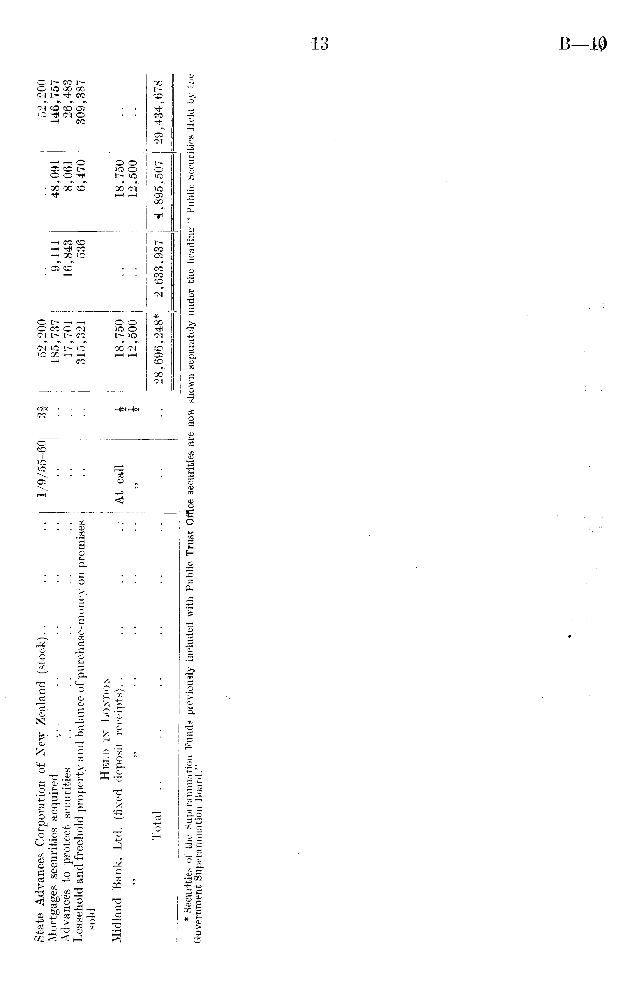 State Advances Corporation of New Zealand (stock) Mortgages securities acquired v .. . . Advances to protect securities Leasehold and freehold property and balance of purchase-money on premises sold Held in Londox Midland Bank, Ltd. (fixed deposit receipts) 1/9/55-60 At call 3| i 52,200 185,737 17,701 315,321 18,750 12,500 9,111 16,843 536 48,091 8,061 6,470 18,750 12,500 52,200 146,757 26,483 309,387 Total 28,696,248* 2,633,937 €,895,507 29,434,678 * Securities of the Superannuation Funds previously included with Public Trust Office securities are now shown separately under the heading " Public Securities Held by the Government Superannuation Board." *