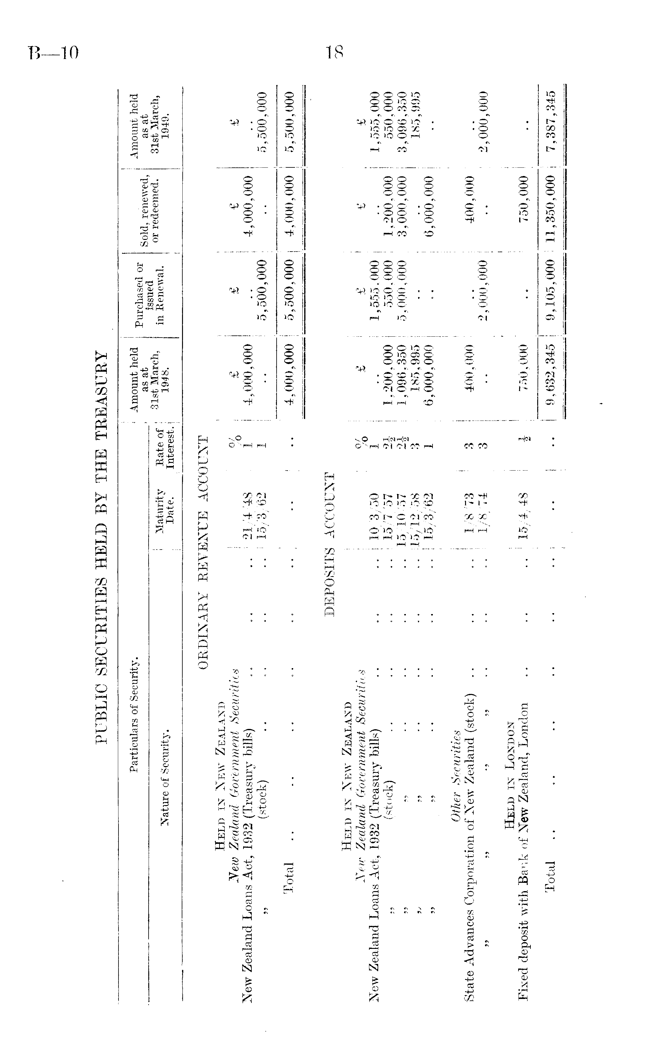 Particulars of Security. Amount held as at Purchased or issued in Renewal. 1 Sold, renewed, Amount held as at Nature of Security. Maturity ! Date. Rate of Interest. 31st March, 1948. or redeemed. 31st March, 1949. ORDINARY REVENUE ACCOUNT Held in New Zealand New Zealand Government Securities New Zealand Loans Act, 1932 (Treasury bills) „ (stock) 21/4/48 15/3/62 % i 1 1 £ 4,000,000 £ 5,500,000 £ 4,000,000 £ 5,500,000 Total 4,000,000 5,500,000 4,000,000 5,500,000 DEPOSITS ACCOUNT Held in New Zealand | New Zealand Government Securities New Zealand Loans Act, 1932 (Treasury bills) .. .. .. „ (stock) .. .. .. 10/3/50 15/7/57 15/10/57 15/12/58 15/3/62 0/ /o 1 n 3 1 £ 1,200,000 1,096,350 ! 185,995 6,000,000 £ 1,555,000 550.000 5,000,000 £ 1,200,000 3,000,000 6,000,000 £ 1,555, 000 550,000 3,096,350 185,995 Other Securities State Advances Corporation of New Zealand (stock) 1/8/73 1/8/74 3 3 400,000 2,000,000 400,000 2,000,000 Held in London Fixed deposit with Bank of New Zealand, London .. .. 15/4/48 i 750,000 750,000 Total 1 9,632,345 9,105,000 11,350,000 7,387,345