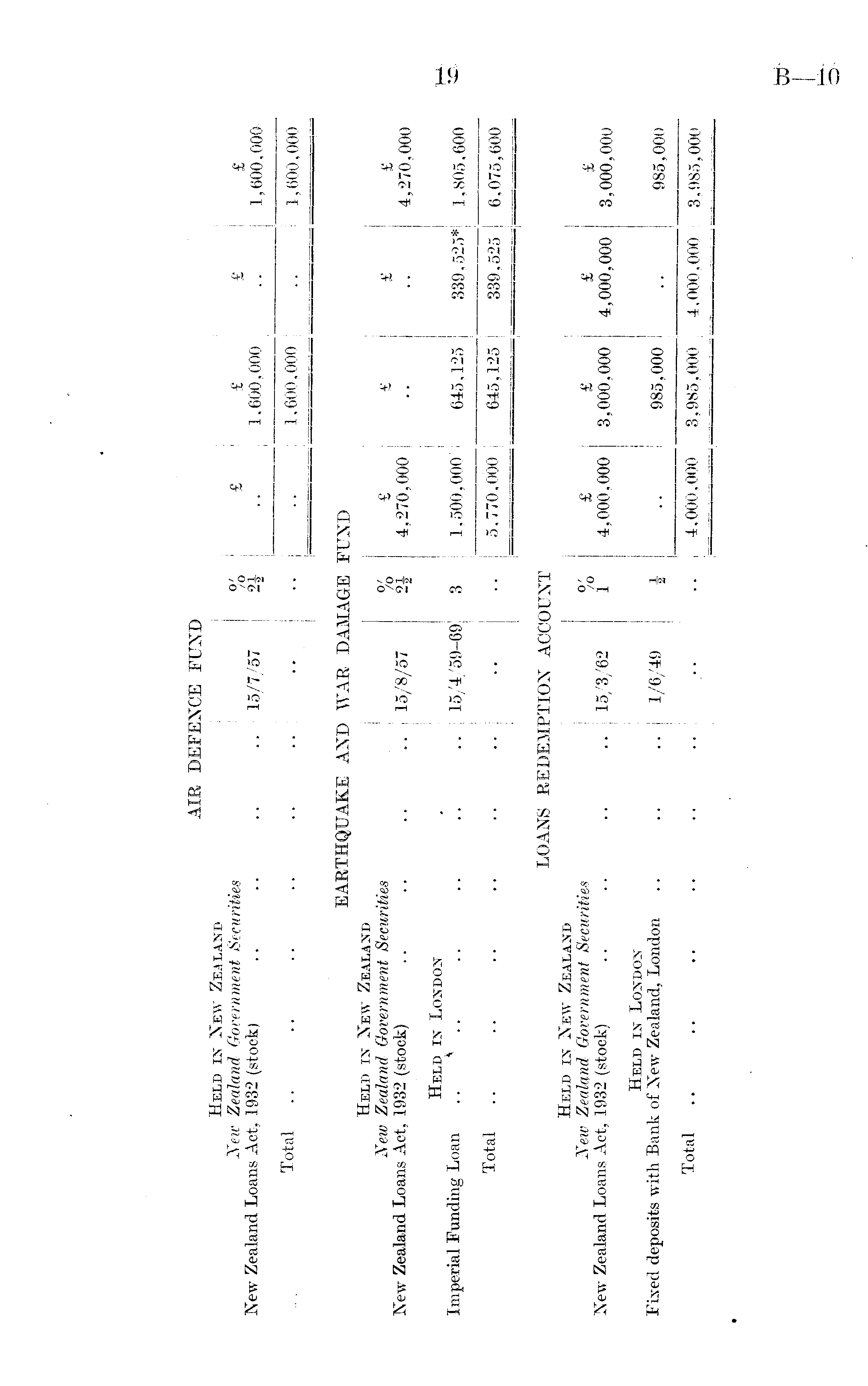 AIR Held in New Zealand New Zealand Government Securities New Zealand Loans Act, 1932 (stock) DEFENCE FUND % .. 15/7/57 2 \ AND WAR DAMAGE I % .. 15/8/57 2i .. 15/4/59-69 3 " " ADEMPTION ACCOUNT 0/ /o .. 15/3/62 1 .. 1/6/49 \ £ £ 1,600,000 £ £ 1,600,000 Total 1,600,000 1,600,000 EARTHQUAKE Held in New Zealand New Zealand Government Securities New Zealand Loans Act, 1932 (stock) Held in London Imperial Funding Loan .. * .» £ 4,270,000 1,500,000 £ 645,125 £ 339,525* £ 4,270,000 1,805,600 Total .. 5.770,000 645,125 339,525 6,075,600 LOANS RI Held in New Zealand New Zealand Government Securities New Zealand Loans Act, 1932 (stock) Held in London Fixed deposits with Bank of New Zealand, London £ 4,000,000 £ 3,000,000 985,000 £ 4,000,000 £ 3,000,000 985,000 Total .. 4,000,000 3,985,000 4,000,000 3,985,000 .