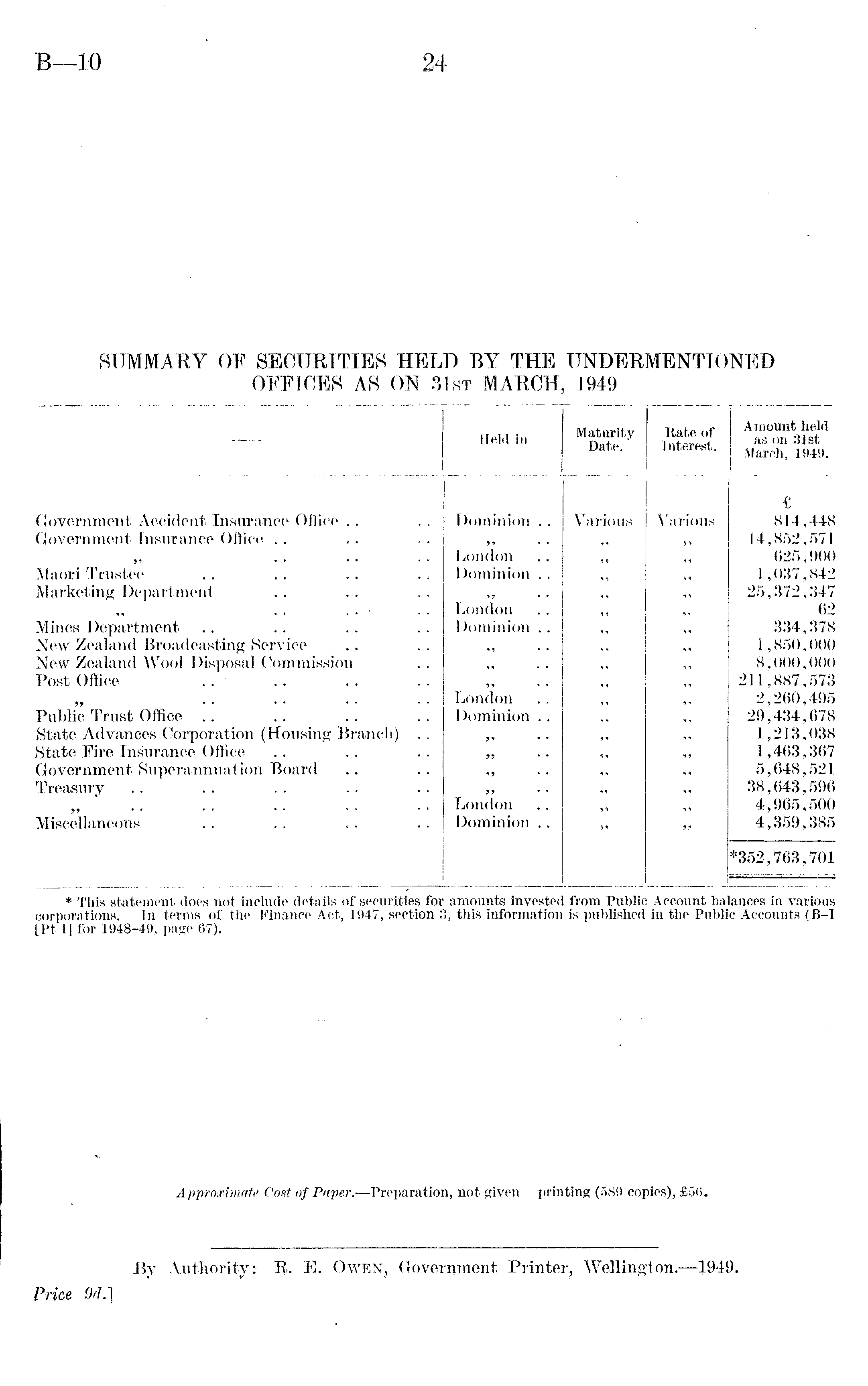 — Held in Maturity Date. Kate of Interest. Amount held as on 31st March, 1949. Government Accident Insurance Office Dominion .. Various Various 814,448 Government Insurance Office London " 14,852,571 025,900 Maori Trustee ... Dominion . . .. 1,037,842 Marketing Department London „ 25,372,347 02 Mines Department Dominion . ,, „ .'534,378 New Zealand Broadcasting Service ,, ,, 1,850,000 New Zealand Wool Disposal Commission » j; 8,000,000 Post Office London » 211,887,573 2,200,495 Public Trust Office Dominion . , 20,434,078 State Advances Corporation (Housing Branch) . ,, ,, 1,213,038 State Fire Insurance Office „ ,, ,, 1,463,367 Government Superannuation Board ,, ,, ,, 5,648,521 Treasury London ,, 38,043,590 4,965,500 Miscellaneous Dominion . 4,359,385 *352,703,701 * This statement does not include details of securities for amounts invested from Public Account balances in various corporations. In terms of the Finance Act, 1047, section 3, this information is published in the Public Accounts TB-I [Pt 1| for 1948-49, page 67).