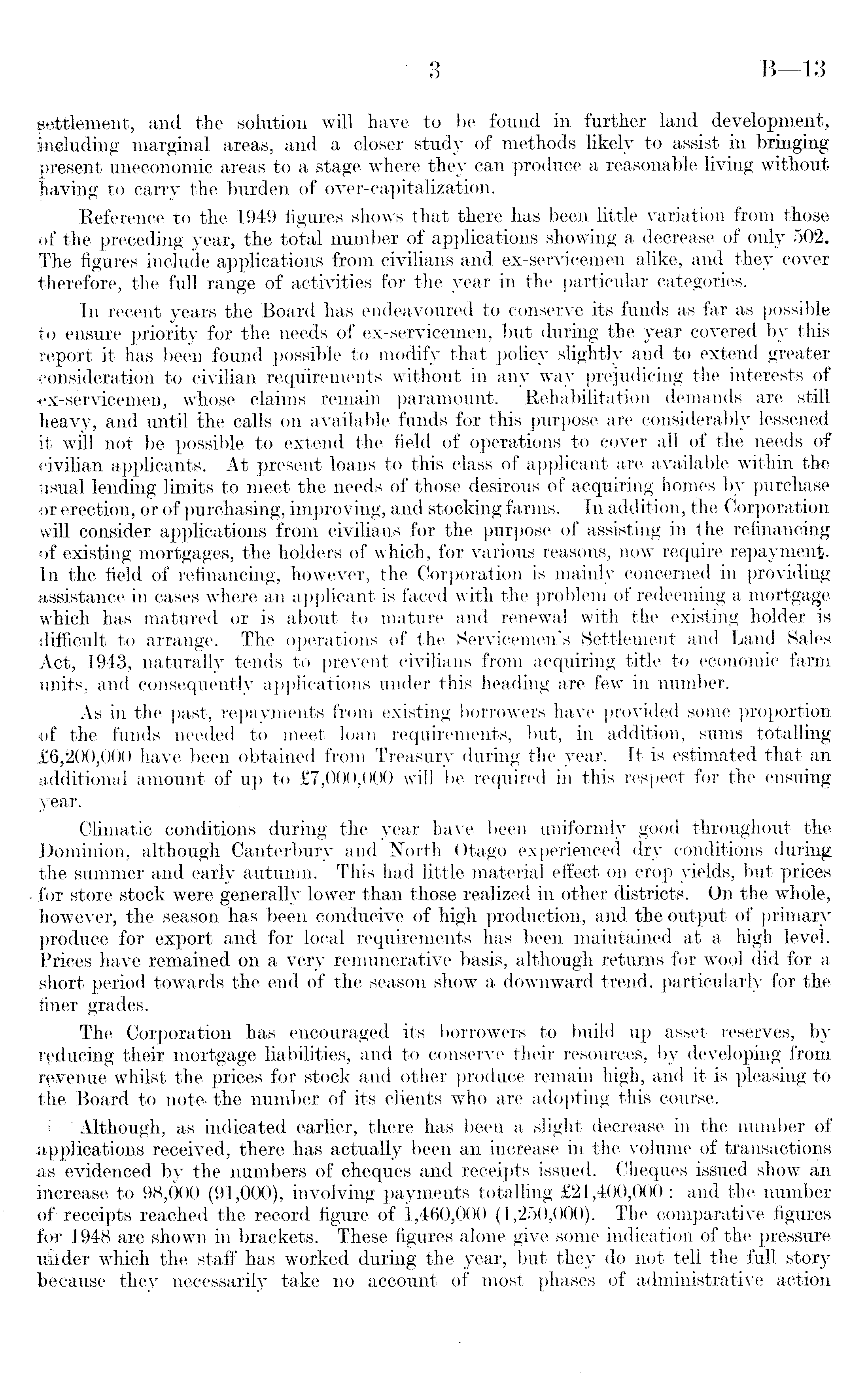 settlement, and the solution will have to be found in further land development, including marginal areas, and a closer study of methods likely to assist in bringing present uneconomic areas to a stage where they can produce a reasonable living without having to carry the burden of over-capitalization. Reference to the 1949 figures shows that there has been little variation from those of the preceding year, the total number of applications showing a decrease of only 5G2. The figures include applications from civilians and ex-servicemen alike, and they cover therefore, the full range of activities for the year in the particular categories. In recent years the Board has endeavoured to conserve its funds as far as possible to ensure priority for the needs of ex-servicemen, but during the year covered by this report it has been found possible to modify that policy slightly and to extend greater consideration to civilian requirements without in any way prejudicing the interests of ex-servicemen, whose claims remain paramount. Rehabilitation demands are still heavy, and until the calls oxi available funds for this purpose are considerably lessened it will not be possible to extend the field of operations to cover all of the needs of civilian applicants. At present loans to this class of applicant are available within the usual lending limits to meet the needs of those desirous of acquiring homes by purchase or erection, or of purchasing, improving, and stocking farms. In addition, the Corporation will consider applications from civilians for the purpose of assisting in the refinancing of existing mortgages, the holders of which, for various reasons, now require repayment. In the field of refinancing, however, the Corporation is mainly concerned in providing assistance in cases where an applicant is faced with the problem of redeeming a mortgage which has matured or is about to mature and renewal with the existing holder is difficult to arrange. The operations of the Servicemen's Settlement and Land Sales Act, 1943, naturally tends to prevent civilians from acquiring title to economic farm units, and consequently applications under this heading are few in number. As in the past, repayments from existing borrowers have provided some proportion of the funds needed to meet loan requirements, but, in addition, sums totalling £6,200,000 have been obtained from Treasury during the year. It is estimated that an additional amount of up to £7,000,000 will be required in this respect for the ensuing year. Climatic conditions during the year have been uniformly good throughout the Dominion, although Canterbury and North Otago experienced dry conditions during the summer and early autumn. This had little material effect on crop yields, but prices for store stock were generally lower than those realized in other districts. On the whole, however, the season has been conducive of high production, and the output of primary produce for export and for local requirements has been maintained at a high level. Prices have remained on a very remunerative basis, although returns for wool did for a short period towards the end of the season show a downward trend, particularly for the finer grades. The Corporation has encouraged its borrowers to build up asset reserves, by reducing their mortgage liabilities, and to conserve their resources, by developing from revenue whilst the prices for stock and other produce remain high, and it is pleasing to the Board to note the number of its clients who are adopting this course. i " Although, as indicated earlier, there has been a slight decrease in the number of applications received, there has actually been an increase in the volume of transactions as evidenced by the numbers of cheques and receipts issued. Cheques issued show an increase to 98,000 (91,000), involving payments totalling £21,400,000 ; and the number of receipts reached the record figure of 1,460,000 (1,250,000). The comparative figures for 1948 are shown in brackets. These figures alone give some indication of the pressure uiider which the staff has worked during the year, but they do not tell the full story because they necessarily take no account of most phases of administrative action