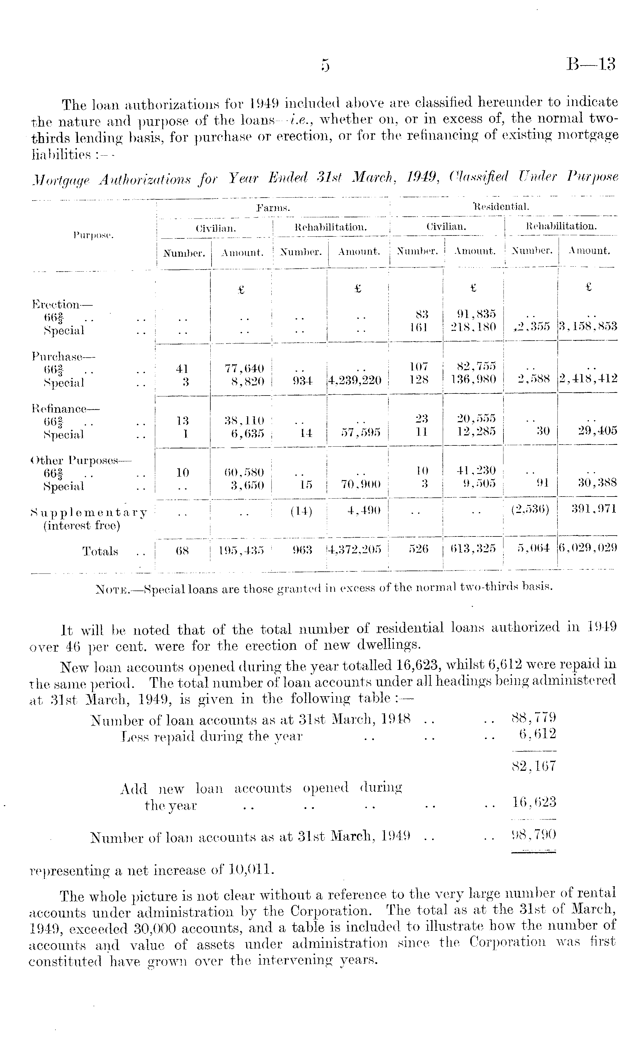Note.—Special loans are those granted in excess of the normal two-thirds basis. It will be noted that of the total number of residential loans authorized in 1949 over 46 per cent, were for the erection of new dwellings. New loan accounts opened during the year totalled 16,623, whilst 6,612 were repaid in the same period. The total number of loan accounts under all headings being administered at 31st March, 1949, is given in the following table : Number of loan accounts as at 31st March, 1948 .. .. 88,779 Less repaid during the year .. .. .. 6,612 82,167 Add new loan accounts opened during the year .. .. .. •■• •• 16,623 Number of loan accounts as at 31st March, 1949 . . .. 98,790 representing a net increase of 10,011. The whole picture is not clear without a reference to the very large number of rental accounts under administration by the Corporation. The total as at the 31st of March, 1949, exceeded 30,000 accounts, and a table is included to illustrate how the number of accounts and value of assets under administration since the Corporation was first constituted have grown over the intervening years.