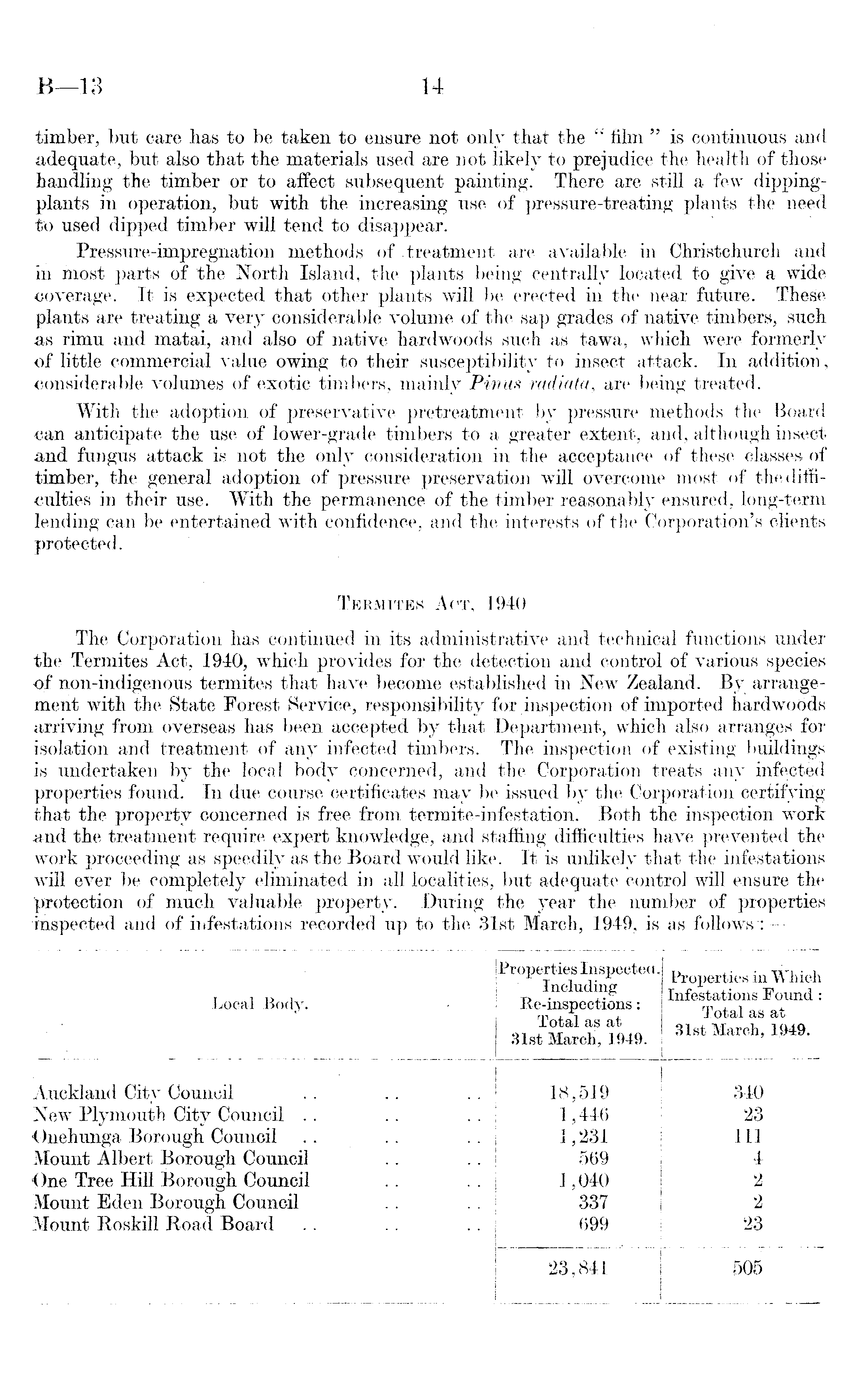 timber, but care has to be taken to ensure not only that the " film " is continuous and adequate, but also that the materials used are not likely to prejudice the health of those handling the timber or to affect subsequent painting. There are still a few dippingplants in operation, but with the increasing use of pressure-treating plants the need to used dipped timber will tend to disappear. . Pressure-impregnation methods of treatment are available in Christchurch and in most parts of the North Island, the plants being centrally located to give a wide coverage. It is expected that other plants will be erected in the near future. These plants are treating a very considerable volume of the sap grades of native timbers, such as rimu and matai, and also of native hardwoods such as tawa, which were formerly of little commercial value owing to their susceptibility to insect attack. In addition, considerable volumes of exotic timbers, mainly Pinus radiata, are being treated. With the adoption of preservative pretreatment by pressure methods the Board can anticipate the use of lower-grade timbers to a greater extent, and, although insect and fungus attack is not the only consideration in the acceptance of these classes of timber, the general adoption of pressure preservation will overcome most of the difficulties in their use. With the permanence of the timber reasonably ensured, long-term lending can be entertained with confidence, and the interests of the Corporation's clients protected. Termites Act, 1940 The Corporation has continued in its administrative and technical functions under the Termites Act, 1940, which provides for the detection and control of various species of non-indigenous termites that have become established in New Zealand. By arrangement with the State Forest Service, responsibility for inspection of imported hardwoods arriving from overseas has been accepted by that Department, which also arranges for isolation and treatment of any infected timbers. The inspection of existing buildings is undertaken by the local body concerned, and the Corporation treats any infected properties found. In due course certificates may be issued by the Corporation certifying that the property concerned is free from termite-infestation. Both the inspection work .and the treatment require expert knowledge, and staffing difficulties have prevented the work proceeding as speedily as the Board would like. It is unlikely that the infestations will ever be completely eliminated in all localities, but adequate control will ensure the protection of much valuable property. During the year the number of properties inspected and of infestations recorded up to the 31st March, 1949, is as follows: