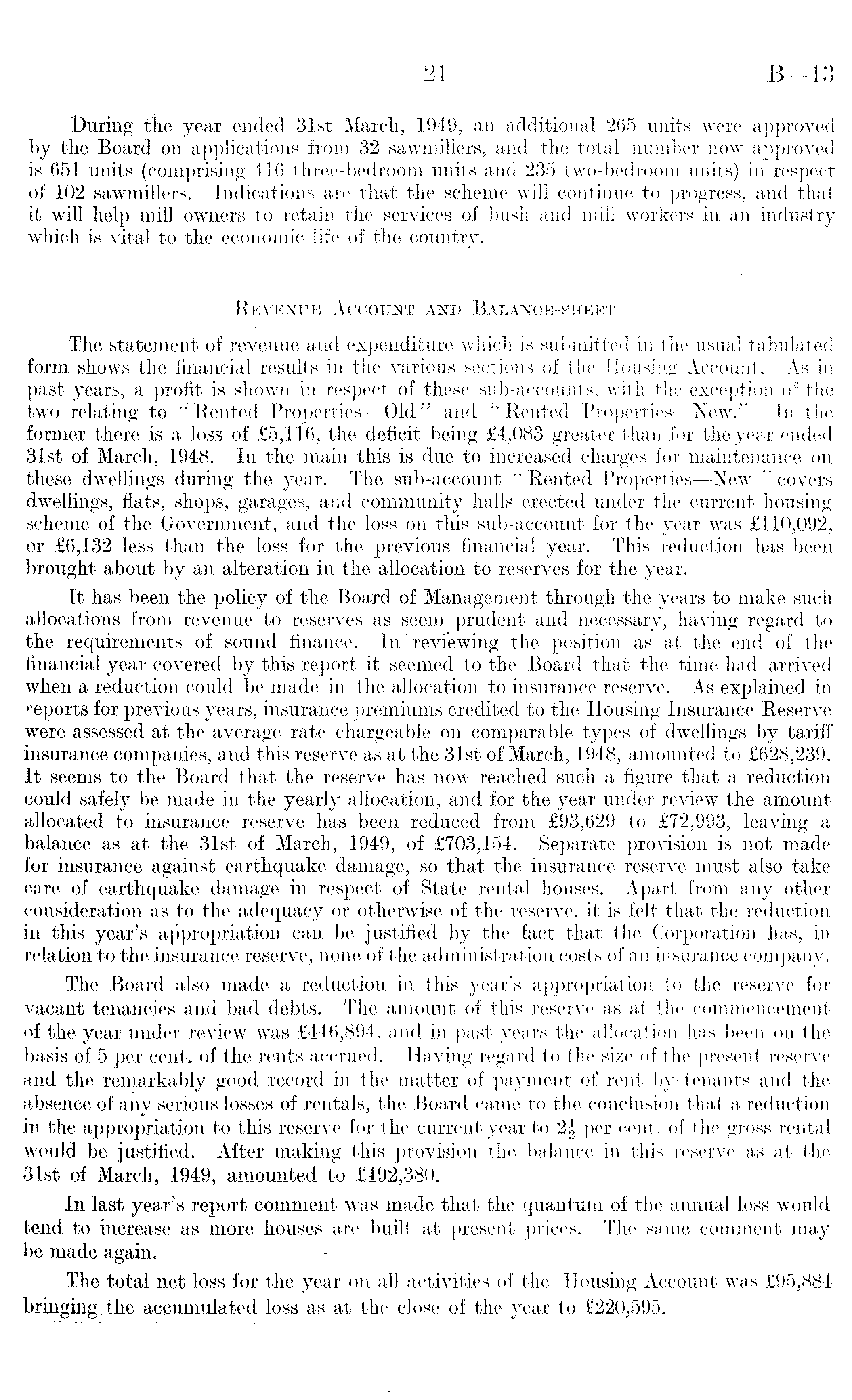 During the year ended 31st March, 1949, an additional 265 units were approved by the Board on applications from 32 sawmillers, and the total number now approved is 651 units (comprising 416 three-bedroom units and 235 two-bedroom units) in respect of 102 sawmillers. Indications are that the scheme will continue to progress, and that it will help mill owners to retain the services of bush and mill workers in an industry which is vital to the economic life of the country. Revenue Account and Balance-sheet The statement of revenue and expenditure which is submitted in the usual tabulated form shows the financial results in the various sections of the Housing Account. As in past years, a profit is shown in respect of these sub-accounts, with the exception of the two relating to " Rented Properties—Old " and " Rented Properties—New." In the former there is a loss of £5,116, the deficit being £4,083 greater than for theyear ended 31st of March, 1948. In the main this is due to increased charges for maintenance on these dwellings during the year. The sub-account " Rented Properties —New " covers dwellings, flats, shops, garages, and community halls erected under the current housing scheme of the Government, and the loss on this sub-account for the year was £110,092, or £6,132 less than the loss for the previous financial year. This reduction has been brought about by an alteration in the allocation to reserves for the year. It has been the policy of the Board of Management through the years to make such allocations from revenue to reserves as seem prudent and necessary, having regard to the requirements of sound finance. In' reviewing the position as at the end of the financial year covered by this report it seemed to the Board that the time had arrived when a reduction could be made in the allocation to insurance reserve. As explained in reports for previous years, insurance premiums credited to the Housing Insurance Reserve were assessed at the average rate chargeable on comparable types of dwellings by tariff insurance companies, and this reserve as at the 31st of March, 1948, amounted to £628,239. It seems to the Board that the reserve has now reached such a figure that a reduction could safely be made in the yearly allocation, and for the year under review the amount allocated to insurance reserve has been reduced from £93,629 to £72,993, leaving a balance as at the 31st of March, 1949, of £703,154. Separate provision is not made for insurance against earthquake damage, so that the insurance reserve must also take care of earthquake damage in respect of State rental houses. Apart from any other consideration as to the adequacy or otherwise of the reserve, it is felt that the reduction in this year's appropriation can be justified by the fact that the Corporation has, in relation to the insurance reserve, none of the administration costs of an insurance company. The Board also made a reduction in this year's appropriation to the reserve for vacant tenancies and bad debts. The amount of this reserve as at the commencement of the year under review was £446,894, and in past years the allocation has been on the basis of 5 per cent, of the rents accrued. Having regard to the size of the present reserve and the remarkably good record in the matter of payment of rent by tenants and the absence of any serious losses of rentals, the Board came to the conclusion that a reduction in the appropriation to this reserve for the current year to 2j> per cent, of the gross rental would be justified. After making this provision the balance in this reserve as at the 31st of March, 1949, amounted to £492,380. In last year's report comment was made that the quantum of the annual loss would tend to increase as more houses are built at present prices. The same comment may be made again. The total net loss for the year on all activities of the Housing Account was £95,884 bringing, the accumulated loss as at the close of the year to £220.595.