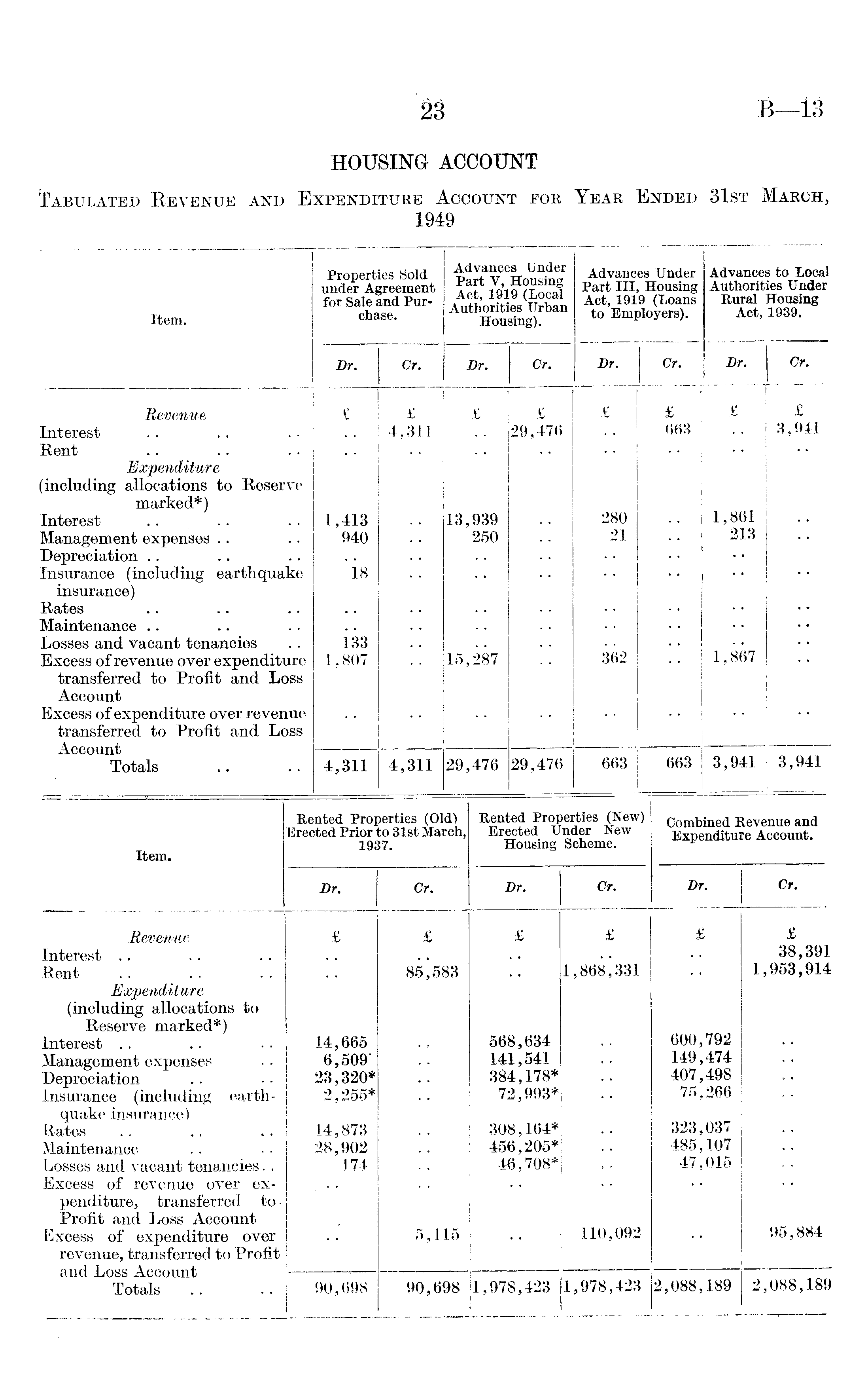 Item. Properties Sold under Agreement for Sale and Purchase. Advances Under Part V, Housing Act, 1919 (Local Authorities Urban Housing). Advances Under Part III, Housing Act, 1919 (Uoans to Employers). Advances to Local Authorities Under Rural Housing Act, 1939. Dr. Cr. Dr. Cr. Dr. Cr. Dr. Cr. Revenue Interest Rent Expenditure (including allocations to Reserve marked*) Interest Management expenses Depreciation Insurance (including earthquake insurance) Rates Maintenance Losses and vacant tenancies Excess of revenue over expenditure transferred to Profit and Loss Account Excess of expenditure over revenue transferred to Profit and Loss Account . Totals £ 1,413 940 is 133 1,807 £ 4,311 £ 13,939 250 15,287 * 29,476 1 £ 280 21 362 £ 663 £ 1,861 213 [ 1,867 £ 3,941 4,311 4,311 29,476 29,476 663 663 3,941 3,941 Item. Rented Properties (Old) Erected Prior to 31st March, 1937. Rented Properties (New) Erected Under New Housing Scheme. Combined Revenue and Expenditure Account. Dr. Cr. Dr. Cr. Dr. Cr. jRevenue Interest Rent Expenditure (including allocations to Reserve marked*) Interest Management expenses Depreciation Insurance (including earthquake insurance) Rates Maintenance Losses and vacant tenancies. , Excess of revenue over expenditure, transferred toProfit and Loss Account Excess of expenditure over revenue, transferred to Profit and Loss Account Totals £ 14,665 6,509" 23,320* 2,255* 14,873 28,902 174 £ 85583 5,115 £ 568,634 141,541 384,178* 72,993* 308,164* 456,205* 46,708* £ 1,868,331 110,092 £ 600,792 149,474 407,498 75,266 323,037 485,107 47,015 £ 38,391 1,953,914 95,884 90,698 90,698 1,978,423 1,978,423 2,088,189 2,088,189