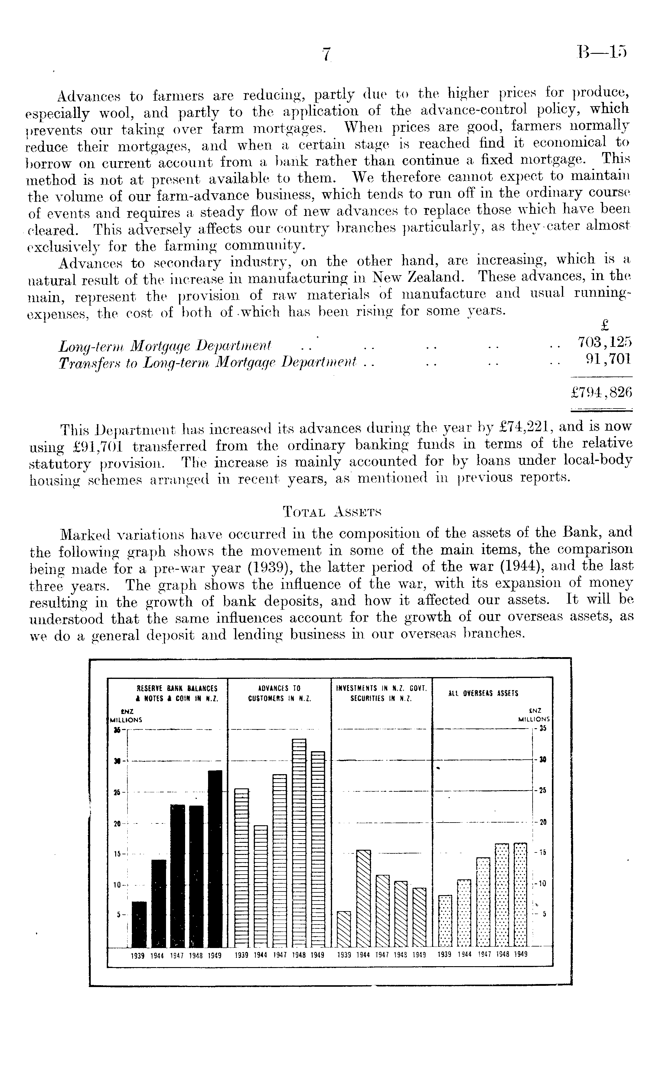 Advances to farmers are reducing, partly due to the higher prices for produce, especially wool, and partly to the application of the advance-control policy, which prevents our taking over farm mortgages. When prices are good, farmers normally reduce their mortgages, and when a certain stage is reached find it economical to borrow on current account from a bank rather than continue a fixed mortgage. This method is not at present available to them. We therefore cannot expect to maintain the volume of our farm-advance business, which tends to run off in the ordinary course of events and requires a steady flow of new advances to replace those which have been cleared. This adversely affects our country branches particularly, as they cater almost exclusively for the farming community. Advances to secondary industry, on the other hand, are increasing, which is a natural result of the increase in manufacturing in New Zealand. These advances, in the main, represent the provision of raw materials of manufacture and usual runningexpenses, the cost of both of-which has been rising for some years. Long-term Mortgage Department .. .. .. • • • • 703 > 125 Transfers to Long-term Mortgage Department .. .. .. ■• 91,701 £794,826 This Department has increased its advances during the year by £74,221, and is now using £91,701 transferred from the ordinary banking funds in terms of the relative statutory provision. The increase is mainly accounted for by loans under local-body housing schemes arranged in recent years, as mentioned in previous reports. Total Assets Marked variations have occurred in the composition of the assets of the Bank, and the following graph shows the movement in some of the main items, the comparison being made for a pre-war year (1939), the latter period of the war (1944), and the last three years. The graph shows the influence of the war, with its expansion of money resulting in the growth of bank deposits, and how it affected our assets. It will be understood that the same influences account for the growth of our overseas assets, as we do a general deposit and lending business in our overseas branches.