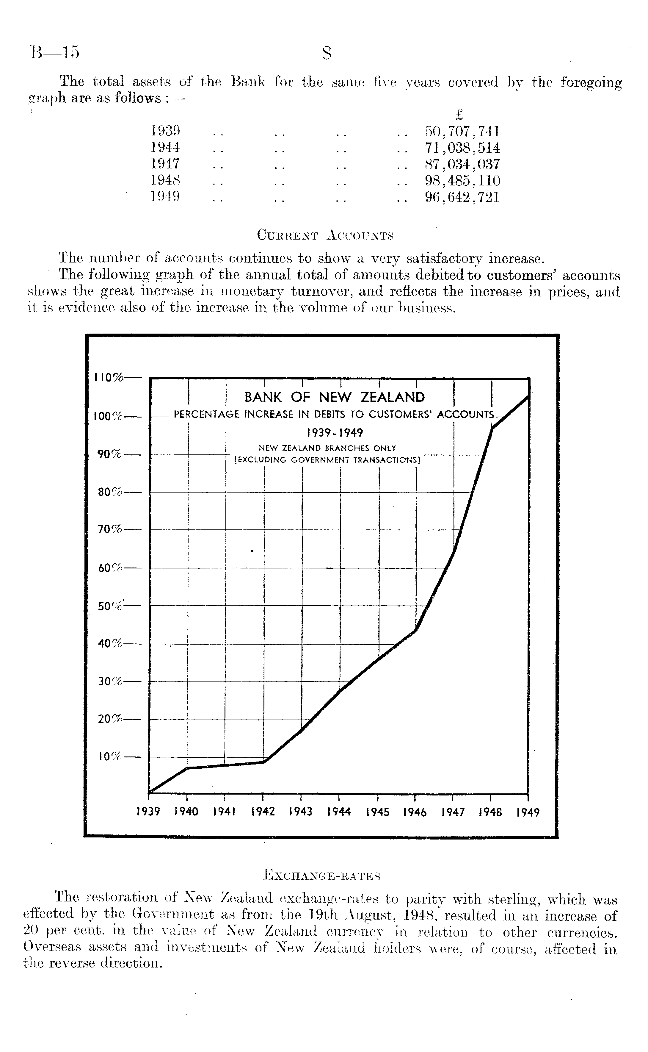 The total assets of the Bank for the same five years covered by the foregoing jjraph are as follows : ' £ 1939 .. .. .. .. 50,707,741 1944 .. .. .. .. 71,038,514 1947 .. .. .. .. 87,034,037 1948 .. .. .. .. 98,485,110 1949 .. .. .. .. 96,642,721 Current Accounts The number of accounts continues to show a very satisfactory increase. The following graph of the annual total of amounts debited to customers' accounts shows the great increase in monetary turnover, and reflects the increase in prices, and it is evidence also of the increase in the volume of our business.