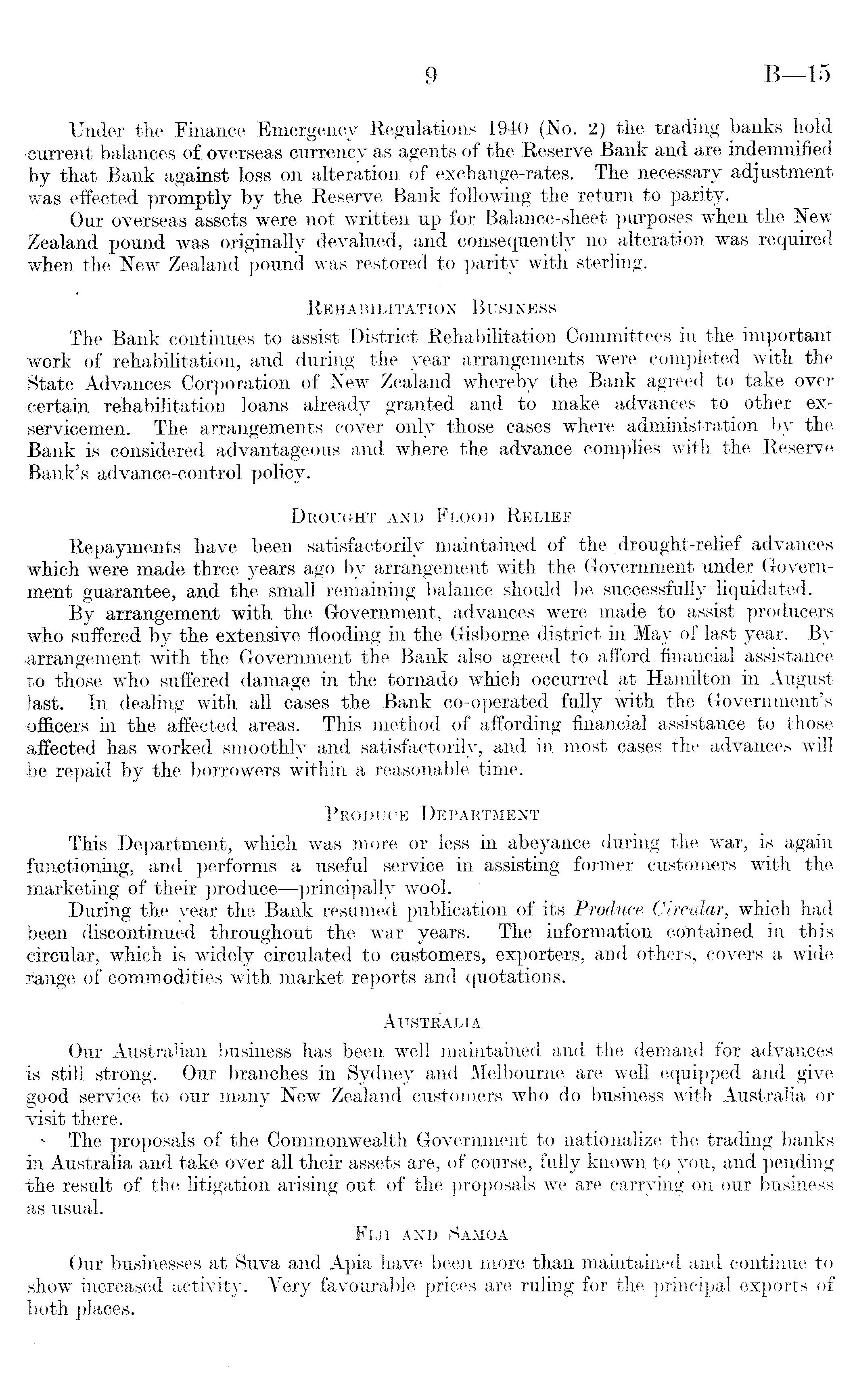 Under the Finance Emergency Regulations 1940 (No. 2) the trading banks hold •current balances of. overseas currency as agents of the Reserve Bank and are indemnified by that Bank against loss on alteration of exchange-rates. The necessary adjustment was effected promptly by the Reserve Bank following the return to parity. Our overseas assets were not written up for Balance-sheet purposes when the New Zealand pound was originally devalued, and consequently no alteration was required when the New Zealand pound was restored to parity with sterling. Rehabilitation Business The Bank continues to assist District Rehabilitation Committees in the important work of rehabilitation, and during the year arrangements were completed with the State Advances Corporation of New Zealand whereby the Bank agreed to take over certain rehabilitation loans already granted and to make advances to other exservicemen. The arrangements cover only those cases where administration by the Bank is considered advantageous and where the advance complies with the Reserve Bank's advance-control policy. Drought and Flood Relief Repayments have been satisfactorily maintained of the drought-relief advances which were made three years ago by arrangement with the Government under Government guarantee, and the small remaining balance should be successfully liquidated. By arrangement with the Government, advances were made to assist producers who suffered by the extensive flooding in the Gisborne district in May of last year. By •arrangement with the Government the Bank also agreed to afford financial assistance to those who suffered damage in the tornado which occurred at Hamilton in August last. In dealing with all cases the Bank co-operated fully with the Government's officers in the affected areas. This method of affording financial assistance to those affected has worked smoothly and satisfactorily, and in most cases the advances will be repaid by the borrowers within a reasonable time. Produce Department This Department, which was more or less in abeyance during the war, is again functioning, and performs a useful service in assisting former customers with the marketing of their produce—-principally wool. During the year the Bank resumed publication of its Produce Circular, which had been discontinued throughout the war years. The information contained in this circular, which is widely circulated to customers, exporters, and others, covers a wide range of commodities with market reports and quotations. Australia Our Australian business has been well maintained and the demand for advances is still strong. Our branches in Sydney and Melbourne are well equipped and give good service to our many New Zealand customers who do business with Australia or visit there. % The proposals of the Commonwealth Government to nationalize the trading banks in Australia and take over all their assets are, of course, fully known to you, and pending the result of the litigation arising out of the proposals we are carrying on our business as usual. Fiji and Samoa Our businesses at Suva and Apia have been more than maintained and continue to show increased activity. Very favourable prices are ruling for the principal exports of both places.