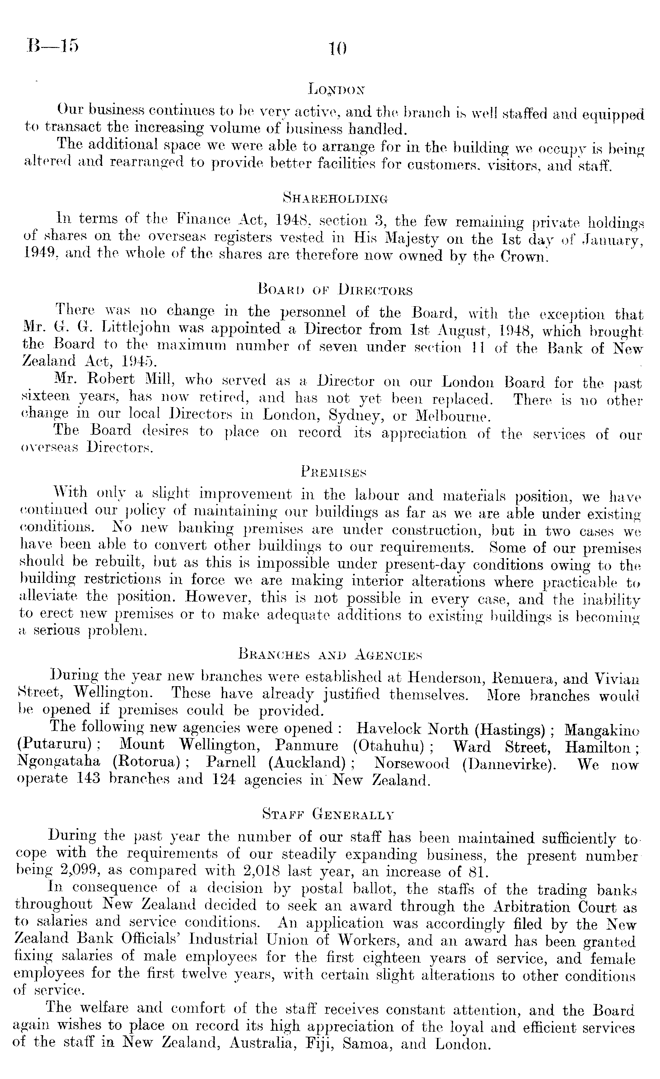 London Our business continues to be very active, and the branch it, well staffed and equipped to transact the increasing volume of business handled. The additional space we were able to arrange for in the building we occupy is being altered and rearranged to provide better facilities for customers, visitors, and staff. Shareholding In terms of the Finance Act, 1948, section 3, the few remaining private holdings of shares on the overseas registers vested in His Majesty on the Ist day of January, 1949, and the whole of the shares are therefore now owned by the Crown. Board of Directors There was no change in the personnel of the Board, with the exception that Mr. G. G. Little] ohn was appointed a Director from Ist August, 1948, which brought the Board to the maximum number of seven under section 11 of the Bank of New Zealand Act, 1945. Mr. Robert Mill, who served as a Director on our London Board for the past sixteen years, has now retired, and has not yet been replaced. There is no other change in our local Directors in London, Sydney, or Melbourne. The Board desires to place on record its appreciation of the services of our overseas Directors. Premises With only a slight improvement in the labour and materials position, we have continued our policy of maintaining our buildings as far as we are able under existing conditions. No new banking premises are under construction, but in two cases we have been able to convert other buildings to our requirements. Some of our premises should be rebuilt, but as this is impossible under present-day conditions owing to the building restrictions in force we are making interior alterations where practicable to alleviate the position. However, this is not possible in every case, and the inability to erect new premises or to make adequate additions to existing buildings is becoming a serious problem. Branches and Agencies During the year new branches were established at Henderson, Remuera, and Vivian Street, Wellington. These have already justified themselves. More branches would be opened if premises could be provided. The following new agencies were opened : Havelock North (Hastings); Mangakino (Putaruru); Mount Wellington, Panmure (Otahuhu) ; Ward Street, Hamilton Ngongataha (Rotorua) ; Parnell (Auckland) ; Norsewood (Dannevirke). We now operate 143 branches and 124 agencies in New Zealand. Staff Generally During the past year the number of our staff has been maintained sufficiently to cope with the requirements of our steadily expanding business, the present number being 2,.099, as compared with 2,018 last year, an increase of 81. In consequence of a decision by postal ballot, the staffs of the trading banks throughout New Zealand decided to seek an award through the Arbitration Court as to salaries and service conditions. An application was accordingly filed by the New Zealand Bank Officials' Industrial Union of Workers, and an award has been granted fixing salaries of male employees for the first eighteen years of service, and female employees for the first twelve years, with certain slight alterations to other conditions of service. The welfare and comfort of the staff receives constant attention, and the Board again wishes to place on record its high appreciation of the loyal and efficient services of the staff in New Zealand, Australia, Fiji, Samoa, and London.