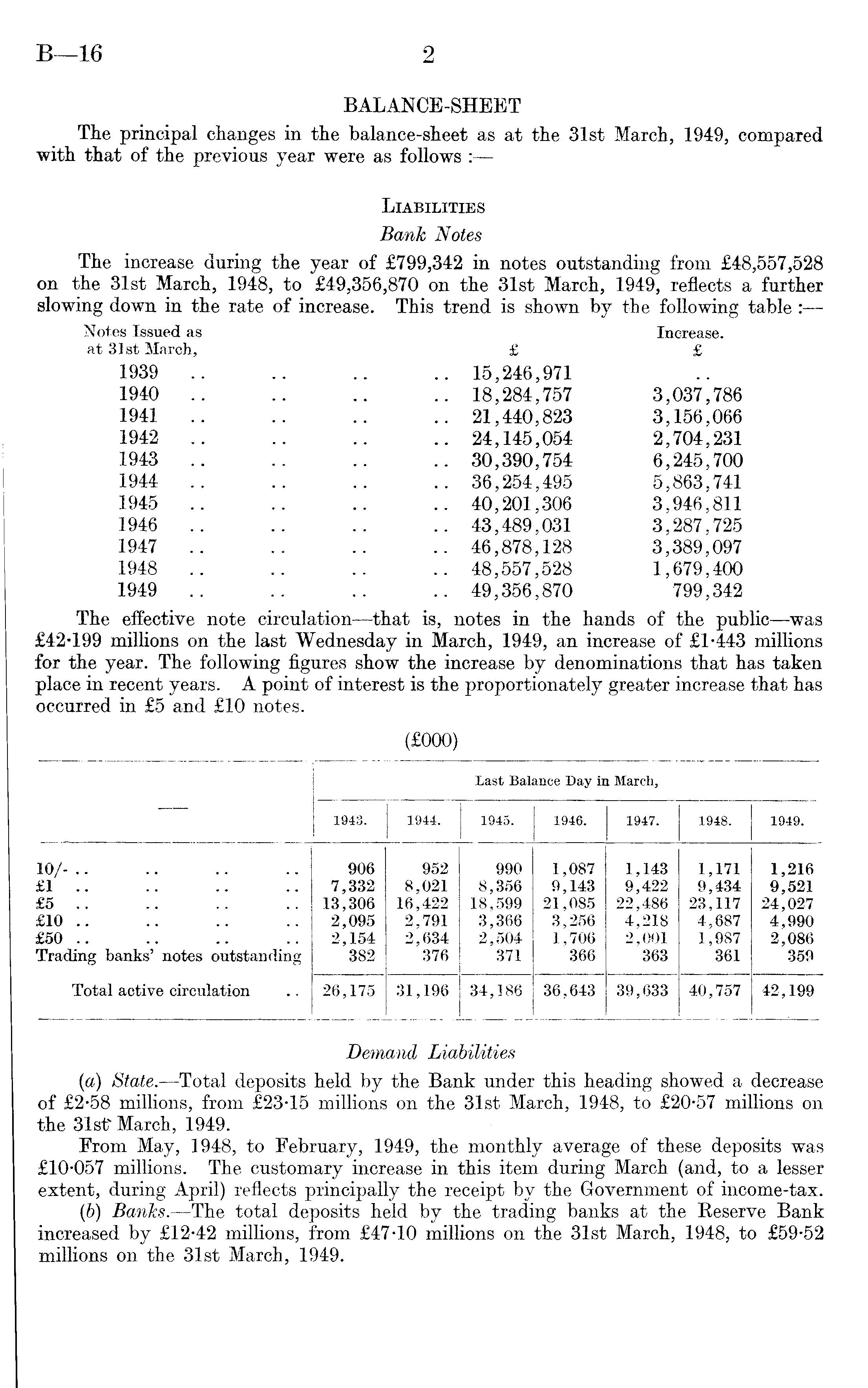 BALANCE-SHEET The principal changes in the balance-sheet as at the 31st March, 1949, compared with that of the previous year were as follows : Liabilities Bank Notes The increase during the year of £799,342 in notes outstanding from £48,557,528 on the 31st March, 1948, to £49,356,870 on the 31st March, 1949, reflects a further slowing down in the rate of increase. This trend is shown by the following table : Notes Issued as Increase, at 31st March, £ £ 1939 .. .. .. .. 15,246,971 1940 .. .. .. .. 18,284,757 3,037,786 1941 .. .. .. .. 21,440,823 3,156,066 1942 .. .. .. .. 24,145,054 2,704,231 1943 .. .. .. .. 30,390,754 6,245,700 1944 .. .. .. .. 36,254,495 5,863,741 1945 .. .. .. .. 40,201,306 3,946,811 1946 .. .. .. .. 43,489,031 3,287,725 1947 .. .. .. .. 46,878,128 3,389,097 1948 .. .. .. .. 48,557,528 1,679,400 1949 .. .. .. .. 49,356,870 799,342 The effective note circulation —that is, notes in the hands of the public—was £42-199 millions on the last Wednesday in March, 1949, an increase of £l-443 millions for the year. The following figures show the increase by denominations that has taken place in recent years. A point of interest is the proportionately greater increase that has occurred in £5 and £lO notes.