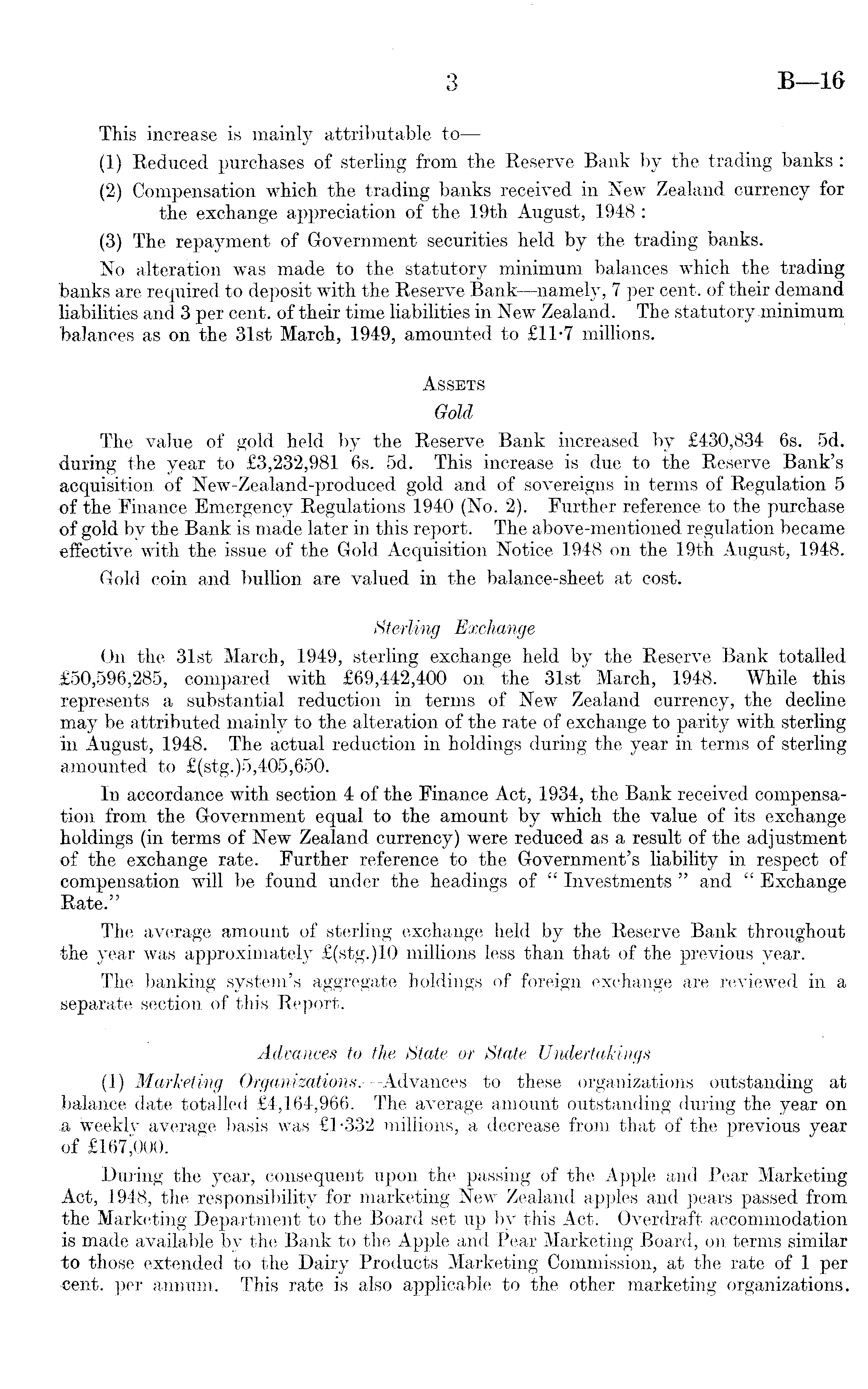 This increase is mainly attributable to — (1) Eeduced purchases of sterling from the Reserve Bank by the trading banks : (2) Compensation which the trading banks received in New Zealand currency for the exchange appreciation of the 19th August, 1948 : (3) The repayment of Government securities held by the trading banks. No alteration was made to the statutory minimum balances which the trading banks are required to deposit with the Reserve Bank —namely, 7 per cent, of their demand liabilities and 3 per cent, of their time liabilities in New Zealand. The statutory minimum balances as on the 31st March, 1949, amounted to £ll-7 millions. Assets Gold The value of gold held by the Reserve Bank increased by £430,834 6s. sd. during the year to £3,232,981 6s. sd. This increase is due to the Reserve Bank's acquisition of New-Zealand-produced gold and of sovereigns in terms of Regulation 5 of the Finance Emergency Regulations 1940 (No. 2). Further reference to the purchase of gold by the Bank is made later in this report. The above-mentioned regulation became effective with the issue of the Gold Acquisition Notice 1948 on the 19th August, 1948. Gold coin and bullion are valued in the balance-sheet at cost. Sterling Exchange On the 31st March, 1949, sterling exchange held by the Reserve Bank totalled £50,596,285, compared with £69,442,400 on the 31st March, 1948. While this represents a substantial reduction in terms of New Zealand currency, the decline may be attributed mainly to the alteration of the rate of exchange to parity with sterling in August, 1948. The actual reduction in holdings during the year in terms of sterling amounted to £(5tg.)5,405,650. In accordance with section 4 of the Finance Act, 1934, the Bank received compensation from the Government equal to the amount by which the value of its exchange holdings (in terms of New Zealand currency) were reduced as a result of the adjustment of the exchange rate. Further reference to the Government's liability in respect of compensation will be found under the headings of " Investments " and " Exchange Rate." The average amount of sterling exchange held by the Reserve Bank throughout the year was approximately £(stg.)lo millions less than that of the previous year. The banking system's aggregate holdings of foreign exchange are reviewed in a separate section of this Report. Advances to the State or State Undertakings (1) Marketing Organizations. —Advances to these organizations outstanding at balance date totalled £4,164,966. The average amount outstanding during the year on a weekly average basis was £l-332 millions, a decrease from that of the previous year of £167,000. During the year, consequent upon the passing of the Apple and Pear Marketing Act, 1948, the responsibility for marketing New Zealand apples and pears passed from the Marketing Department to the Board set up by this Act. Overdraft accommodation is made available by the Bank to the Apple and Pear Marketing Board, on terms similar to those extended to the Dairy Products Marketing Commission, at the rate of 1 per •cent, per annum. This rate is also applicable to the other marketing organizations.
