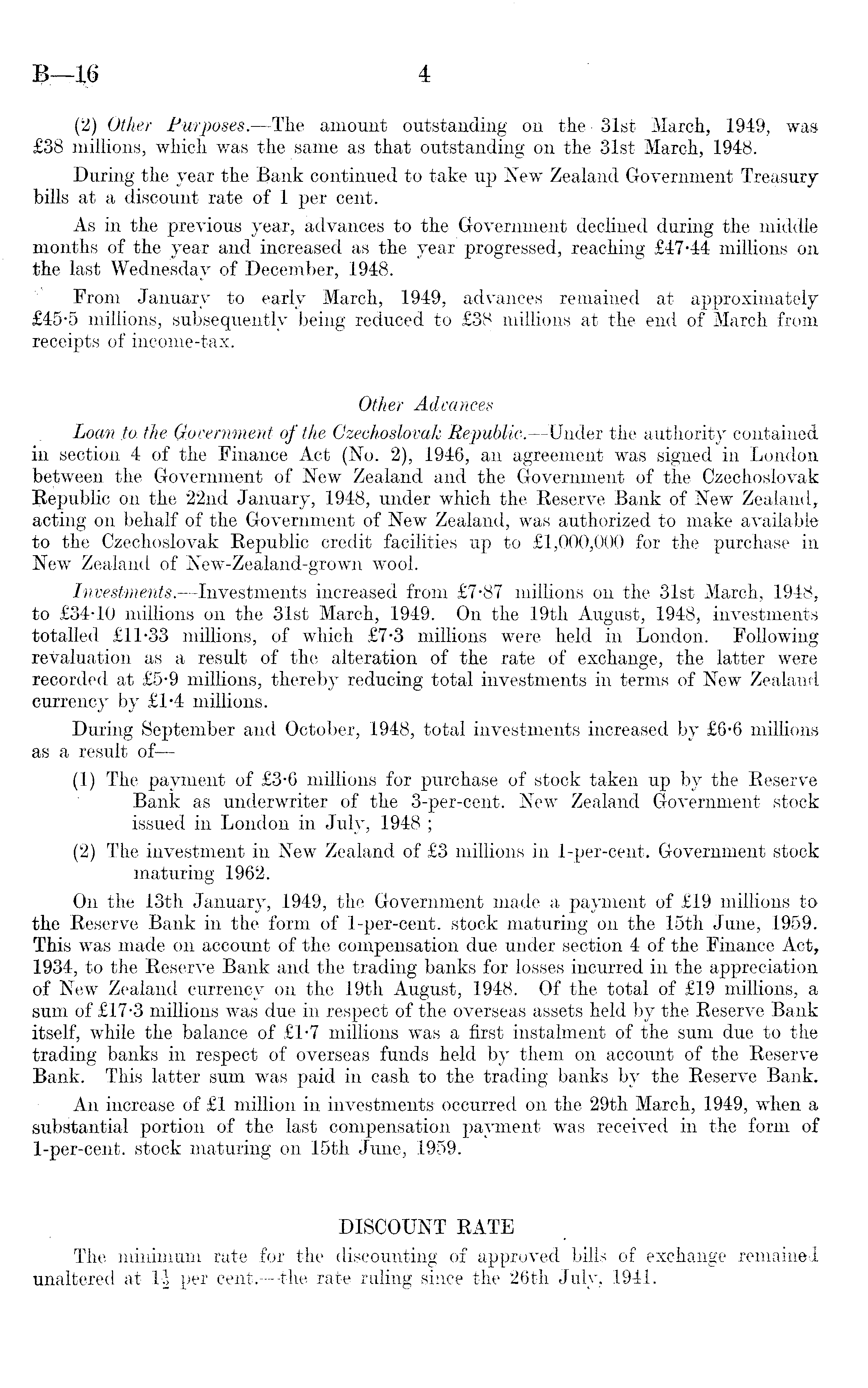 (2) Other Purposes. —The amount outstanding on the -31 st March, 1949, was £3B millions, which was the same as that outstanding on the 31st March, 1948. During the year the Bank continued to take up New Zealand Government Treasury bills at a discount rate of 1 per cent. As in the previous year, advances to the Government declined during the middle months of the year and increased as the year progressed, reaching £47-44 millions on the last Wednesday of December, 1948. From January to early March, 1949, advances remained at approximately £45-5 millions, subsequently being reduced to £3B millions at the end of March from receipts of income-tax. Other Advances Loan to. the Government of the Czechoslovak Republic. —Under the authority contained in section 4 of the Finance Act (No. 2), 1946, an agreement was signed in London between the Government of New Zealand and the Government of the Czechoslovak Republic on the 22nd January, 1948, under which the Reserve Bank of New Zealand, acting on behalf of the Government of New Zealand, was authorized to make available to the Czechoslovak Republic credit facilities up to £1,000,000 for the purchase in New Zealand of New-Zealand-grown wool. Investments. —Investments increased from £7-87 millions on the 31st March, 1948, to £34-10 millions on the 31st March, 1949. On the 19th August, 1948, investments totalled £ll-33 millions, of which £7-3 millions were held in London. Following revaluation as a result of the alteration of the rate of exchange, the latter were recorded at £5-9 millions, thereby reducing total investments in terms of New Zealand currency by £l-4 millions. During September and October, 1948, total investments increased by £6-6 millions as a result of — (1) The payment of £3-6 millions for purchase of stock taken up by the Reserve Bank as underwriter of the 3-per-cent. New Zealand Government stock issued in London in July, 1948 ; (2) The investment in New Zealand of £3 millions in 1-per-cent. Government stock maturing 1962. On the 13th January, 1949, the Government made a payment of £l9 millions to the Reserve Bank in the form of 1-per-cent. stock maturing on the 15th June, 1959. This was made on account of the compensation due under section 4 of the Finance Act, 1934, to the Reserve Bank and the trading banks for losses incurred in the appreciation of New Zealand currency on the 19th August, 1948. Of the total of £l9 millions, a sum of £l7-3 millions was due in respect of the overseas assets held by the Reserve Bank itself, while the balance of £l-7 millions was a first instalment of the sum due to the trading banks in respect of overseas funds held by them on account of the Reserve Bank. This latter sum was paid in cash to the trading banks by the Reserve Bank. An increase of £1 million in investments occurred on the 29th March, 1949, when a substantial portion of the last compensation payment was received in the form of 1-per-cent. stock maturing on 15th June, 1959. DISCOUNT RATE The minimum rate for the discounting of approved bills of exchange remained unaltered at 1| per cent. —the rate ruling since the 26th July, 1941.