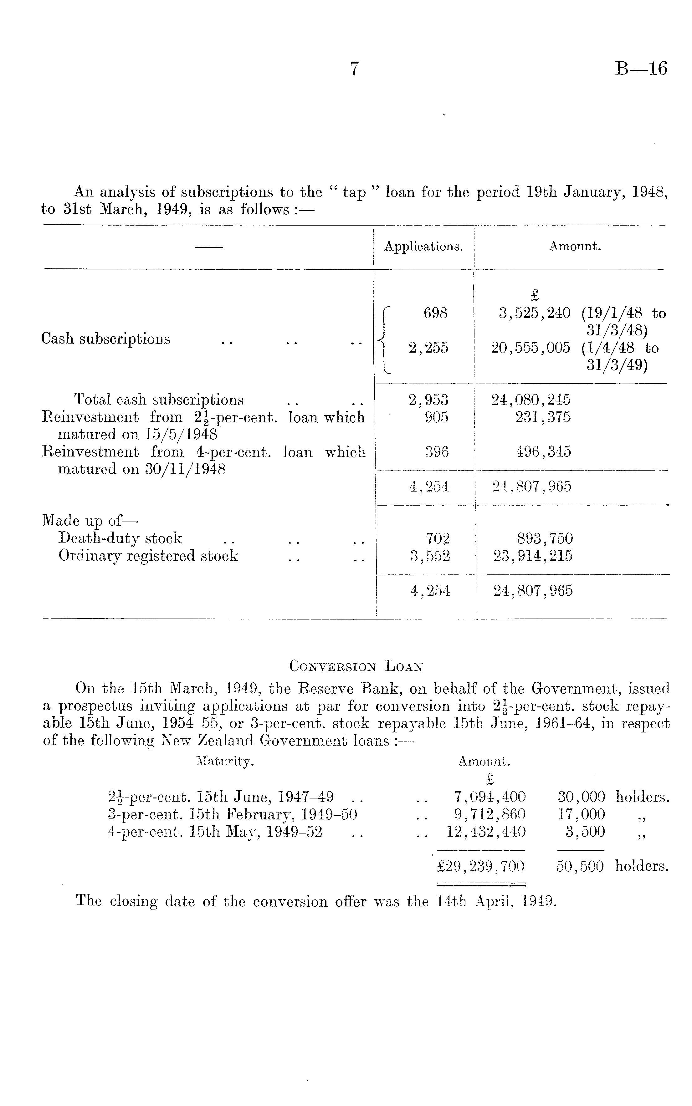 Conversion Loan On the 15th March, 1949, the Reserve Bank, on behalf of the Government, issued a prospectus inviting applications at par for conversion into 2-|-per-cent. stock repayable 15th June, 1954-55, or 3-per-cent. stock repayable 15th June, 1961-64, in respect of the following New Zealand Government loans : Maturity. Amount. £ 2fper-cent. 15th June, 1947-49 .. .. 7,094,400 30,000 holders. 3-per-cent. 15th February, 1949-50 .. 9,712,860 17,000 4-per-cent. 15th May, 1949-52 .. .. 12,432,440 3,500 '£29,239,700 50,500 holders. The closing date of the conversion offer was the 14th April, 1949.
