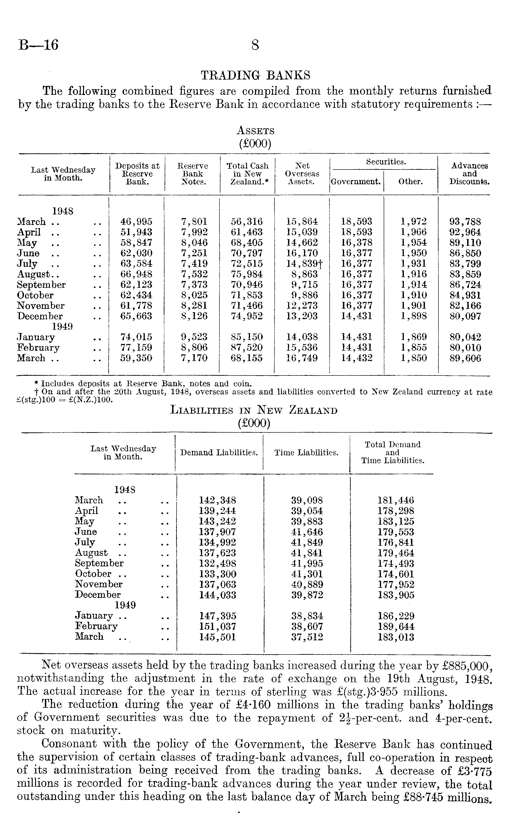 Net overseas assets held by the trading banks increased during the year by £885,000, notwithstanding the adjustment in the rate of exchange on the 19th August, 1948. The actual increase for the year in terms of sterling was £(stg.)3-955 millions. The reduction during the year of £4-160 millions in the trading banks' holdings of Government securities was due to the repayment of 2|-per-cent. and 4-per-cent. stock on maturity. Consonant with the policy of the Government, the Reserve Bank has continued the supervision of certain classes of trading-bank advances, full co-operation in respeot of its administration being received from the trading banks. A decrease of £3-775 millions is recorded for trading-bank advances during the year under review, the total outstanding under this heading on the last balance day of March being £BB-745 millions.