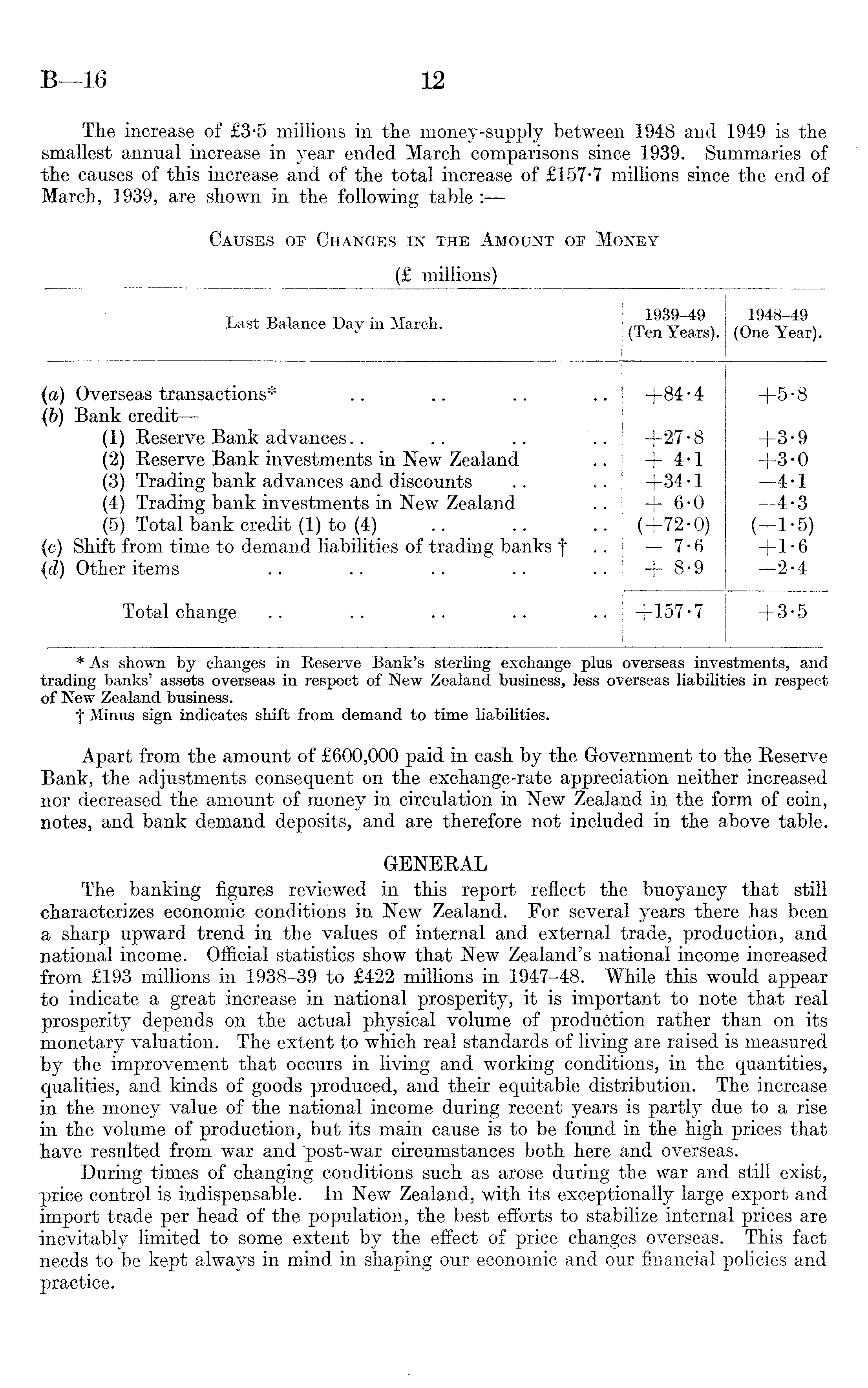 *As shown by changes in Reserve Bank's sterling exchange plus overseas investments, and trading banks' assets overseas in respect of New Zealand business, less overseas liabilities in respect of New Zealand business. f Minus sign indicates shift from demand to time liabilities. Apart from the amount of £600,000 paid in cash by the Government to the Keserve Bank, the adjustments consequent on the exchange-rate appreciation neither increased nor decreased the amount of money in circulation in New Zealand in the form of coin, notes, and bank demand deposits, and are therefore not included in the above table. GENERAL The banking figures reviewed in this report reflect the buoyancy that still characterizes economic conditions in New Zealand. For several years there has been a sharp upward trend in the values of internal and external trade, production, and national income. Official statistics show that New Zealand's national income increased from £193 millions in 1938-39 to £422 millions in 1947-48. While this would appear to indicate a great increase in national prosperity, it is important to note that real prosperity depends on the actual physical volume of production rather than on its monetary valuation. The extent to which real standards of living are raised is measured by the improvement that occurs in living and working conditions, in the quantities, qualities, and kinds of goods produced, and their equitable distribution. The increase in the money value of the national income during recent years is partly due to a rise in the volume of production, but its main cause is to be found in the high prices that have resulted from war and post-war circumstances both here and overseas. During times of changing conditions such as arose during the war and still exist, price control is indispensable. In New Zealand, with its exceptionally large export and import trade per head of the population, the best efforts to stabilize internal prices are inevitably limited to some extent by the effect of price changes overseas. This fact needs to be kept always in mind in shaping our economic and our financial policies and practice.