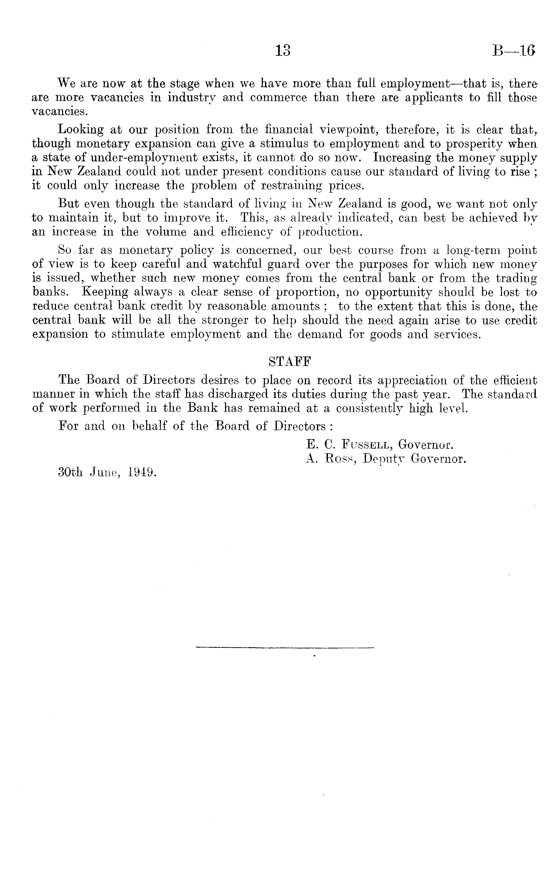 We are now at the stage when we have more than full employment —that is, there are more vacancies in industry and commerce than there are applicants to fill those vacancies. Looking at our position from the financial viewpoint, therefore, it is clear that r though monetary expansion can give a stimulus to employment and to prosperity when a state of under-employment exists, it cannot do so now. Increasing the money supply in New Zealand could not under present conditions cause our standard of living to rise ; it could only increase the problem of restraining prices. But even though the standard of living in New Zealand is good, we want not only to maintain it, but to improve it. This, as already indicated, can best be achieved by an increase in the volume and efficiency of production. So far as monetary policy is concerned, our best course from a long-term point of view is to keep careful and watchful guard over the purposes for which new money is issued, whether such new money comes from the central bank or from the trading banks. Keeping always a clear sense of proportion, no opportunity should be lost to reduce central bank credit by reasonable amounts ; to the extent that this is done, the central bank will be all the stronger to help should the need again arise to use credit expansion to stimulate employment and the demand for goods and services. STAFF The Board of Directors desires to place on record its appreciation of the efficient manner in which the staff has discharged its duties during the past year. The standard of work performed in the Bank has remained at a consistently high level. For and on behalf of the Board of Directors : B. C. Fussell, Governor. A. Boss, Deputy Governor. 30th June, 1949.