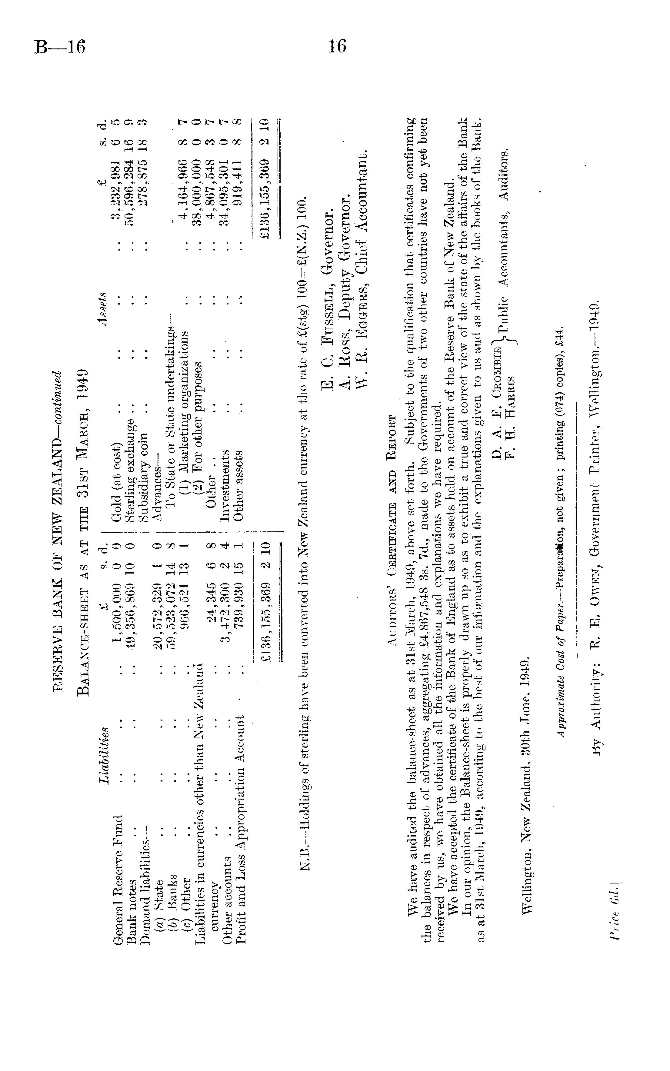 N.B.—Holdings of sterling have been converted into New Zealand currency at the rate of £(stg) 100=£(N.Z.) 100. E. C. Fussell, Governor. A. Eoss, Deputy Governor. W. E. Eggers, Chief Accountant. Auditors' Certificate and Report We have audited the balance-sheet as at 31st March, 1949, above set forth. Subject to the qualification that certificates confirming the balances in respect of advances, aggregating £4,867,548 3s. 7d., made to the Governments of two other countries have not yet been received by us, we have obtained all the information and explanations we have required. We have accepted the certificate of the Bank of England as to assets held on account of the Reserve Bank of New Zealand. In our opinion, the Balance-sheet is properly drawn up so as to exhibit a true and correct view of the state of the affairs of the Bank as at 31st March, 1949, according to the best of our information and the explanations given to us and as shown by the books of the Bank. F* H HARM° MBIE } Public Accountants > Auditors. Wellington, New Zealand, 30th June, 1949. Approximate Cost of Paper. — Preparation, not given; printing (074) copies), £44.