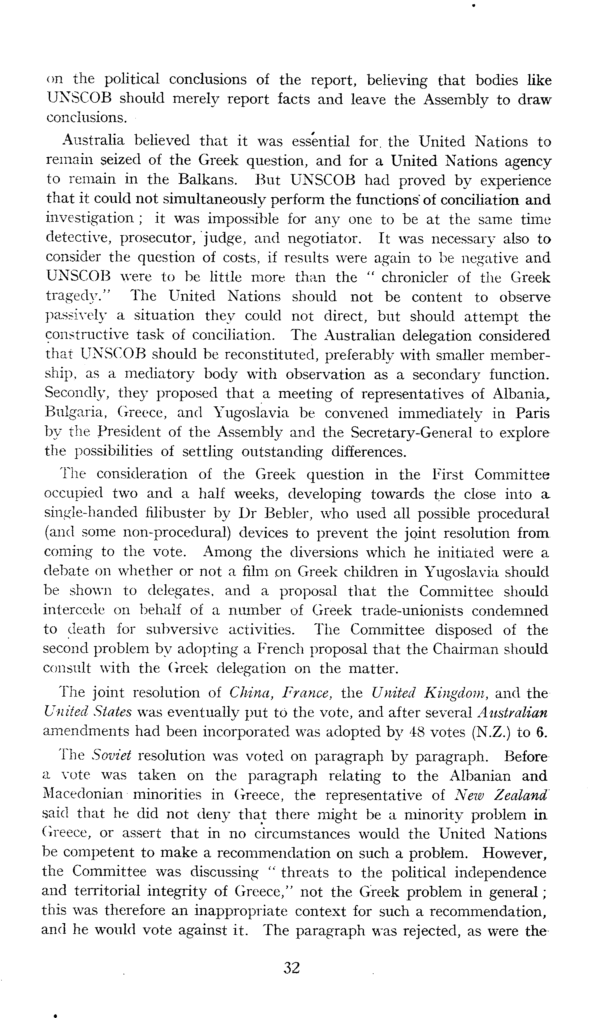 on the political conclusions of the report, believing that bodies like UNSCOB should merely report facts and leave the Assembly to draw conclusions. Australia believed that it was essential for. the United Nations to remain seized of the Greek question, and for a United Nations agency to remain in the Balkans. But UNSCOB had proved by experience that it could not simultaneously perform the functions' of conciliation and investigation ; it was impossible for any one to be at the same time detective, prosecutor, judge, and negotiator. It was necessary also to consider the question of costs, if results were again to be negative and UNSCOB were to be little more than the " chronicler of the Greek tragedy." The United Nations should not be content to observe passively a situation they could not direct, but should attempt the constructive task of conciliation. The Australian delegation considered that UNSCOB should be reconstituted, preferably with smaller membership, as a mediatory body with observation as a secondary function. Secondly, they proposed that a meeting of representatives of Albania, Bulgaria, Greece, and Yugoslavia be convened immediately in Paris by the President of the Assembly and the Secretary-General to explore the possibilities of settling outstanding differences. The consideration of the Greek question in the First Committee occupied two and a half weeks, developing towards the close into a single-handed filibuster by Dr Bebler, who used all possible procedural (and some non-procedural) devices to prevent the joint resolution from coming to the vote. Among the diversions which he initiated were a debate on whether or not a film on Greek children in Yugoslavia should be shown to delegates, and a proposal that the Committee should intercede on behalf of a number of Greek trade-unionists condemned to death for subversive activities. The Committee disposed of the second problem by adopting a French proposal that the Chairman should consult with the Greek delegation on the matter. The joint resolution of China, France, the United Kingdom, and the United States was eventually put to the vote, and after several Australian amendments had been incorporated was adopted by 48 votes (N.Z.) to 6. The Soviet resolution was voted on paragraph by paragraph. Before a vote was taken on the paragraph relating to the Albanian and Macedonian minorities in Greece, the representative of New Zealand said that he did not deny that there might be a minority problem in Greece, or assert that in no circumstances would the United Nations be competent to make a recommendation on such a problem. However, the Committee was discussing " threats to the political independence and territorial integrity of Greece," not the Greek problem in general; this was therefore an inappropriate context for such a recommendation, and he would vote against it. The paragraph was rejected, as were the