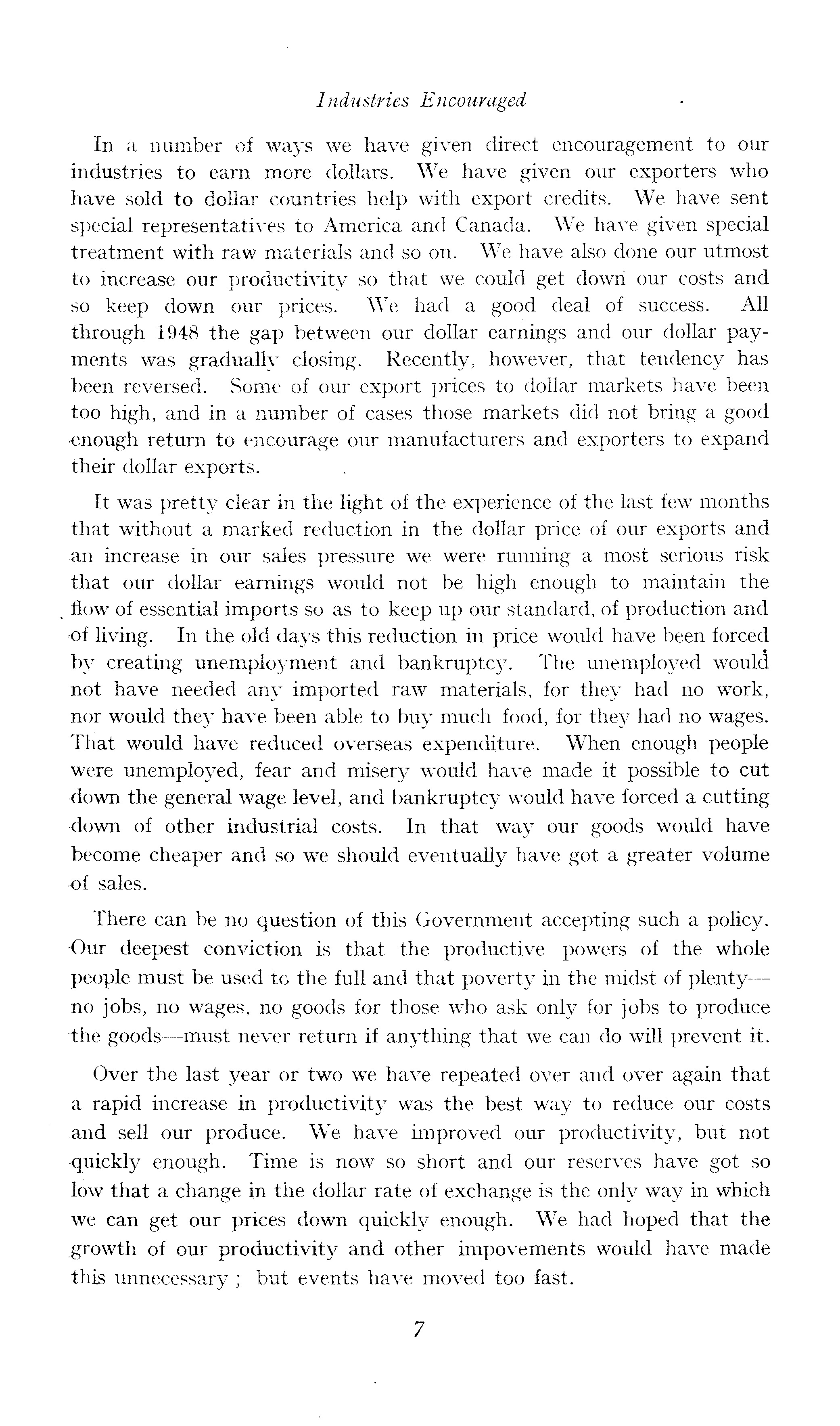 Industries Encouraged In a number of ways we have given direct encouragement to our industries to earn more dollars. We have given our exporters who have sold to dollar countries help with export credits. We have sent special representatives to America and Canada. We have given special treatment with raw materials and so on. We have also done our utmost to increase our productivity so that we could get dowri our costs and so keep down our prices. We had a good deal of success. All through 1948 the gap between our dollar earnings and our dollar payments was gradually closing. Recently, however, that tendency has been reversed. Some of our export prices to dollar markets have been too high, and in a number of cases those markets did not bring a good enough return to encourage our manufacturers and exporters to expand their dollar exports. It was pretty clear in the light of the experience of the last few months that without a marked reduction in the dollar price of our exports and an increase in our sales pressure we were running a most serious risk that our dollar earnings would not be high enough to maintain the flow of essential imports so as to keep up our standard, of production and -of living. In the old days this reduction in price would have been forced by creating unemployment and bankruptcy. The unemployed would not have needed any imported raw materials, for they had no work, nor would they have been able to buy much food, for they had no wages. That would have reduced overseas expenditure. When enough people were unemployed, fear and misery would have made it possible to cut -down the general wage level, and bankruptcy would have forced a cutting down of other industrial costs. In that way our goods would have become cheaper and so we should eventually have got a greater volume •of sales. There can be no question of this Government accepting such a policy. ■Our deepest conviction is that the productive powers of the whole people must be used to the full and that poverty in the midst of plentyno jobs, no wages, no goods for those who ask only for jobs to produce the goods—must never return if anything that we can do will prevent it. Over the last year or two we have repeated over and over again that a rapid increase in productivity was the best way to reduce our costs and sell our produce. We have improved our productivity, but not •quickly enough. Time is now so short and our reserves have got so low that a change in the dollar rate of exchange is the only way in which we can get our prices down quickly enough. We had hoped that the growth of our productivity and other impovements would have made this unnecessary ; but events have moved too fast.