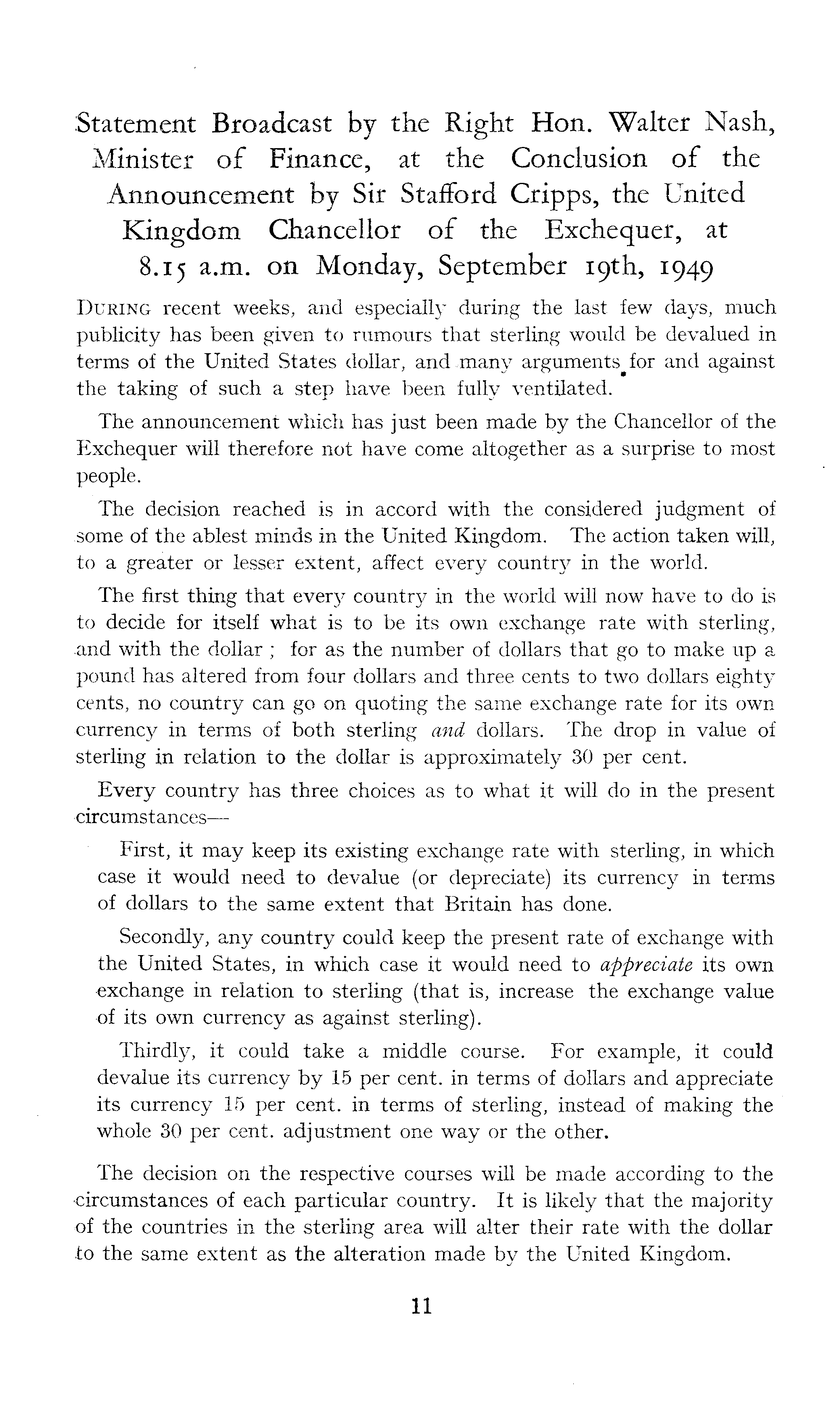Statement Broadcast by the Right Hon. Walter Nash, Minister of Finance, at the Conclusion of the Announcement by Sir Stafford Cripps, the United Kingdom Chancellor of the Exchequer, at 8.15 a.m. on Monday, September 19th, 1949 During recent weeks, and especially during the last few days, much publicity has been given to rumours that sterling would be devalued in terms of the United States dollar, and .many argumentfor and against the taking of such a step have been fully ventilated. The announcement which has just been made by the Chancellor of the Exchequer will therefore not have come altogether as a surprise to most people. The decision reached is in accord with the considered judgment of some of the. ablest minds in the United Kingdom. The action taken will, to a greater or lesser extent, affect every country in the world. The first thing that every country in the world will now have to do is to decide for itself what is to be its own exchange rate with sterling, and with the dollar ; for as the number of dollars that go to make up a pound has altered from four dollars and three cents to two dollars eighty cents, no country can go on quoting the same exchange rate for its own •currency in terms of both sterling and dollars. The drop in value of sterling in relation to the dollar is approximately 30 per cent. Every country has three choices as to what it will do in the present ■circumstancesFirst, it may keep its existing exchange rate with sterling, in which case it would need to devalue (or depreciate) its currency in ter-ms of dollars to the same extent that Britain has done. Secondly, any country could keep the present rate of exchange with the United States, in which case it would need to appreciate its own exchange in relation to sterling (that is, increase the exchange value of its own currency as against sterling). Thirdly, it could take a middle course. For example, it could devalue its currency by 15 per cent, in terms of dollars and appreciate its currency 15 per cent, in terms of sterling, instead of making the whole 30 per cent, adjustment one way or the other. The decision on the respective courses will be made according to the •circumstances of each particular country. It is likely that the majority •of the countries in the sterling area will alter their rate with the dollar to the same extent as the alteration made by the United Kingdom.
