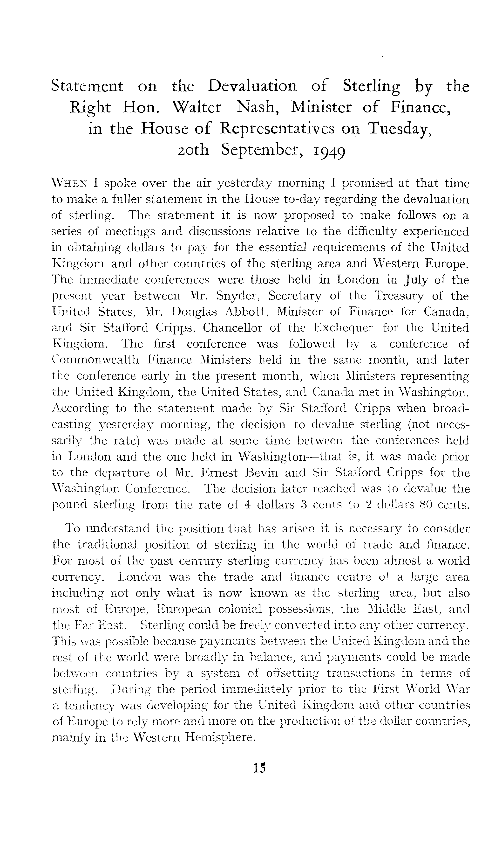 Statement on the Devaluation of Sterling by the Right Hon. Walter Nash, Minister of Finance, in the House of Representatives on Tuesday, 20th September, 1949 When I spoke over the air yesterday morning I promised at that time to make a fuller statement in the House to-day regarding the devaluation of sterling. The statement it is now proposed to make follows on a series of meetings and discussions relative to the difficulty experienced in obtaining dollars to pay for the essential requirements of the United Kingdom and other countries of the sterling area and Western Europe. The immediate conferences were those held in London in July of the present year between Mr. Snyder, Secretary of the Treasury of the United States, Mr. Douglas Abbott, Minister of Finance for Canada, and Sir Stafford Cripps, Chancellor of the Exchequer for the United Kingdom. The first conference was followed by a conference of Commonwealth Finance Ministers held in the same month, and later the conference early in the present month, when Ministers representing the United Kingdom, the United States, and Canada met in Washington. According to the statement made by Sir Stafford Cripps when broadcasting yesterday morning, the decision to devalue sterling (not necessarily the rate) was made at some time between the conferences held in London and the one held in Washington—that is, it was made prior to the departure of Mr. Ernest Bevin and Sir Stafford Cripps for the Washington Conference. The decision later reached was to devalue the pound sterling from the rate of 4 dollars 3 cents to 2 dollars 80 cents. To understand the position that has arisen it is necessary to consider the traditional position of sterling in the world of trade and finance. For most of the past century sterling currency has been almost a world currency. London was the trade and finance centre of a large area including not only what is now known as the sterling area, but also most of Europe, European colonial possessions, the Middle East, and the Far East. Sterling could be freely converted into any other currency. This was possible because payments between the United Kingdom and the rest of the world were broadly in balance, and payments could be made between countries by a system of offsetting transactions in terms of sterling. During the period immediately prior to the First World War a tendency was developing for the United Kingdom and other countries of Europe to rely more and more on the production of the dollar countries, mainly in the Western Hemisphere.