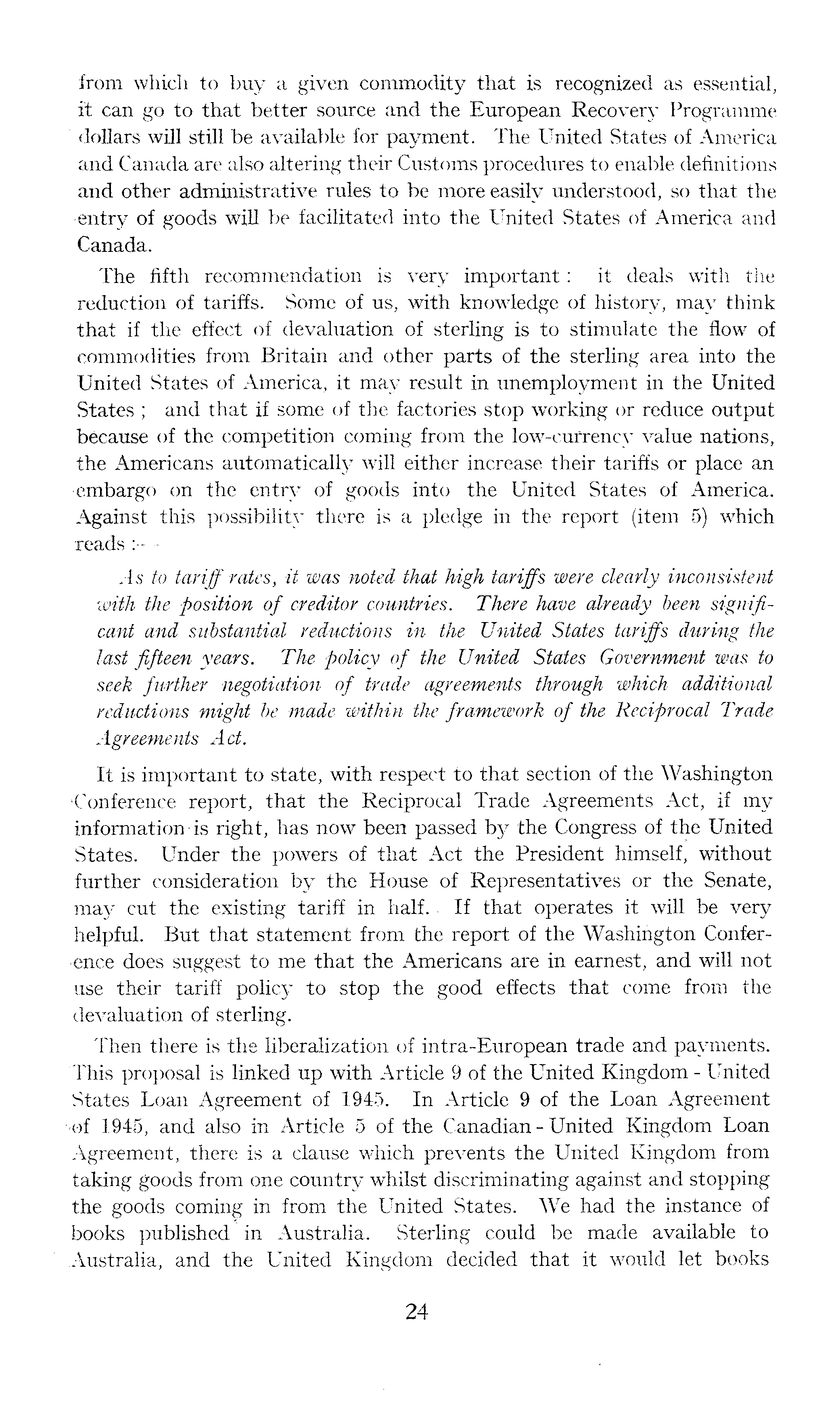 from which to buy a given commodity that is recognized as essential, it can go to that better source and the European Recovery Programme dollars will still be available for payment. The United States of America and Canada are also altering their Customs procedures to enable definitions and other administrative rules to be more easily understood, so that the •entry of goods will be facilitated into the United States of America and Canada. The fifth recommendation is very important: it deals with the reduction of tariffs. Some of us, with knowledge of history, may think that if the effect of devaluation of sterling is to stimulate the flow of •commodities from Britain and other parts of the sterling area into the United States of America, it may result in unemployment in the United States ; and that if some of the factories stop working or reduce output because of the competition coming from the low-currency value nations, the Americans automatically will either increase their tariffs or place an ■embargo on the entry of goods into the United States of America. Against this possibility there is a pledge in the report (item 5) which reads : .4 s to tariff rates, it was noted that high tariffs were clearly inconsistent with the position of creditor countries. There have already been significant and substantial reductions in the United States tariffs during the last fifteen years. The policy of the United States Government was to seek further negotiation of trade agreements through which additional reductions might be made within the framework of the Reciprocal Trade Agreements Act. It is important to state, with respect to that section of the Washington Conference report, that the Reciprocal Trade Agreements Act, if my information-is right, has now been passed by the Congress of the United States. Under the powers of that Act the President himself, without further consideration by the House of Representatives or the Senate, may cut the existing tariff in half. If that operates it will be very helpful. But that statement from the report of the Washington Conference does suggest to me that the Americans are in earnest, and will not use their tariff policy to stop the good effects that come from the devaluation of sterling. Then there is the liberalization of intra-European trade and payments. This proposal is linked up with Article 9 of the United Kingdom - United States Loan Agreement of 1945. In Article 9of the Loan Agreement •of 1945, and also in Article 5 of the Canadian - United Kingdom Loan Agreement, there is a clause which prevents the United Kingdom from taking goods from one country whilst discriminating against and stopping the goods coming in from the United States. We had the instance- of books published in Australia. Sterling could be made available to Australia, and the United Kingdom decided that it would let books