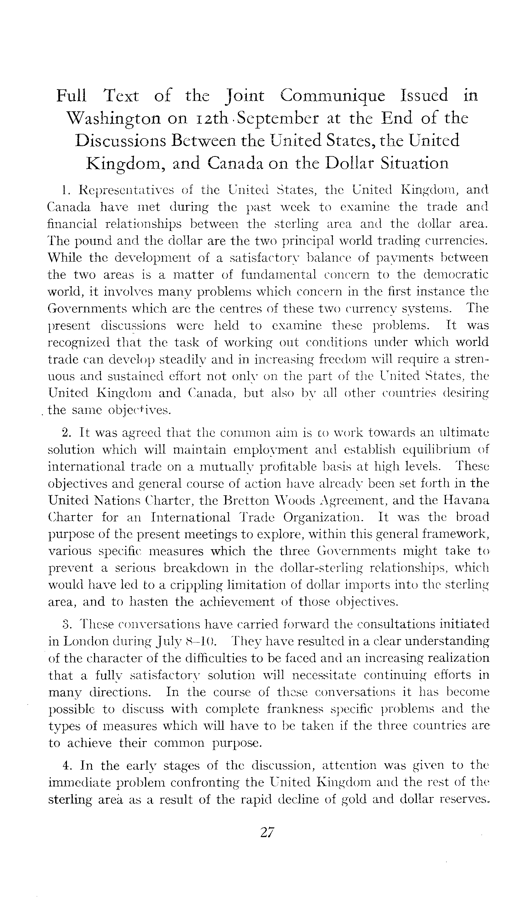 Full Text of the Joint Communique Issued in Washington on 12th September at the End of the Discussions Between the United States, the United Kingdom, and Canada on the Dollar Situation 1. Representatives of the United States, the United Kingdom, and Canada have met during the past week to examine the trade and financial relationships between the sterling area and the dollar area. The pound and the dollar are the two principal world trading currencies. While the development of a satisfactory balance of payments between the two areas is a matter of fundamental concern to the democratic world, it involves many problems which concern in the first instance the Governments which are the centres of these two currency systems. The present discussions were held to examine these problems. It was recognized that the task of working out conditions under which world trade can develop steadily and in increasing freedom will require a strenuous and sustained effort not only on the part of the United States, the United Kingdom and Canada, but also by all other countries desiring the same objectives. 2. It was agreed that the common aim is co work towards an ultimate solution which will maintain employment and establish equilibrium of international trade on a mutually profitable basis at high levels. These objectives and general course of action have already been set forth in the United Nations Charter, the Bretton Woods Agreement, and the Havana Charter for an International Trade Organization. It was the broad purpose of the present meetings to explore, within this general framework, various specific measures which the three Governments might take to prevent a serious breakdown in the dollar-sterling relationships, which would have led to a crippling limitation of dollar imports into the sterling area, and to hasten the achievement of those objectives. 3. These conversations have carried forward the consultations initiated in London during July 8-10. They have resulted in a clear understanding of the character of the difficulties to be faced and an increasing realization that a fully satisfactory solution will necessitate continuing efforts in many directions. In the course of these conversations it has become possible to discuss with complete frankness specific problems and the types of measures which will have to be taken if the three countries are to achieve their common purpose. 4. In the early stages of the discussion, attention was given to the immediate problem confronting the United Kingdom and the rest of the sterling area as a result of the rapid decline of gold and dollar reserves.